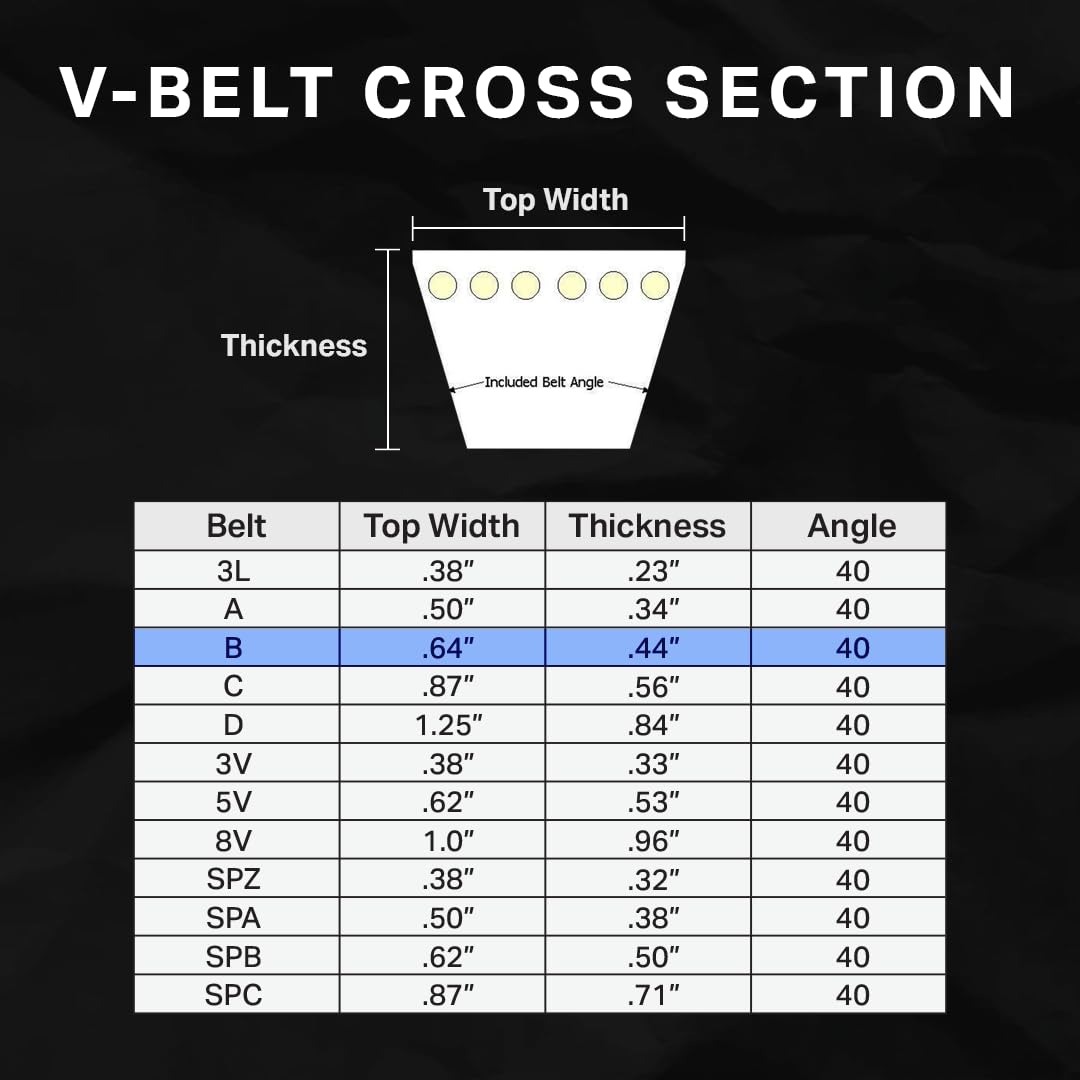 The BESTORQ B158 v-belt has a 161" outside circumference, 158" inside circumference, .66" width, and a .43" height; See images for cross section schematic