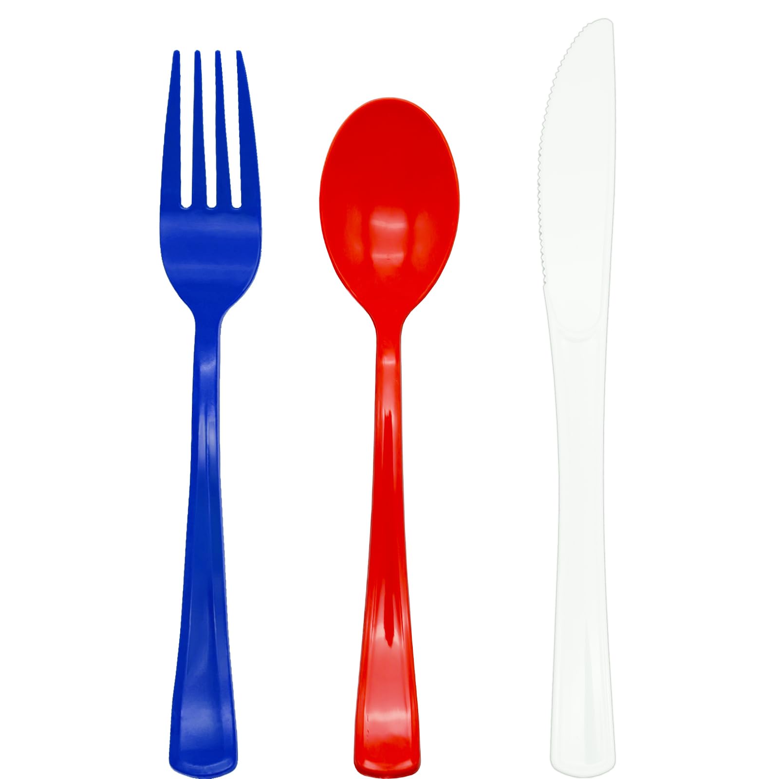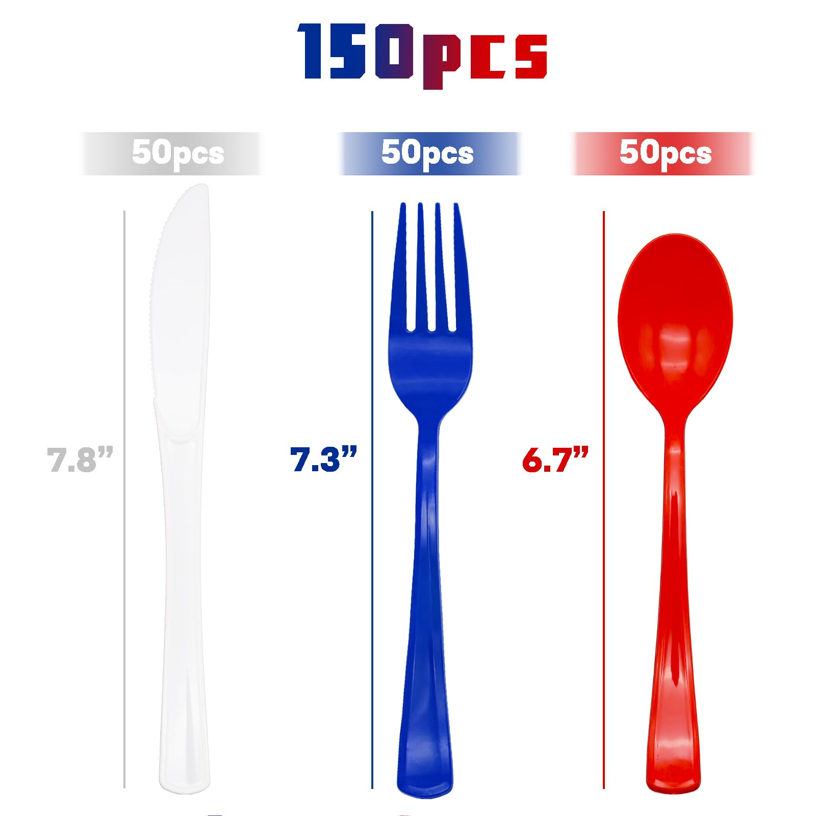 【Sufficient Quantity】 :This red white and blue plastic silverware includes 50 red plastic spoons, 50 blue plastic forks and 50 white plastic Knives, a total of 150 plastic silverware, serving 50 guests, perfect for the party needs. The quantity is sufficient to ensure that every guest can enjoy the food.