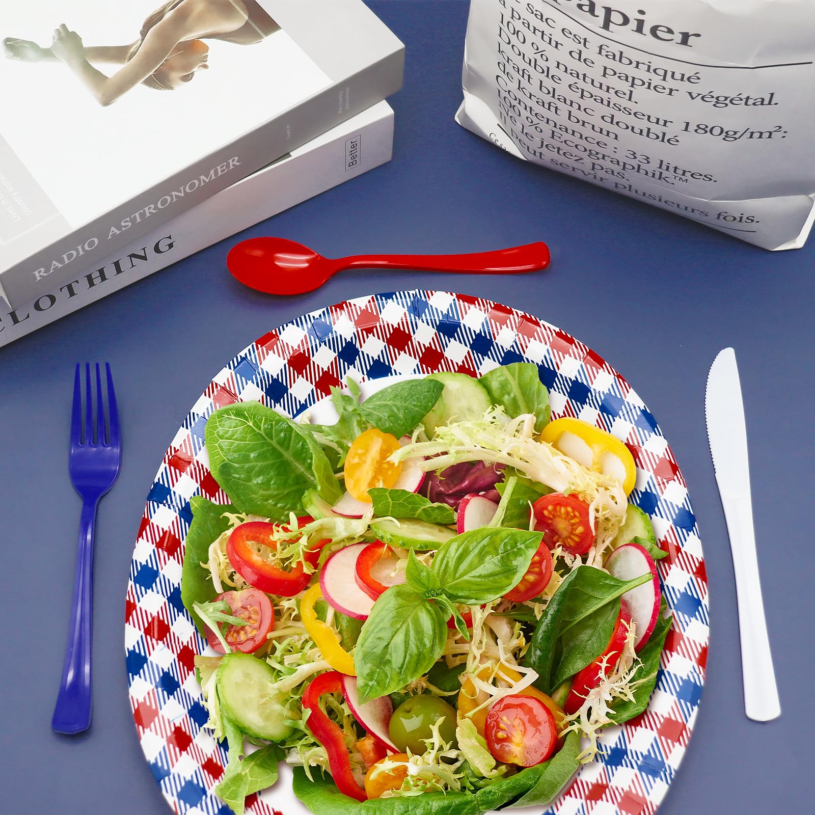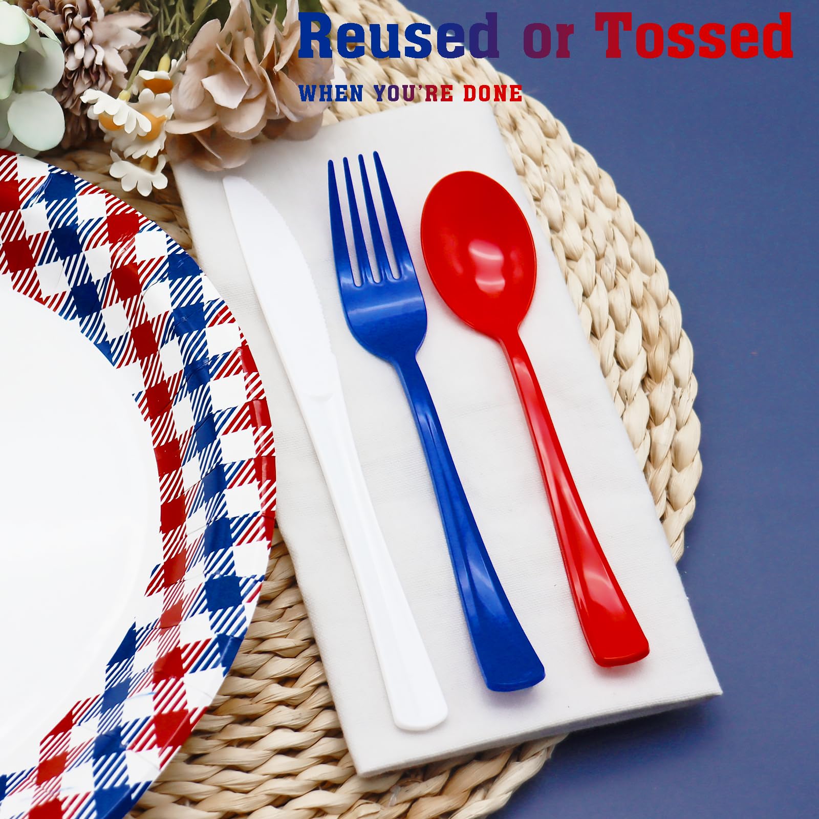 【Rich Color Combination】:The red white and blue plastic silverware features the classic colors of red, blue, and white that represent the American flag, perfectly suited to the Independence Day holiday spirit.Not only practical but also decorative, add beauty to your table and create a festive feeling for 4th of July party.