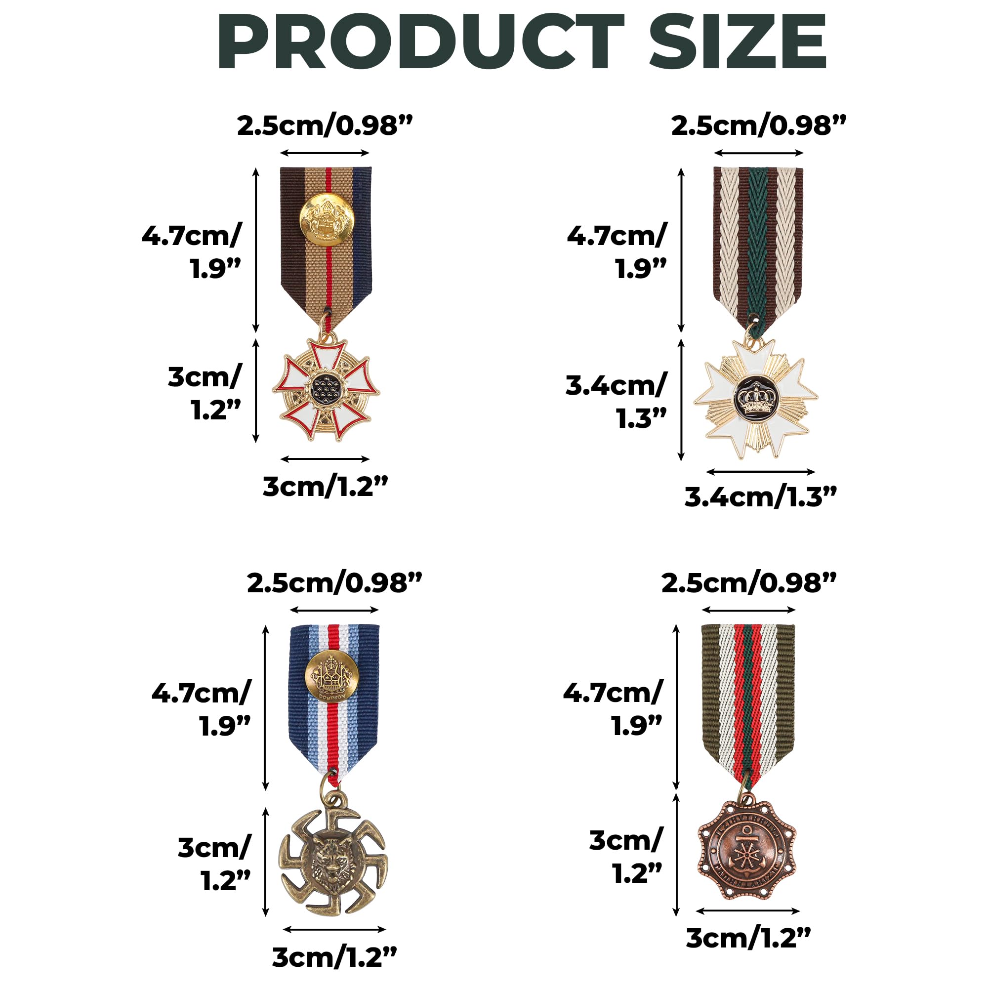 Package & Size: The package includes 4 pcs of metal ribbon medals in 4 styles. SIZE: 1inch x 1.2inches. Please check the size before buying! They are not big.