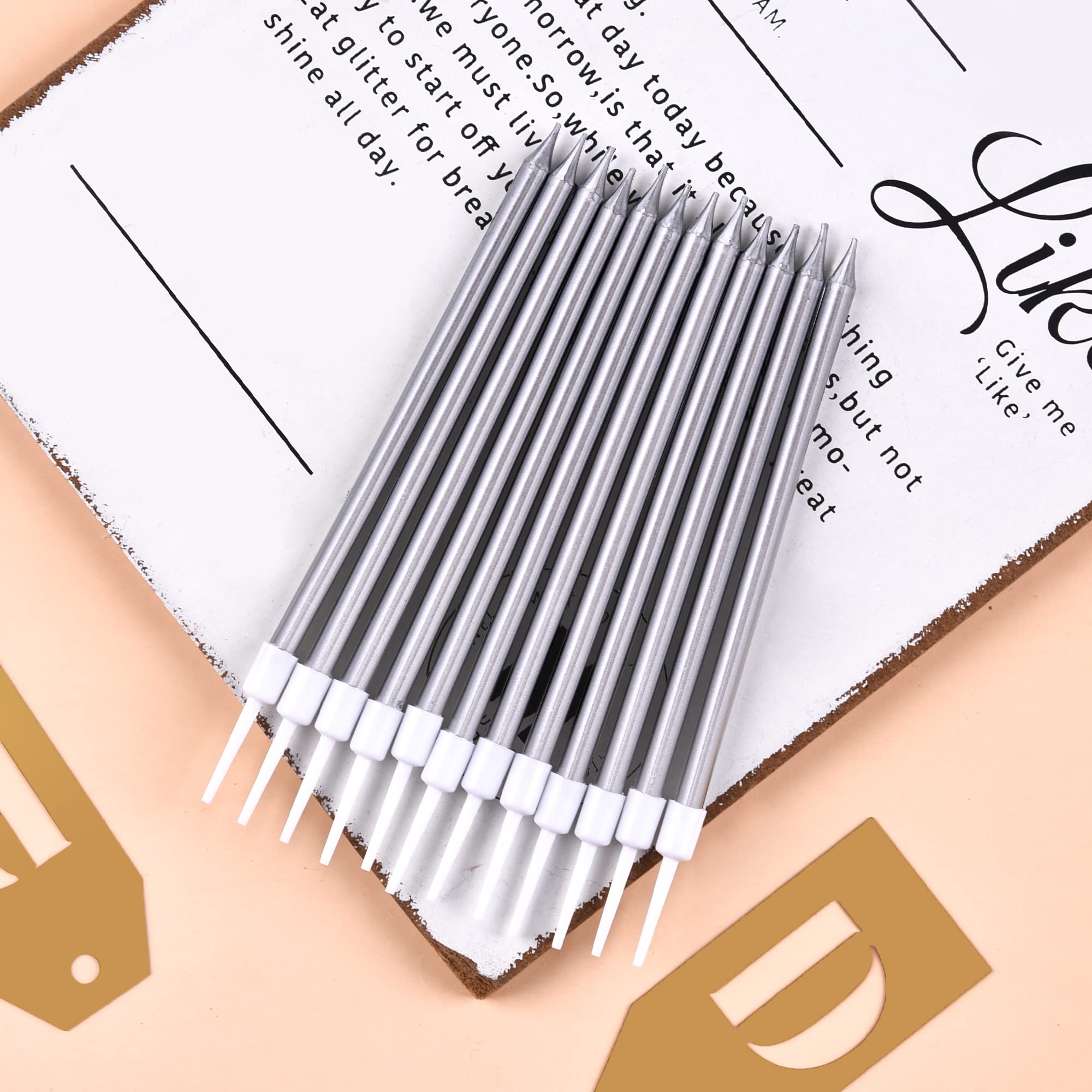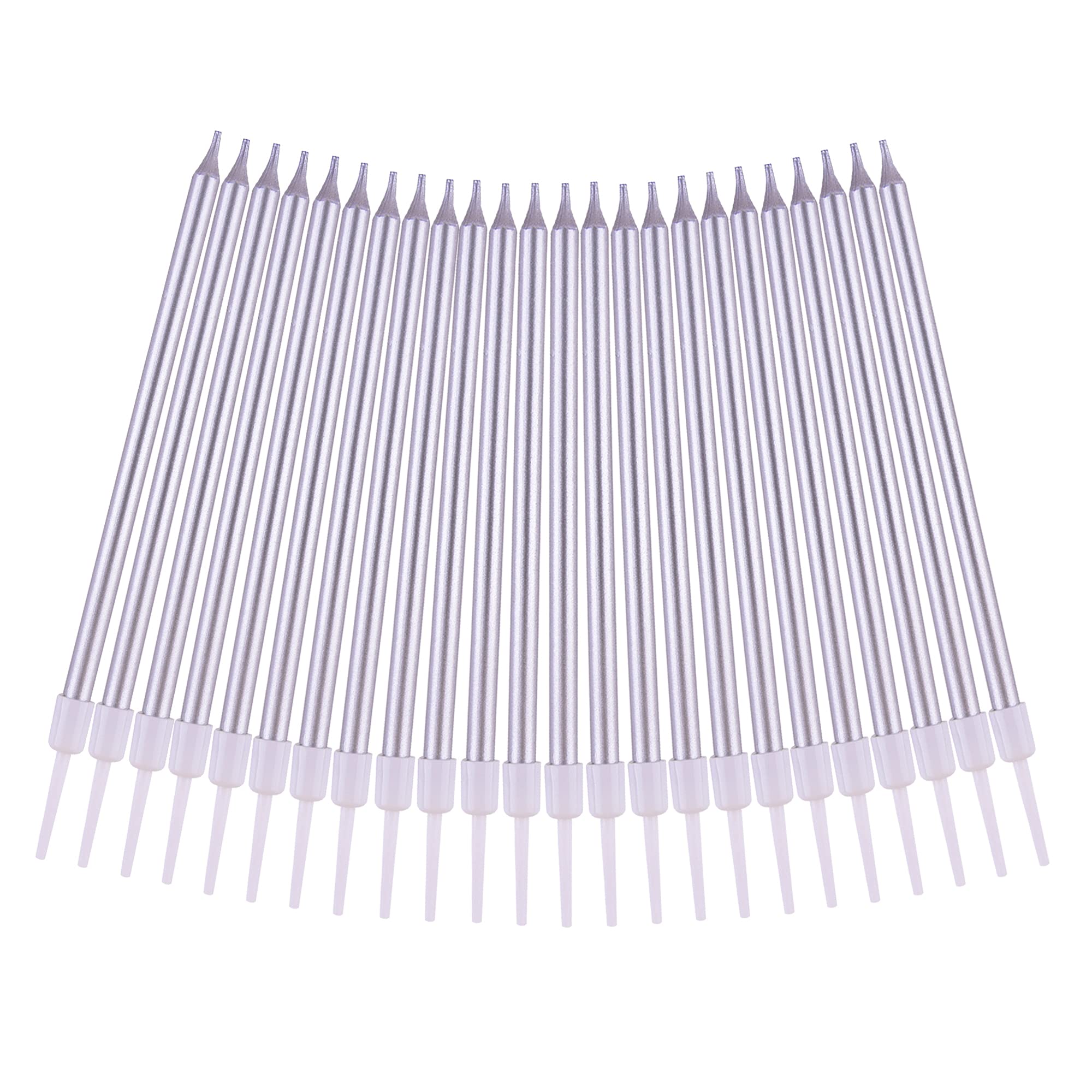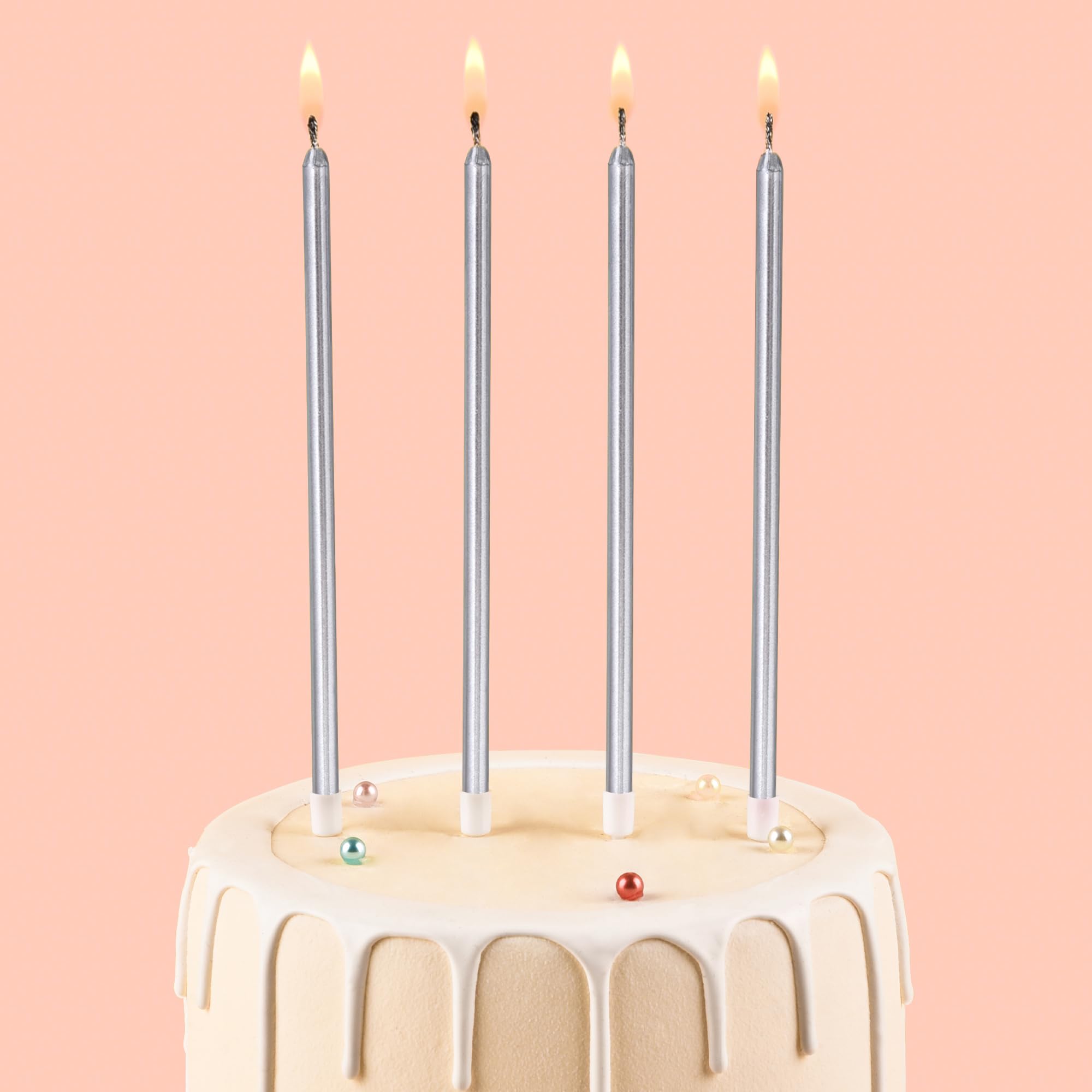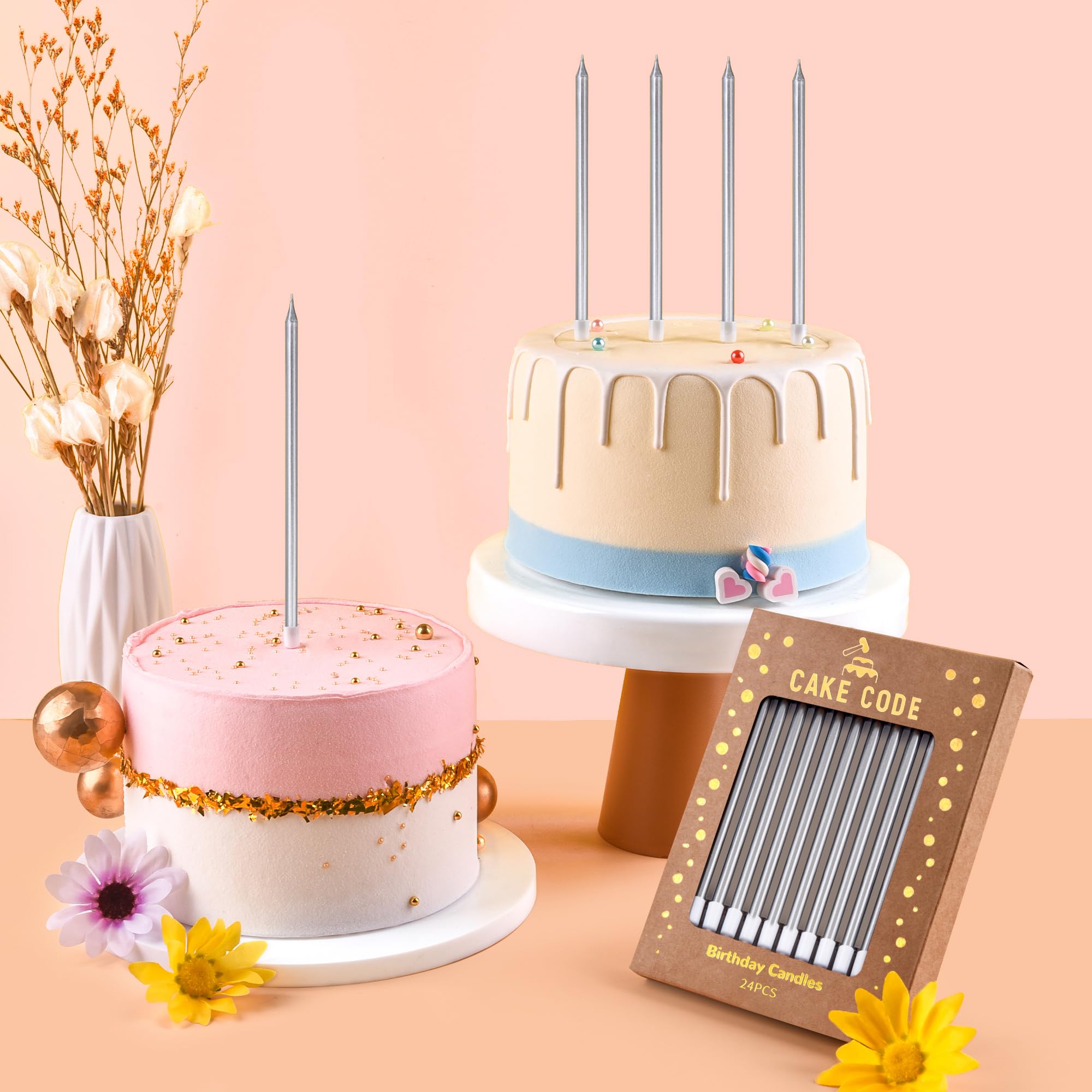 New: CAKE CODE's 24 long, thin & tapered elegant silver cake candles are the perfect finishing touch to celebration cakes and cupcakes. Designed to make your celebration a truly lovely event.