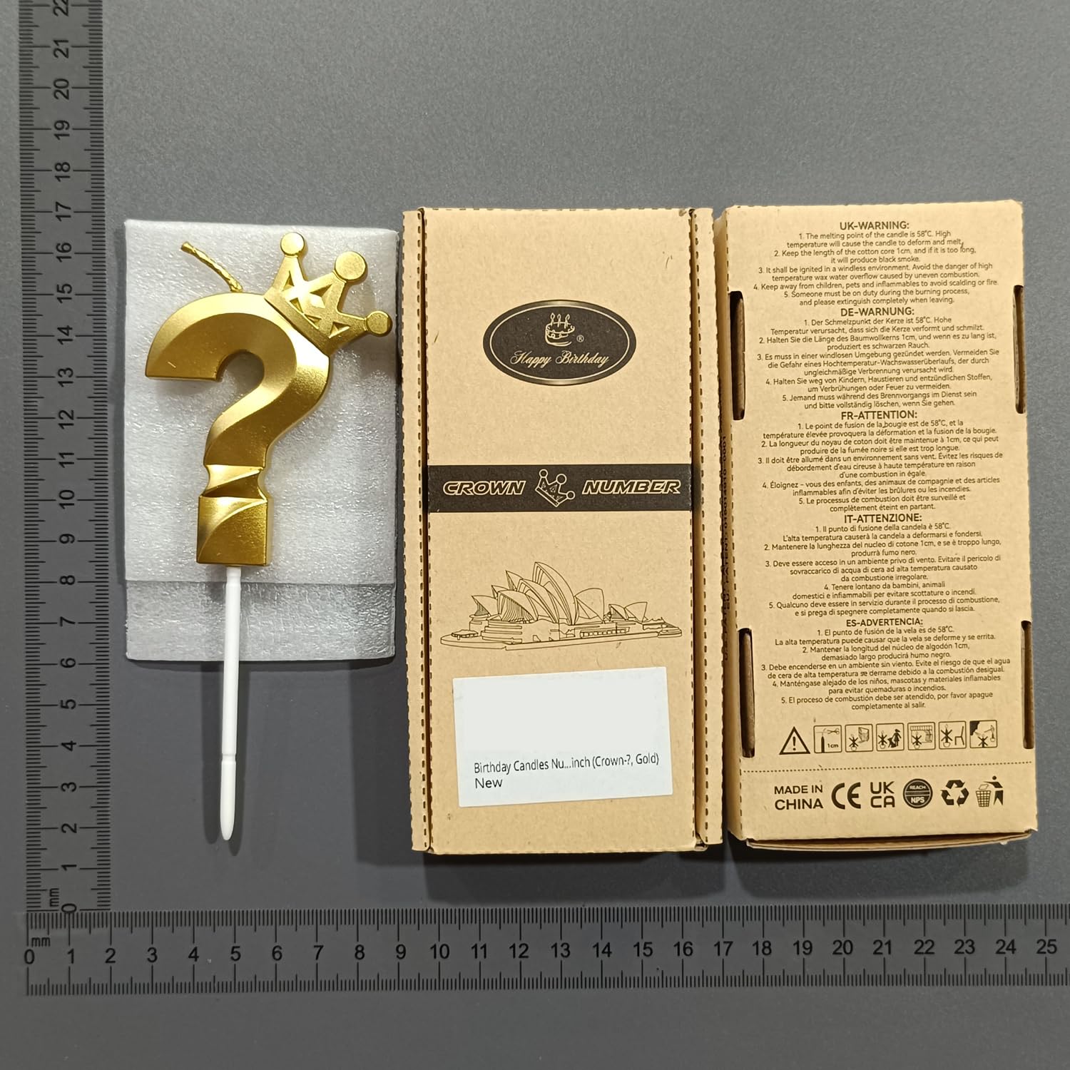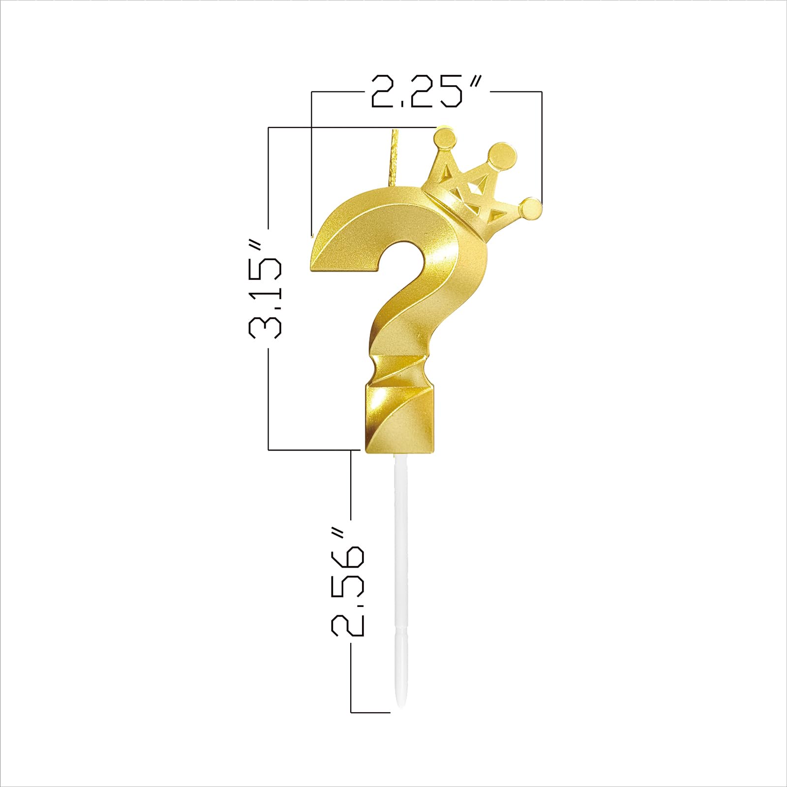 Jumochi 3D Crown Birthday Number Candles You don't need to have great cake decorating skills, you can still make your cake look beautiful with our candles. Pros: The size is suitable for lots of cakes. The bright gold color is beautiful. The little crown is cute. Long plastic stick do not easy to tip over. It is washable and reusable. Burns slowly, you can keep the candle in a memory box after birthday. Good Packaging. Candle came in a sturdy box, placed within a plastic insert that cradled the candle safely. Versatile Number Candles: You can buy birthday candles of all ages, even if you don't want others to know your age, you can choose question mark ? candle. Material: Wax Candle Dimension including stick: 5.7 x 2.25 x 0.4 Inches Weight: 0.1 lbs What’s in the package: 1 Numeral Candle Be careful - Numeral candles are flammable. Keep away from fire when candles are not in use. Keep away from children when candles are burning.