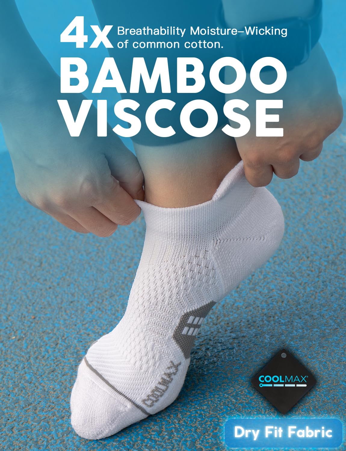 【Moisture-Wicking & Odor-Free】: Made from a blend of Coolmax yarn and bamboo viscose, these socks are four times more effective at wicking moisture than cotton socks. Coolmax absorbs sweat faster, keeping your feet cool and dry, while bamboo viscose prevents odors for fresh feet throughout your run.