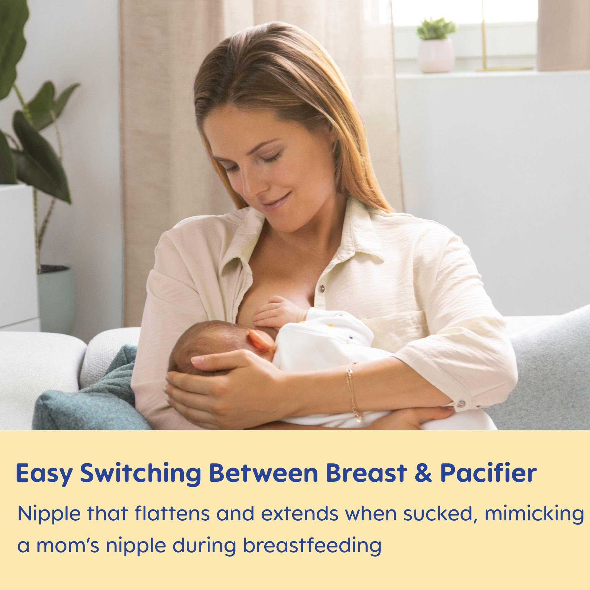 The MAM Mini Air Pacifier has a shield that is specially designed for babies 0-6 months with sensitive skin. The extra wide air holes allow plenty of circulation around your baby's mouth and even allow you to peek at their little smile. All MAM pacifiers for baby feature our trademarked SkinSoft silicone pacifier nipples that feel like mom and help babies transition from breast to pacifier. In fact, market research showed that MAM nipples are easily accepted by babies of all ages, with 94% nipple acceptance among babies tested*. The textured breastfeed pacifier nipple stays easily in baby's mouth and is just the right size for your girl and boy baby 0-6 months so their growing teeth, palate, and jaw will be safe. Additionally, the symmetrical orthodontic nipple shape means you won't have to worry about uneven pressure or fussing to turn the pacifier "right side up". Silicone pacifiers kept in the closed box will remain clean for up to 48 hours: Fill pacifier case with water. Place pacifier in the self-sterilizing case with the nipple facing down. Follow package instructions for microwave setting. Cool completely before use. *Market research 2010-2020, tested with 1,572 babies