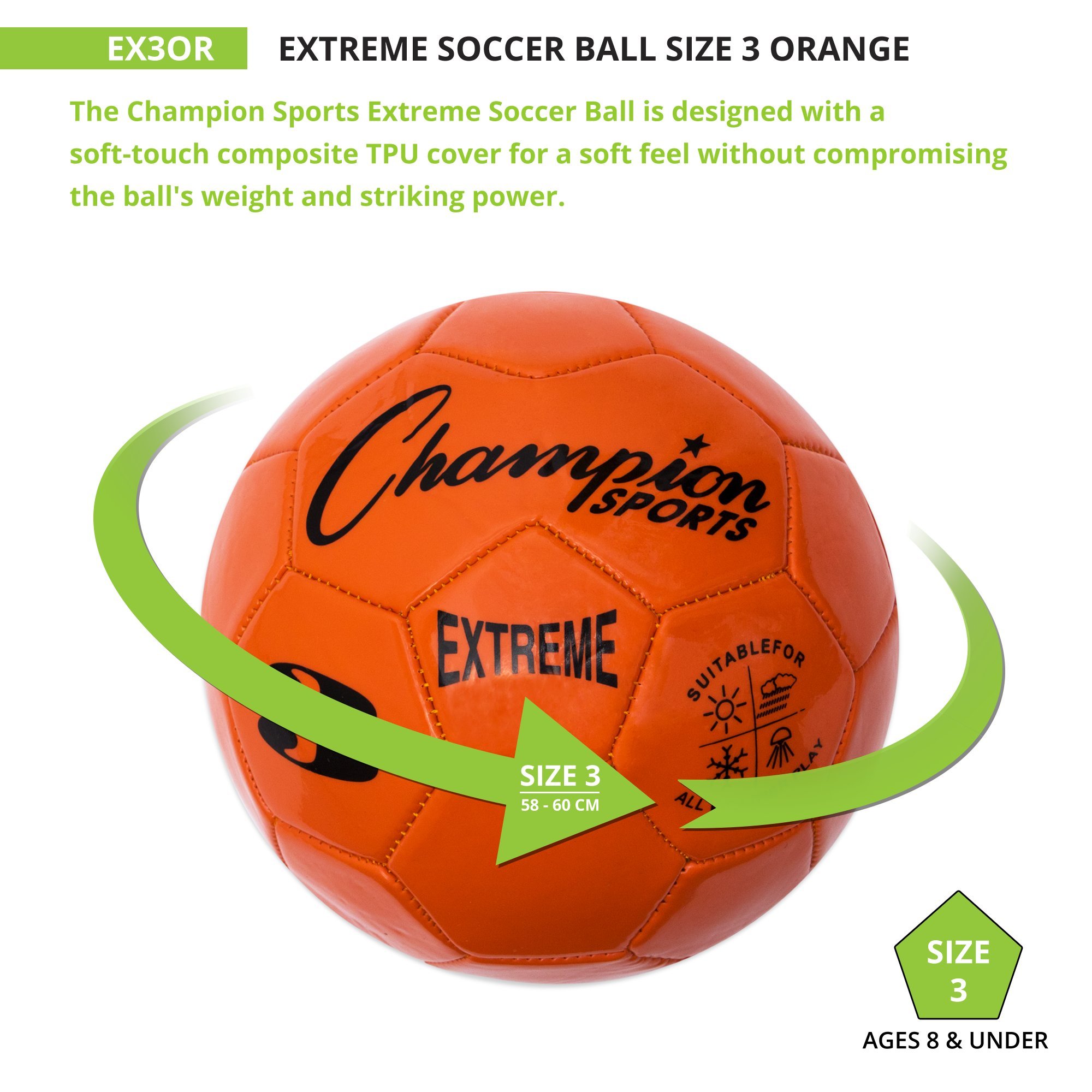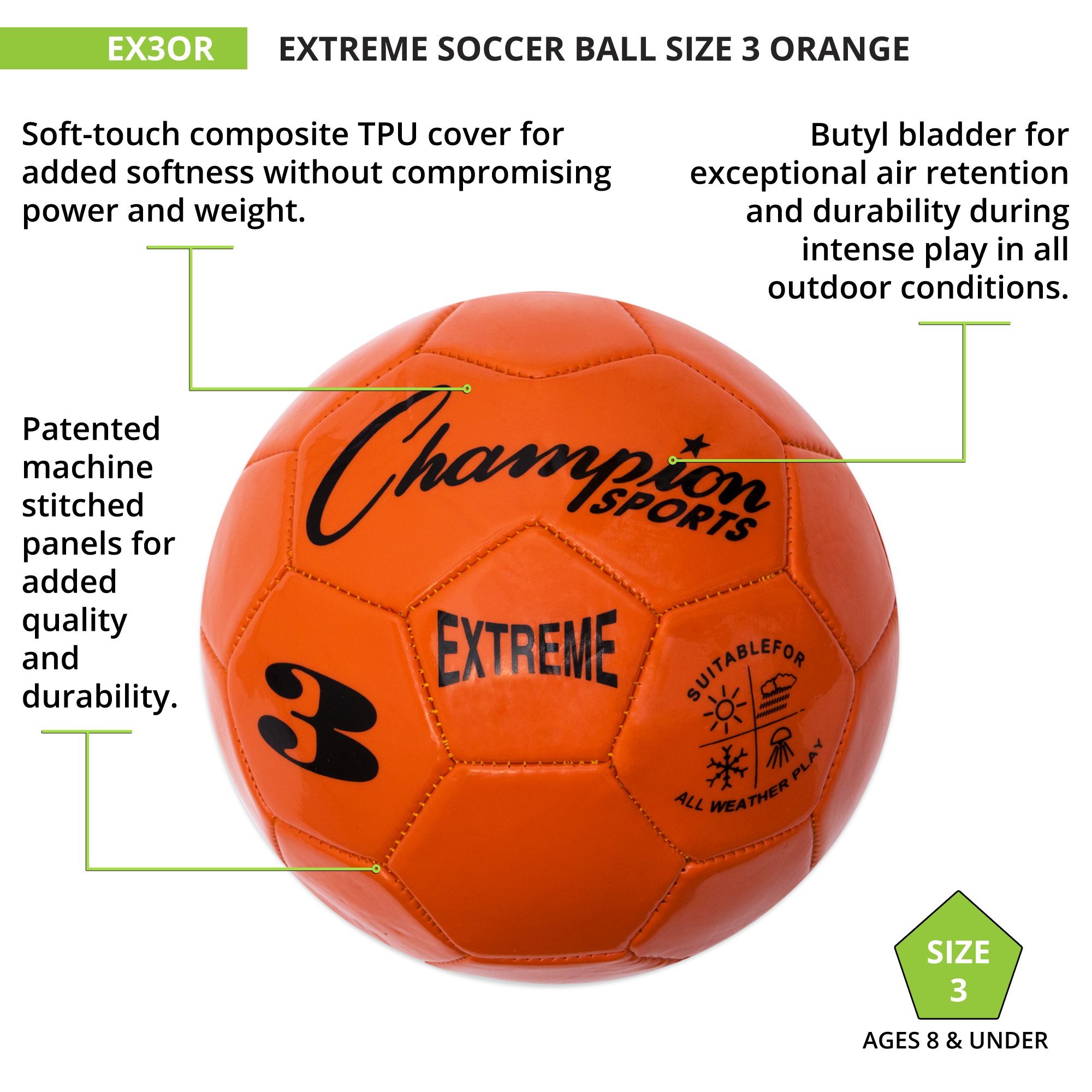 The Champion Sports Extreme Soccer Ball is a Durable, All-Weather Ball for Competition & Training. Built for both competitive matches and casual play, the Champion Sports Extreme Soccer Ball is designed to perform in any weather. Its soft-touch TPU cover provides a comfortable feel for dribbling, passing, and striking, while maintaining the weight and power needed for accurate shots. Engineered for durability, this high-quality soccer ball features a butyl bladder for superior air retention and machine-stitched panels for long-lasting performance. Whether you're playing in the heat, cold, wind, or rain, this ball maintains its shape and reliability. Available in three sizes: EX3 (Size 3): Ages 8 & under, EX4 (Size 4): Ages 8 to 12, and EX5 (Size 5 – Official Size): Ages 12 & up. Choose from a variety of vibrant colors, including Red, Orange, Yellow, Green, Blue, Purple, Black, Silver, and Pink. Note: Ball ships deflated. Pump sold separately.