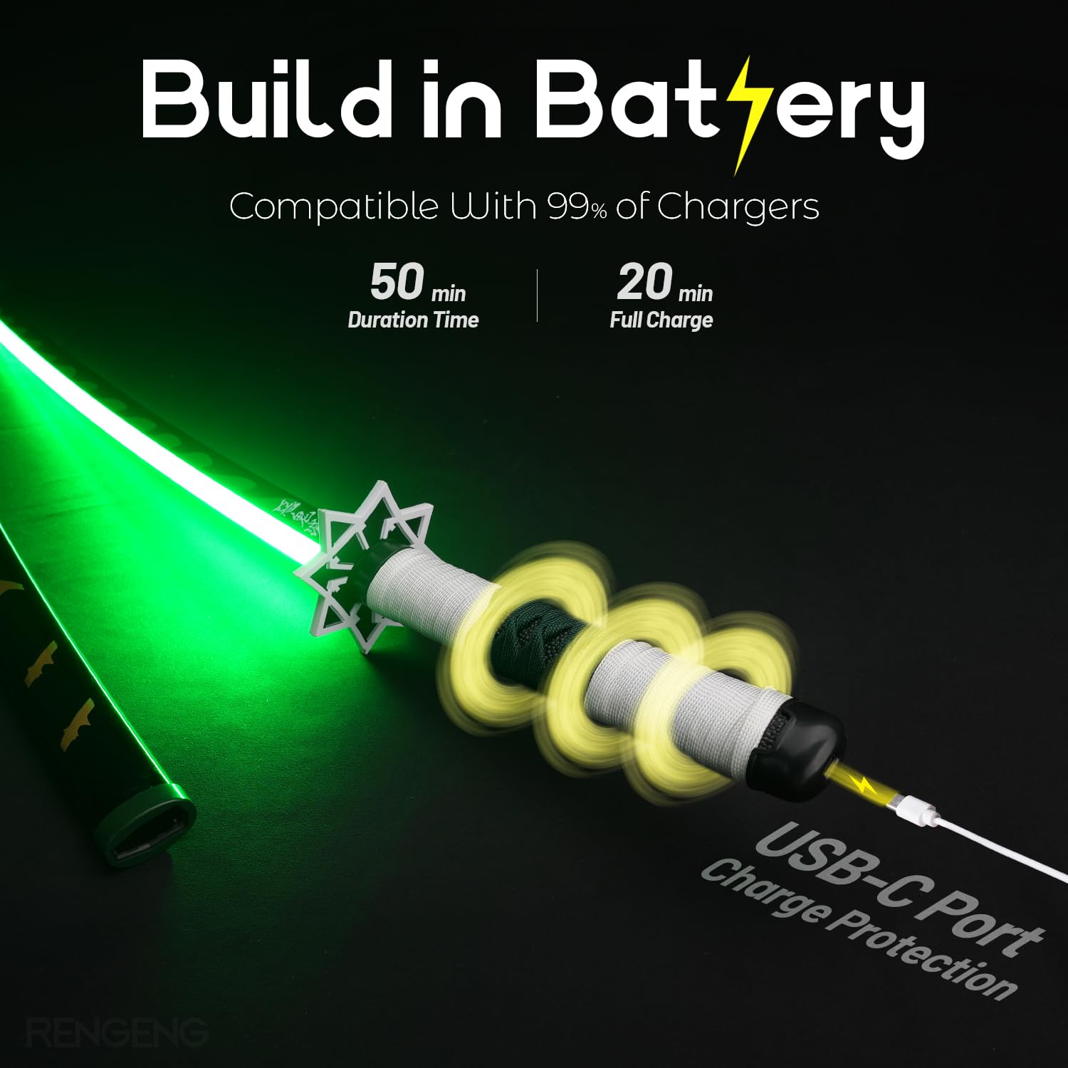 [Rechargeable] The light-up sword is powered by a rechargeable battery that lasts up to 50 minutes on a full charge, which takes about 20 minutes. Turning the light on or off is as simple as tapping the charging port on the handle twice