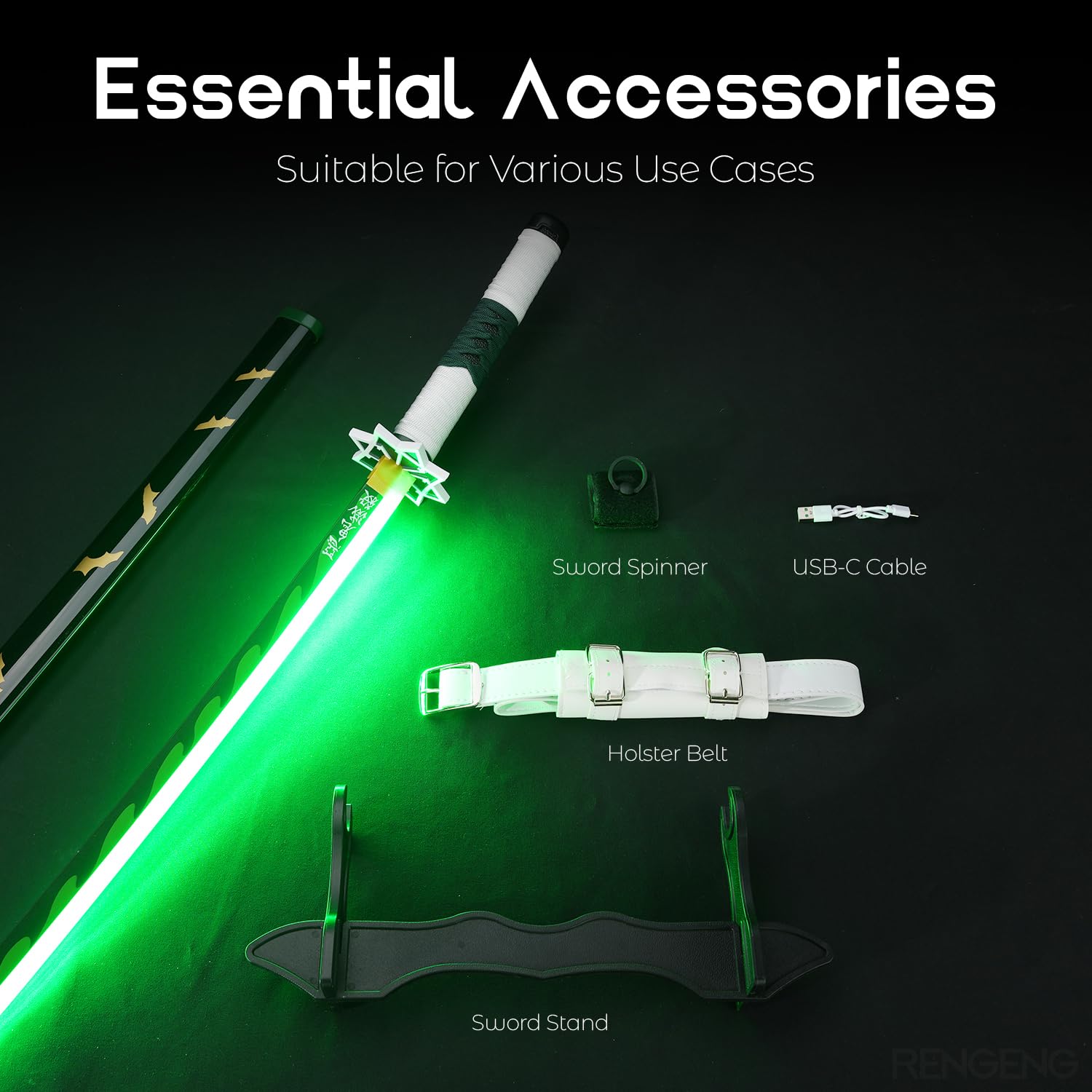 [Packaging Includes] This package contains: Light Up Sword x1, Holster Belt x1, Sword Stand x1, Sword Spinner x1, and USB-C Cable x1