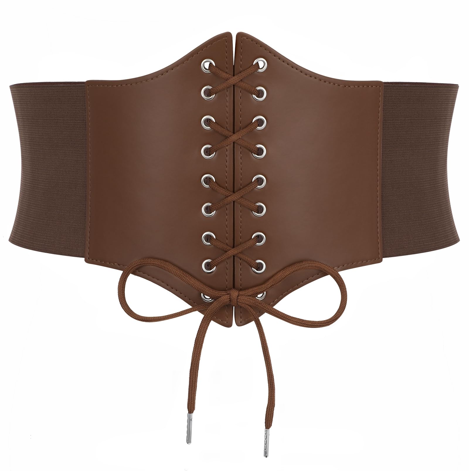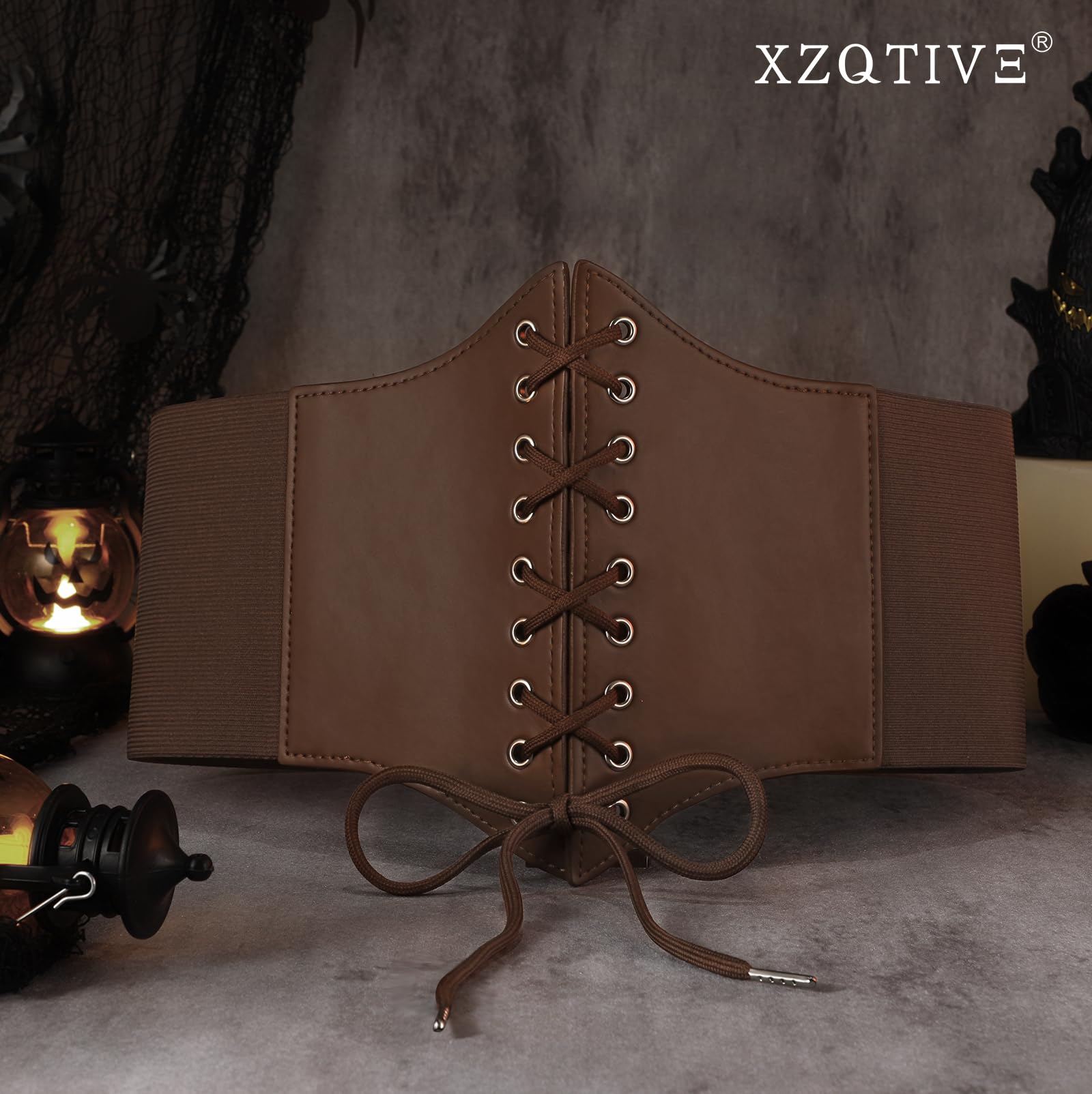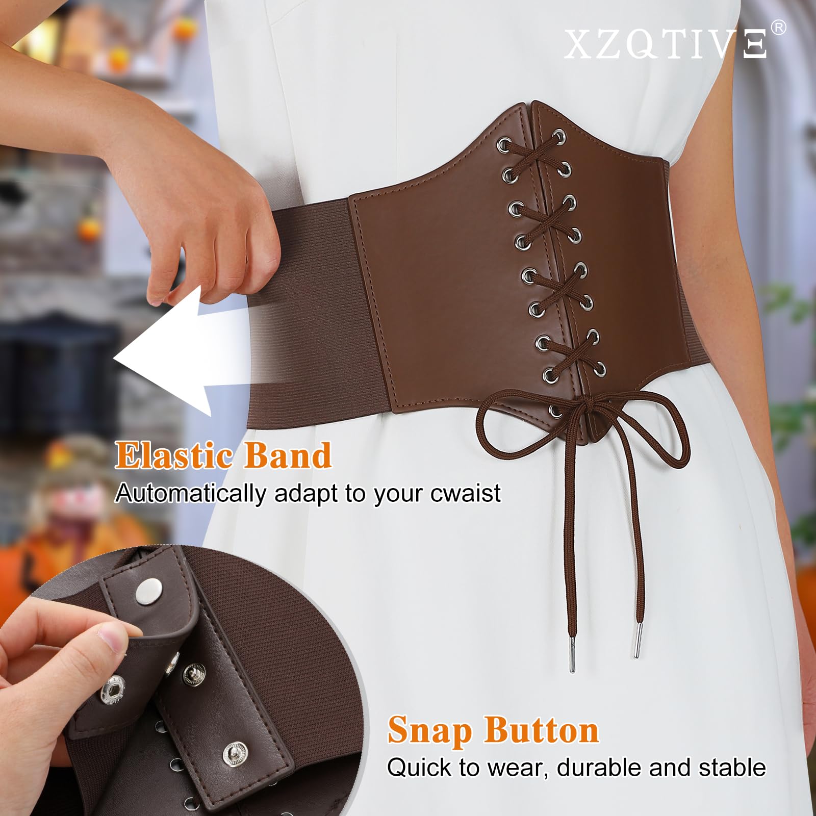 ➜ Black Corset Belt for Waist - Wide Costume cinching belt with tied corset leather on the front, elastic webbing band on the back, snap button closure to lock the belt,