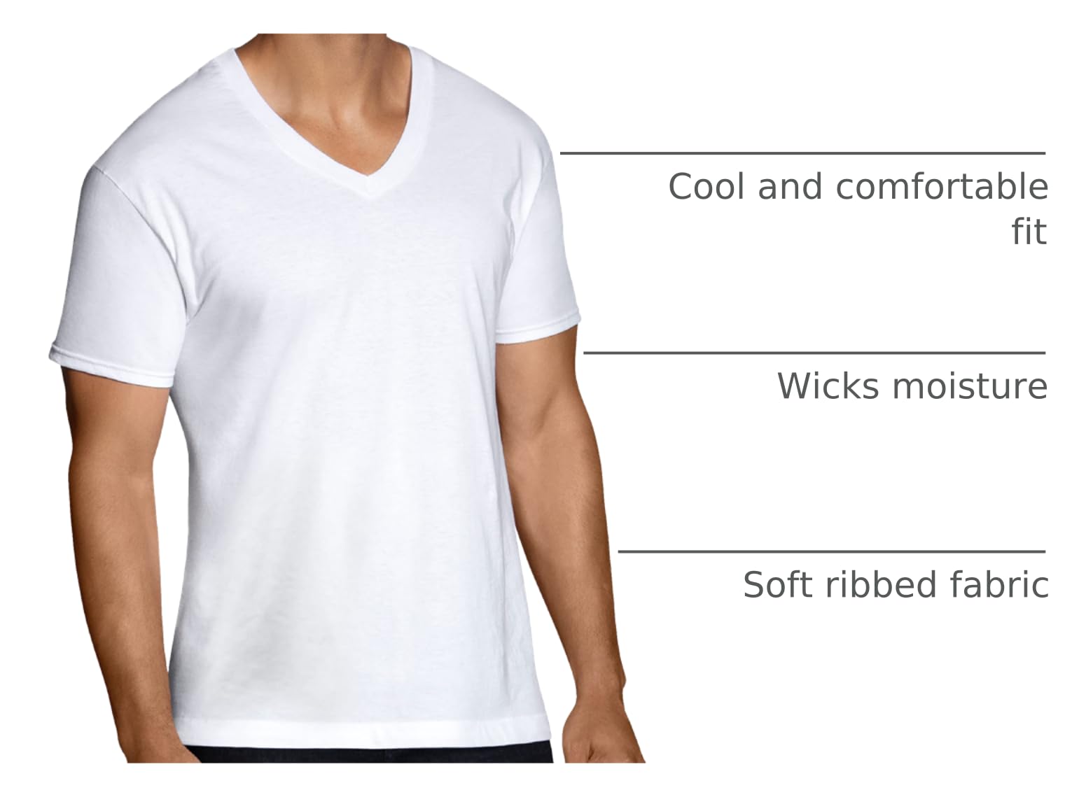 Description Fruit of the Loom® Men's V-necks are designed to eliminate ride-up and stay tucked so you can go about your busy day with confidence. Made with soft, cotton fabric, these T-shirts will maintain their softness wash after wash. The no-show collar always keeps its shape and the convenient design will keep you comfortable all day. The sleeves have a unique shape to improve the overall fit and to prevent unwanted peeking from underneath your outer shirt.