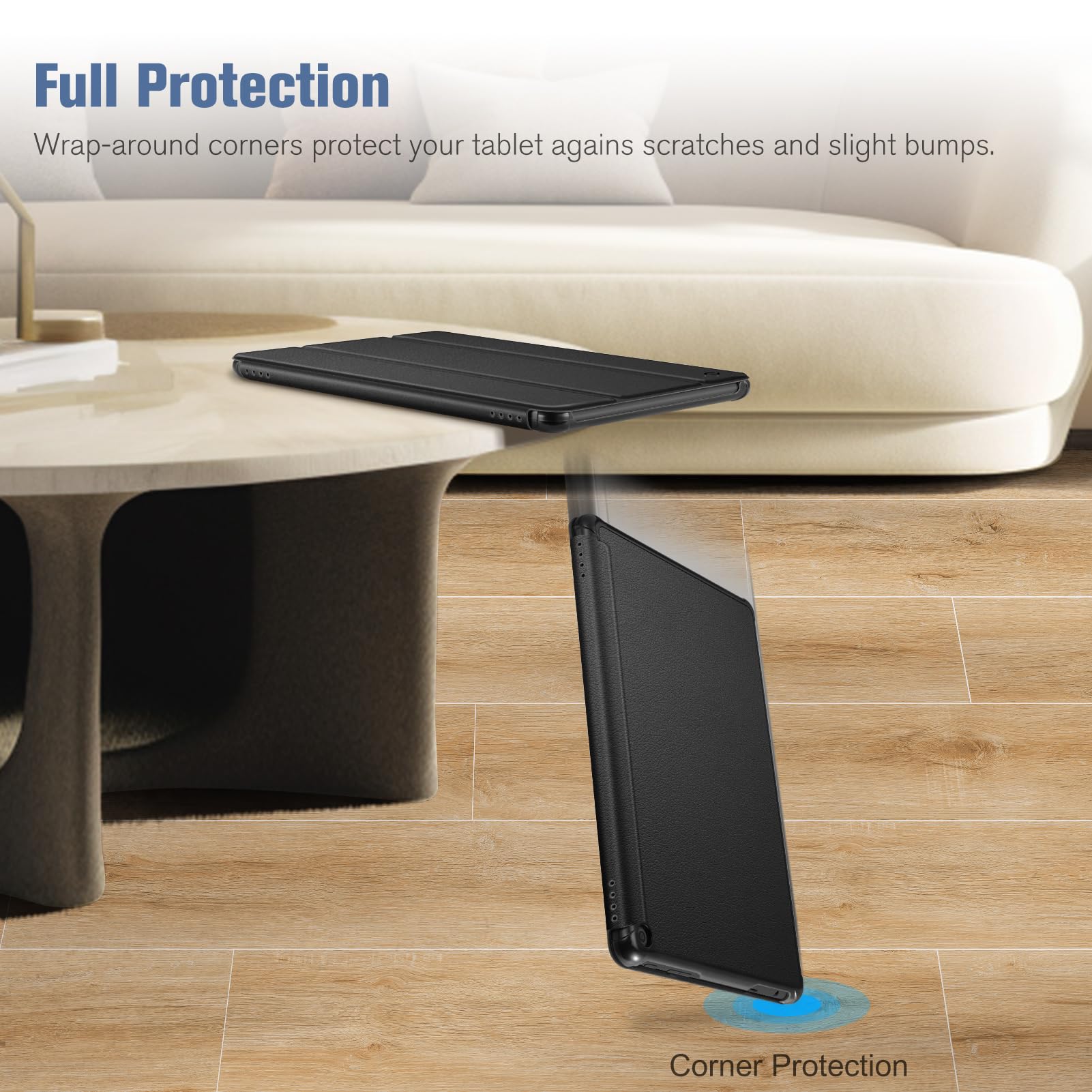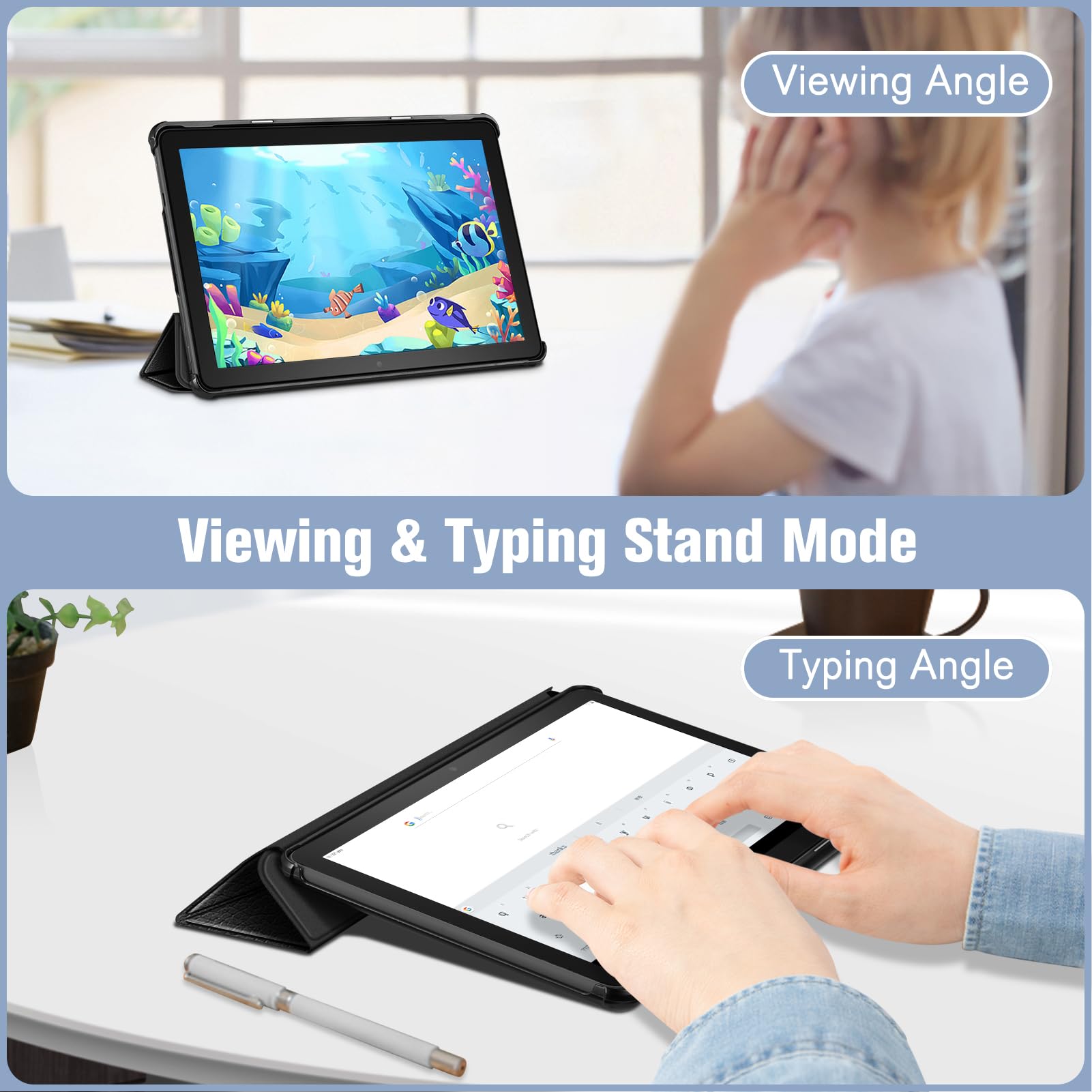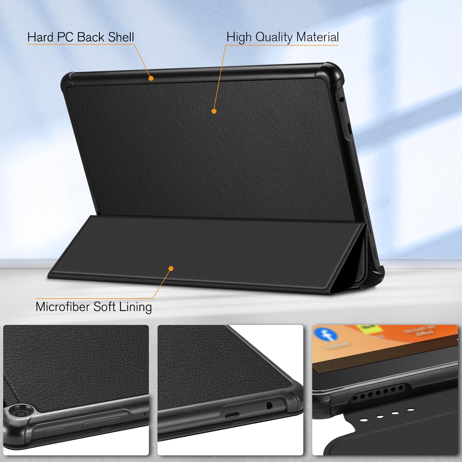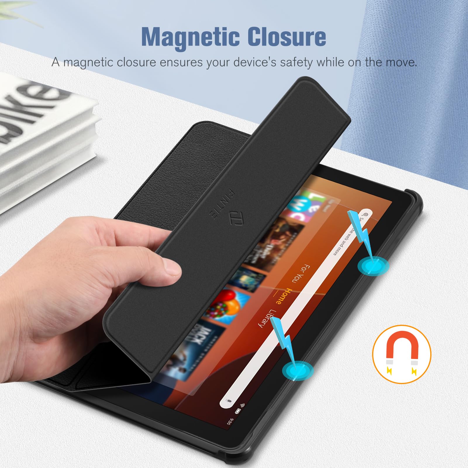 【Auto Wake / Sleep】Built-in magnetic strip provides sleep / wake feature, automatically wakes or puts your 10.1 inch Fire HD 10 2023 tablet to sleep. Magnetic Closure ensures the front cover is securely closed without straps covering the front.
