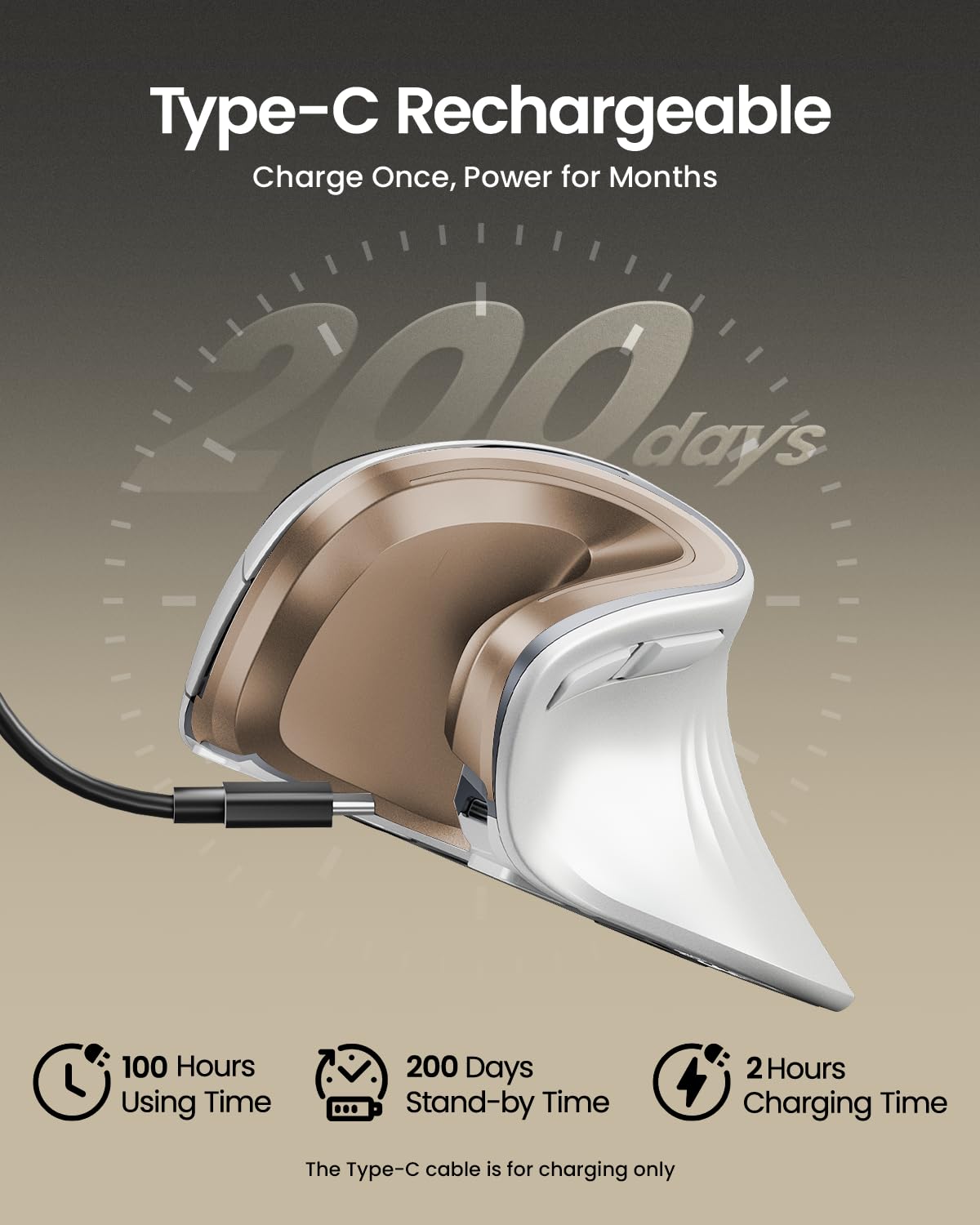 Rechargeable Ergonomic Mouse: The Bluetooth Vertical Mouse has a built-in 500mAh Li-Ion battery that can be conveniently recharged using the included Type-C cable(The Type-C cable is for charging only)