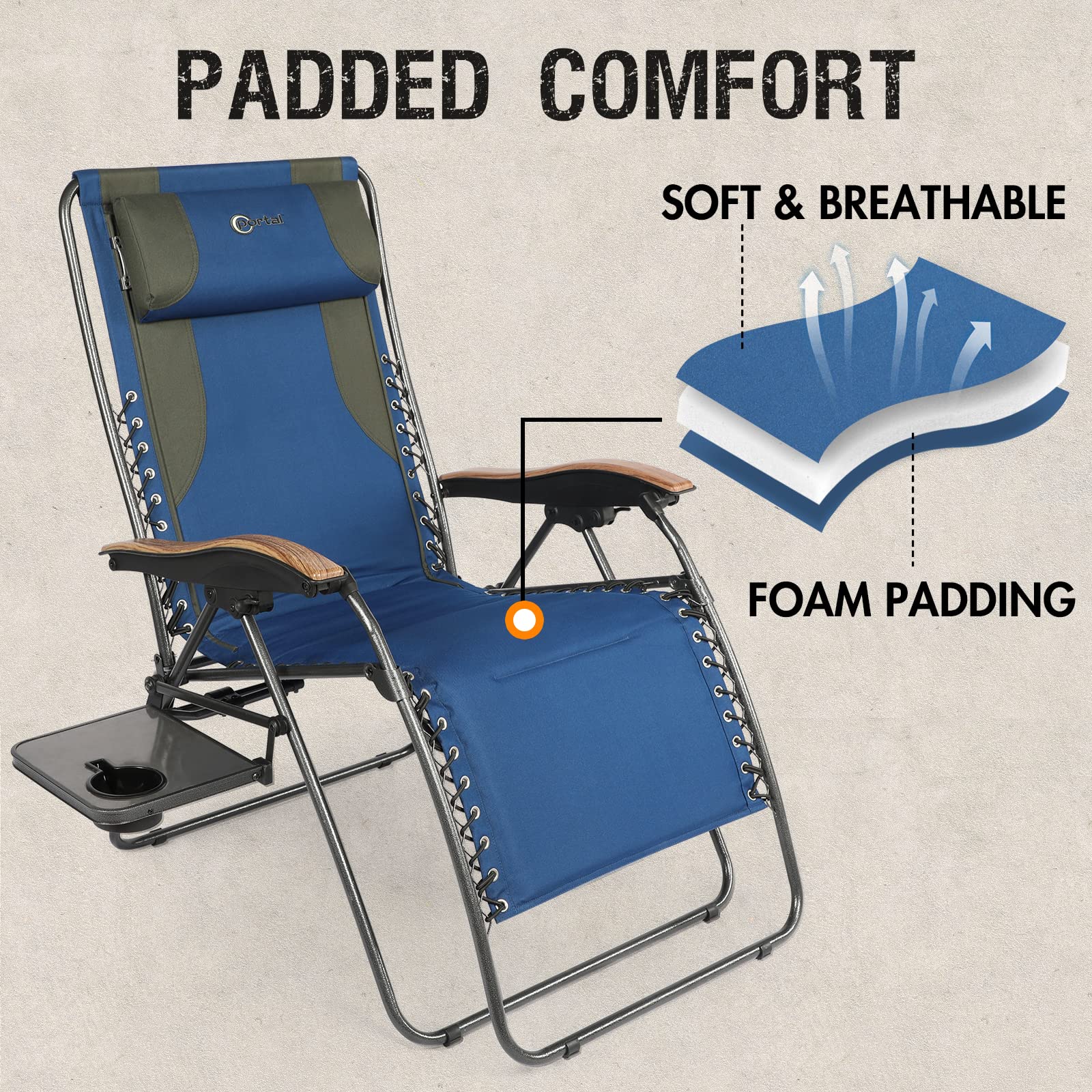 COMFORTABLE & CONVENIENT LOUNGE CHAIR: Fully padded seating, adjustable pillow for head or lumbar support, and plastic armrests with wood grain make the reclining camping chair comfortable to rest for adults. The cup holder can free your hands.
