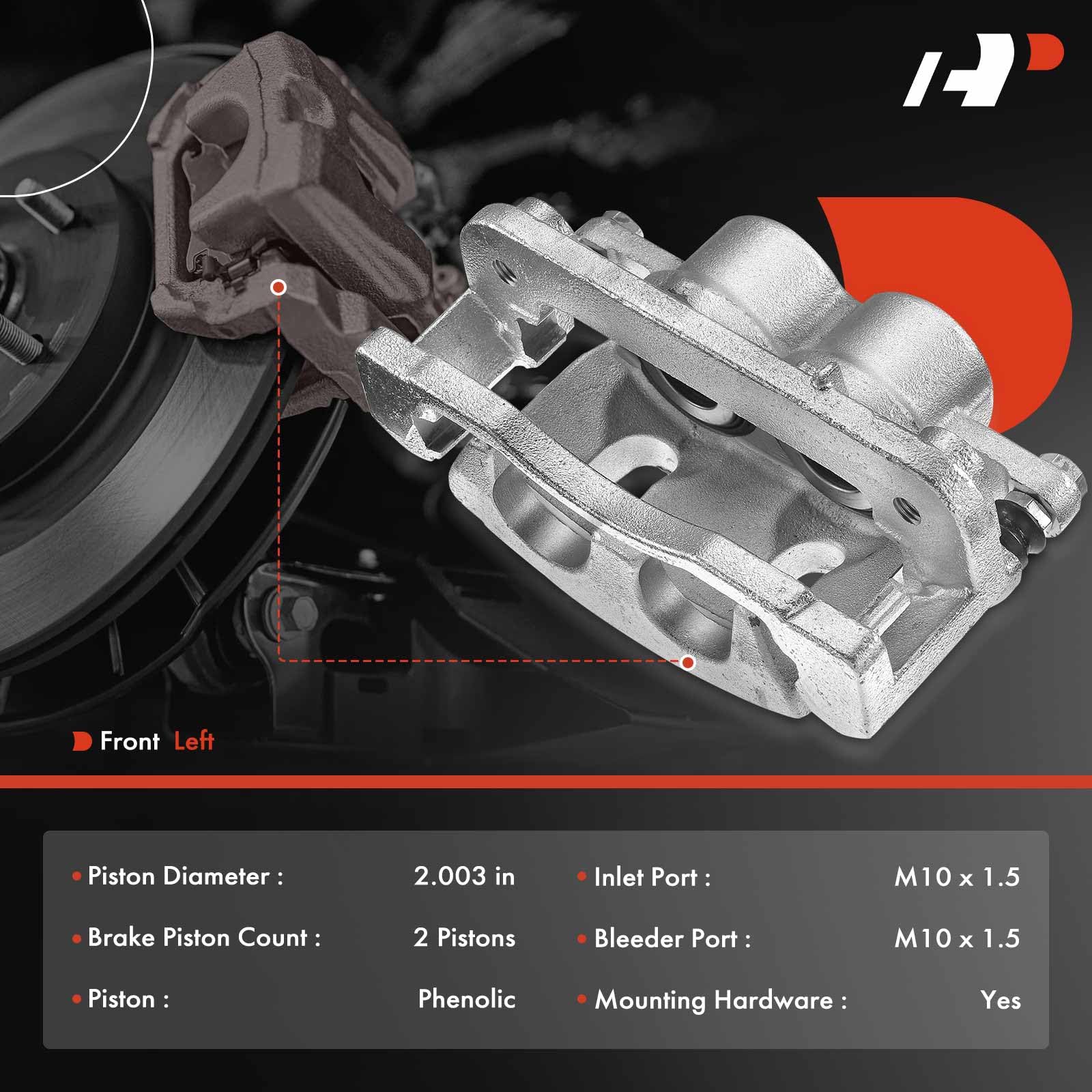 [Specification]: ① Brake Piston Count: 2 Phenolic Pistons; ② Piston Size(OD): 2.003 inches; ③ Inlet Port Size: M10 x 1.5; ④ Bleeder Port Size: M10 x 1.5; The Brake Calipers are coated with antirust coating, which can effectively prolong the service life
