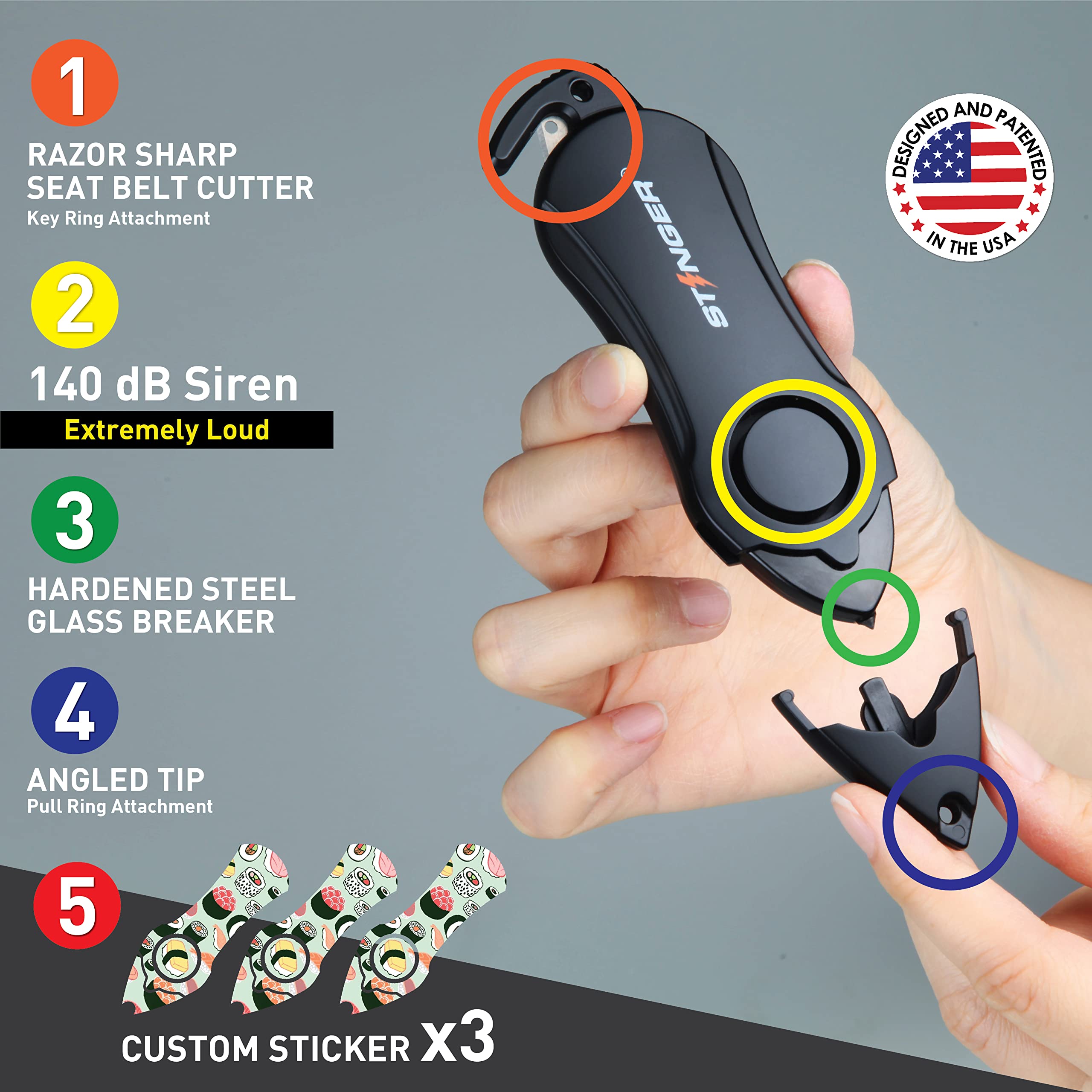 RAZOR SHARP SEAT BELT CUTTER: Stinger Personal Alarm Emergency Tool comes with a razor-sharp blade to help you cut your seatbelt if you find yourself unable to release it normally. It cuts easily through safety belts to free trapped driver and passengers. It increases the survival rate.