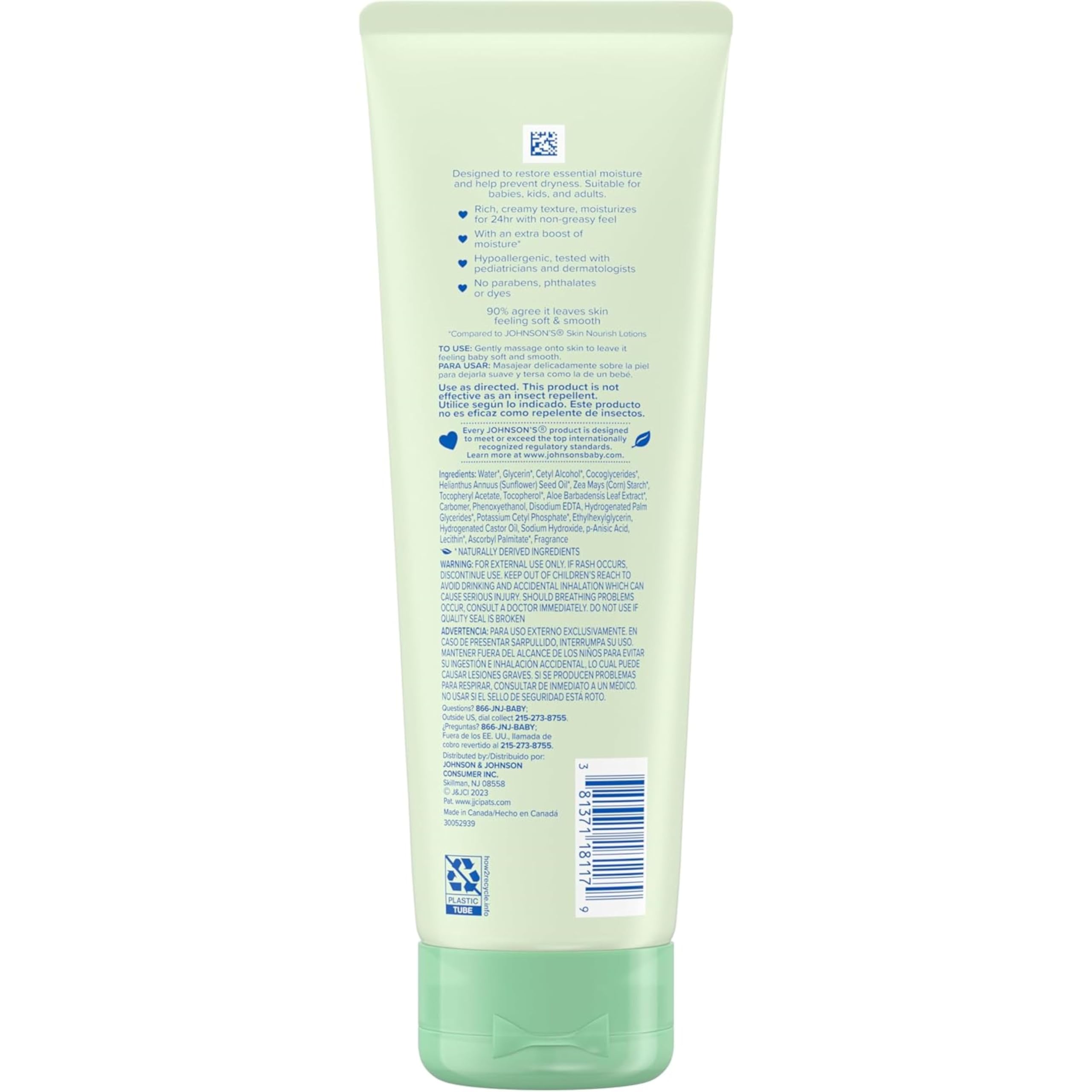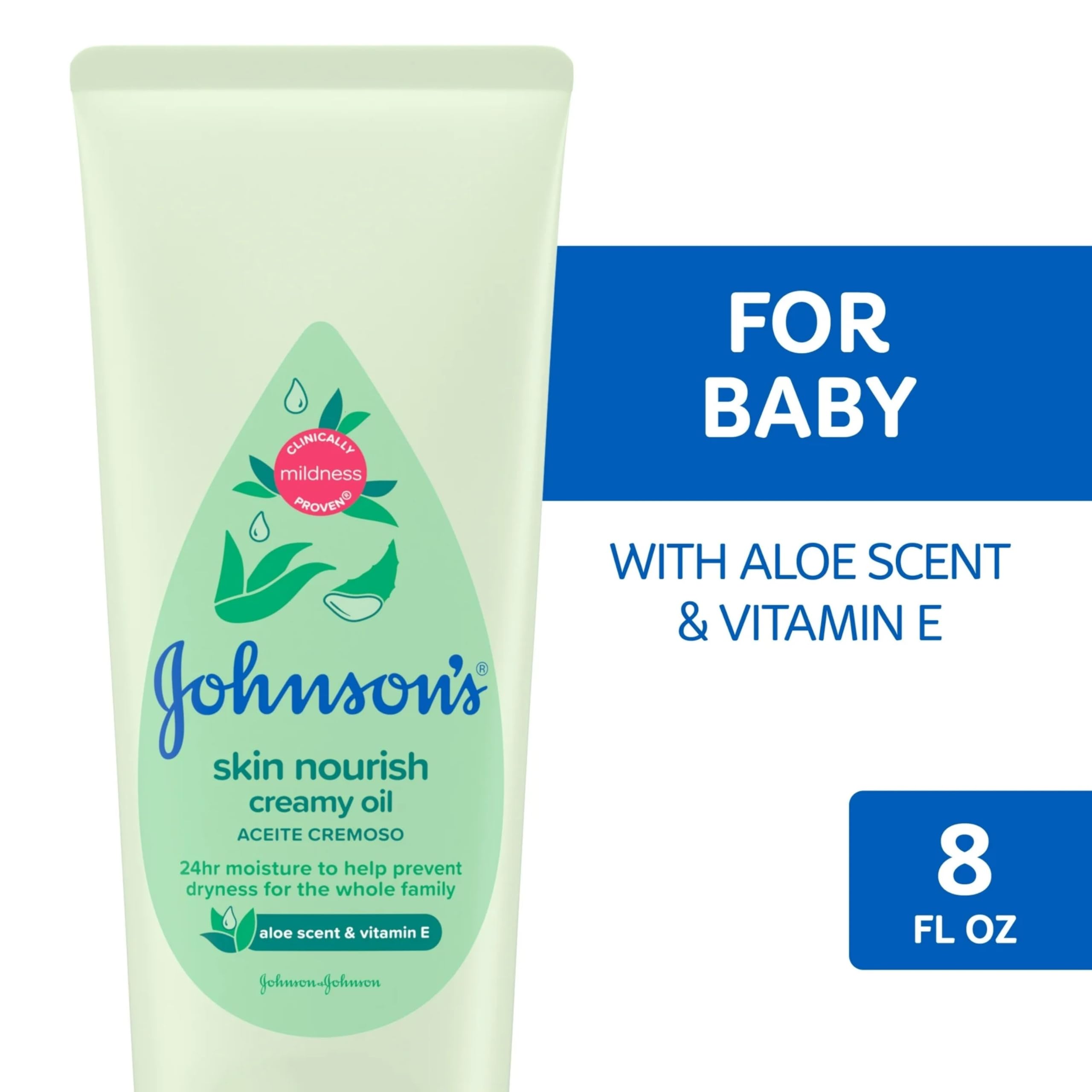 Johnson and Johnson Johnson's Baby Creamy Oil Aloe and Vitamin E is enriched with soothing Aloe and Vitamin E and combines rich emollients with Johnson's baby oil to provide long-lasting moisturization. Their indulgent, non-greasy creamy oil absorbs quickly and leaves nothing but softness behind on the skin. Its sweet yet subtle fragrance will delight your senses.