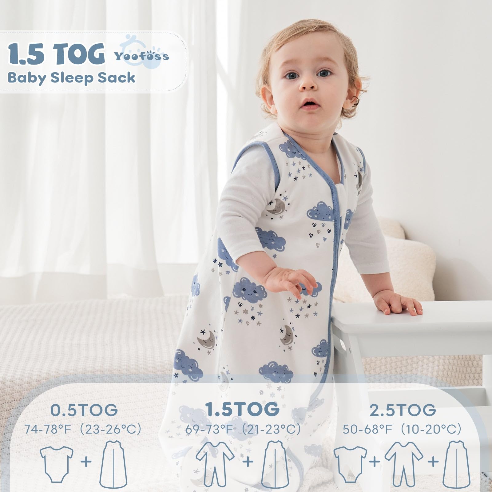 Softness and Warmth - Yoofoss baby sleep sacks made with 2 layers, plush fabric and 100% cotton Lining, super soft and smooth, ensure baby's warmth and a cozy embrace. 1.5 TOG sleep sack is suiable for moderate temperatures from 69 to 73°F as an ideal option for autumn,early winter and spring or taking a nap in air-conditioned rooms during the summer, keeping your baby snug and warm.