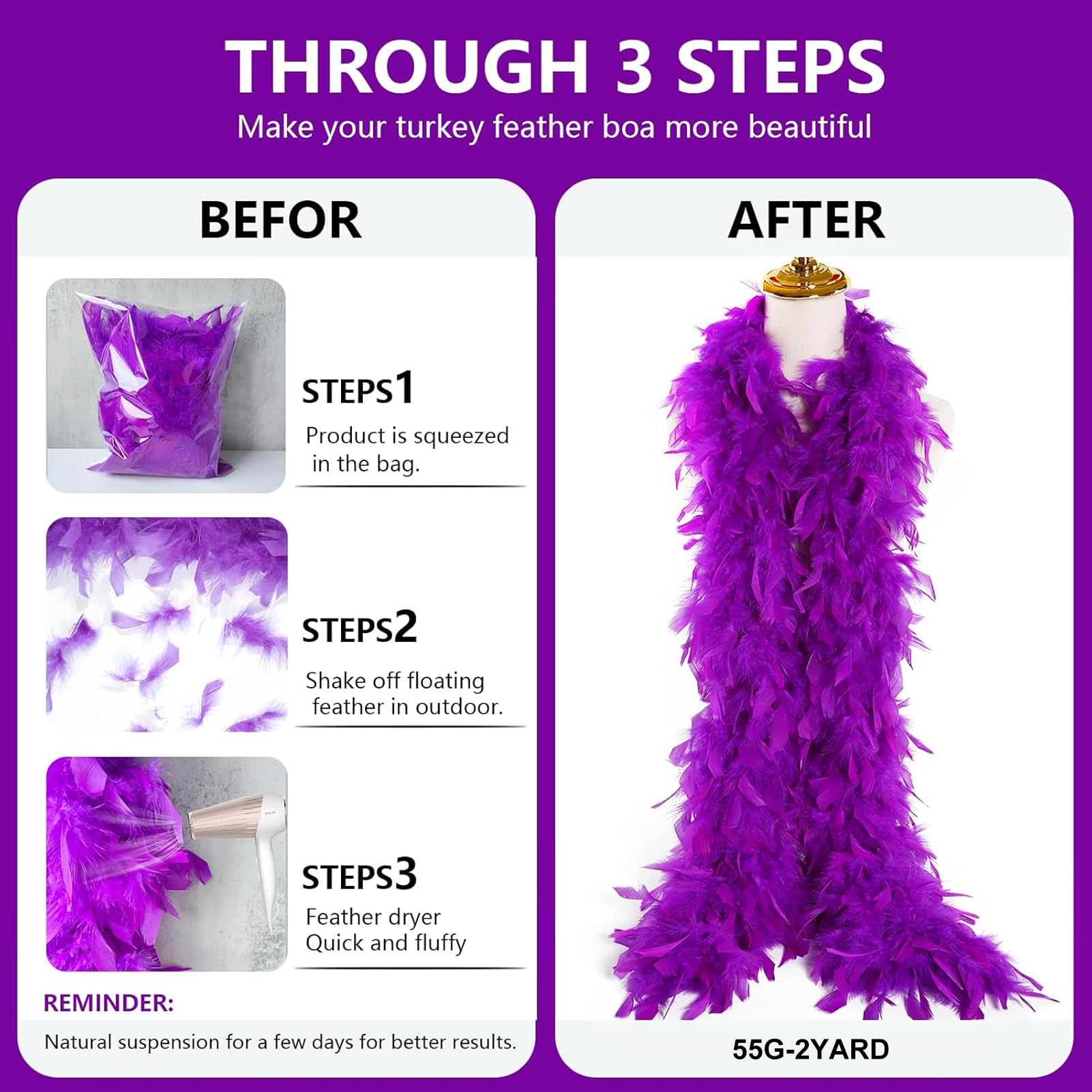 ❤️Precautions before use:Since our feathers are all natural and handcrafted,After you receive the boas, take them out of the package and shake them outdoor first, in order to get rid of debris and fallen feathers.Then hang it up for few hours before wearing. If you can hang up blowed few days, it will looks as the picture full and big.Of course,the longer you hang them up, the turkey feather boa will be more fluffy and the effect will be more stunning.