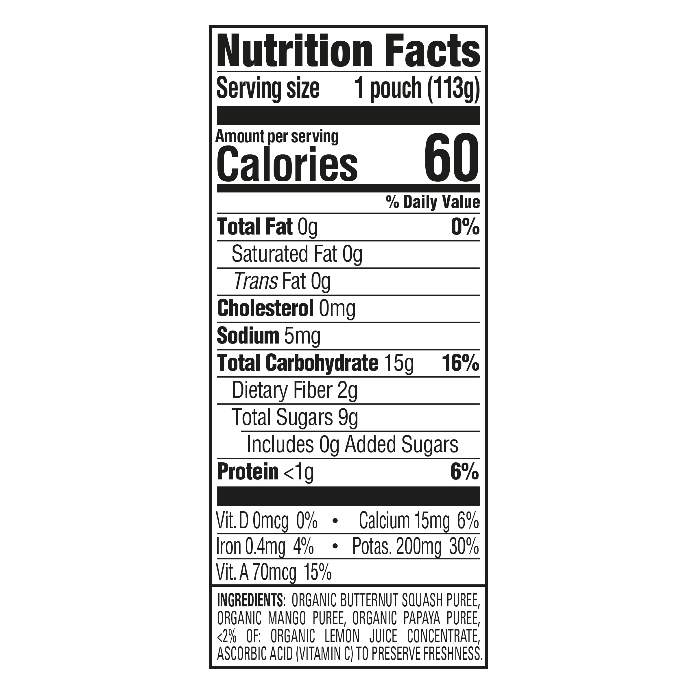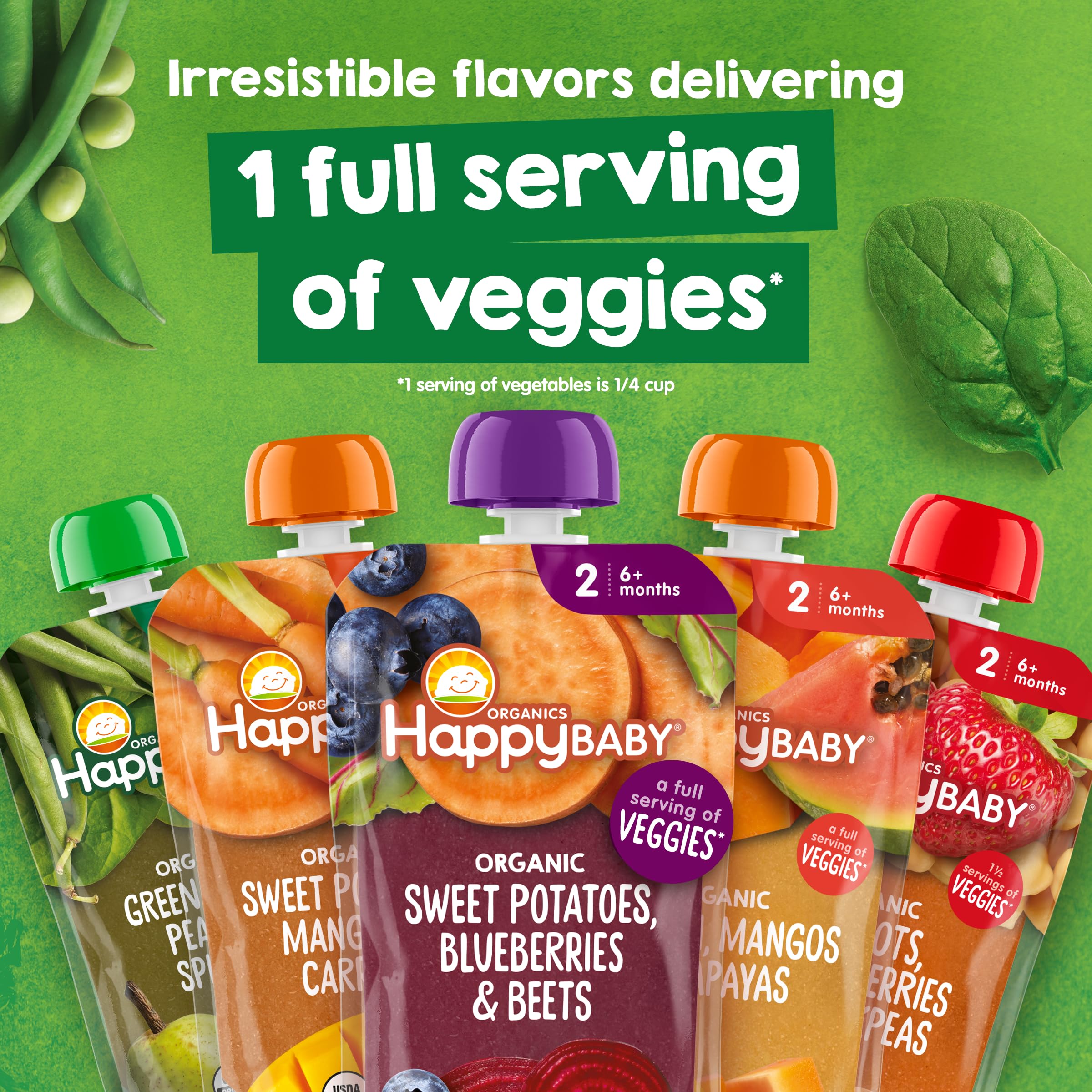 Deliver one full serving (ΒΌ cup) of veggies to baby with this delightful puree made from farm-grown ingredients and bursting with bright flavors. Delicious squash takes center stage in this sweet and savory recipe that features over 50% veggies. We combine hearty, organic squash with juicy organic mango and papaya in a brilliant balance of flavor and texture thatβs great for the exploratory taste buds of Stage 2 eaters. All Happy Baby products are always certified USDA organic, made with ingredients that are non-GMO and grown without the use of toxic persistent pesticides.