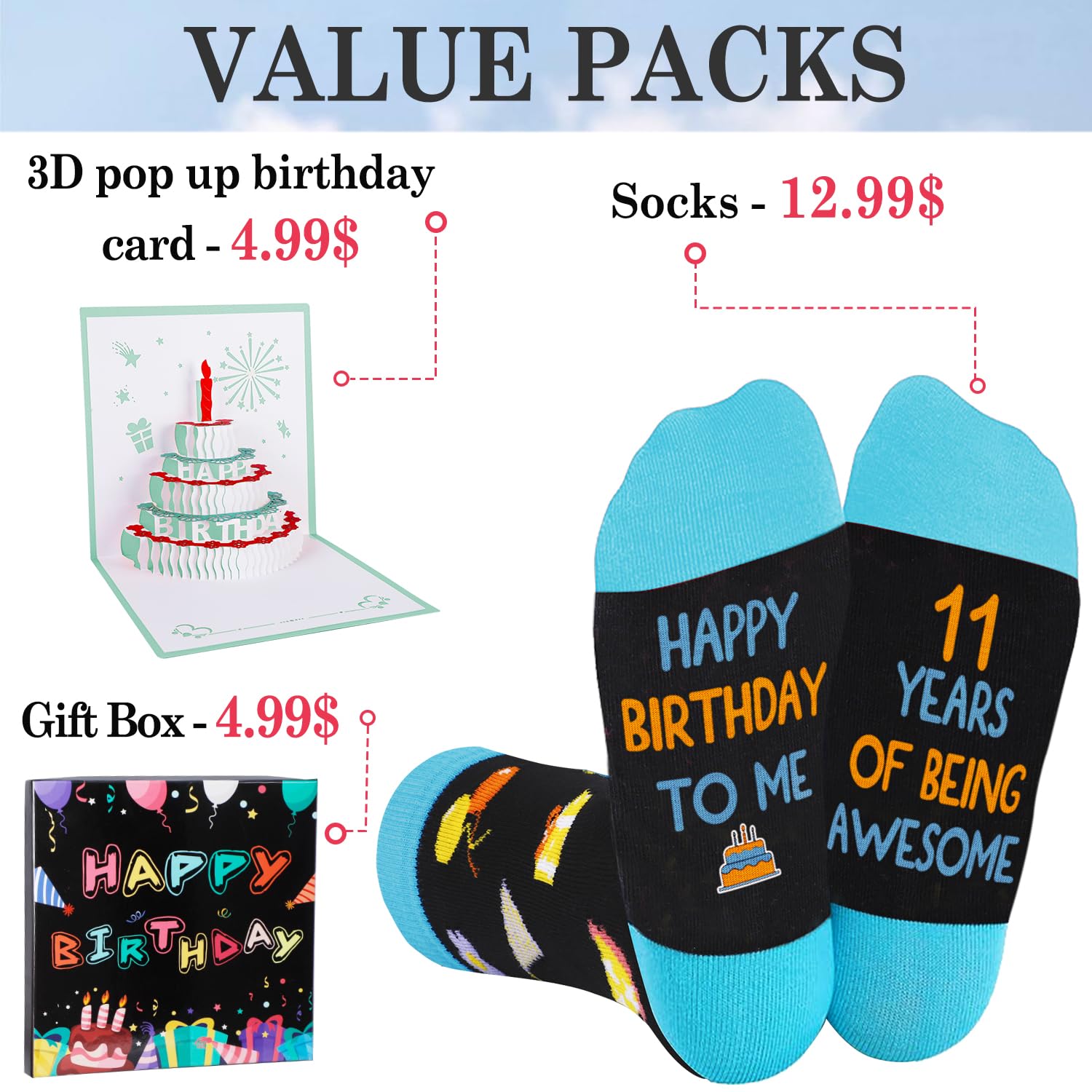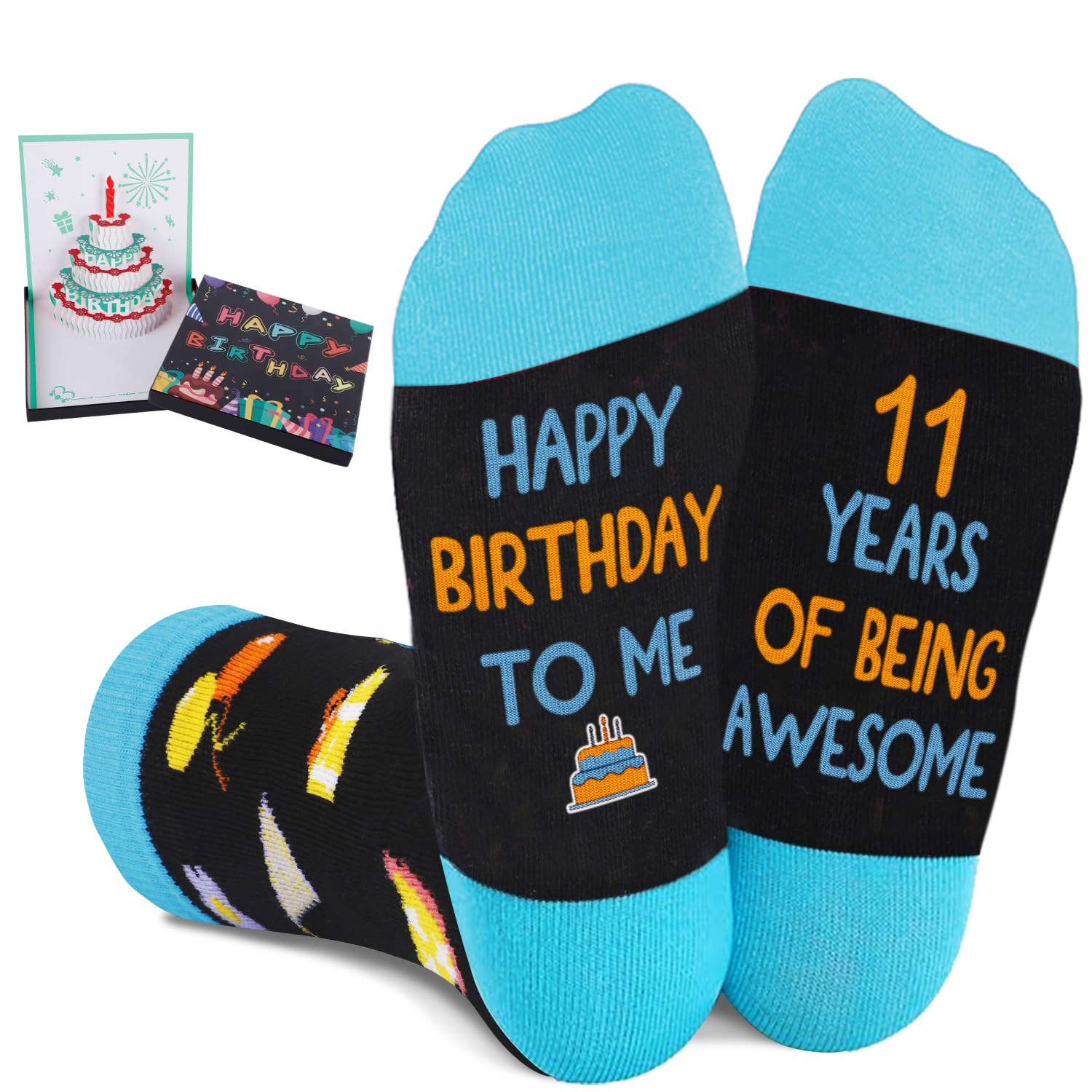 11 Year Old Boy Gifts: A pairs of socks special design for 11 birthday Boys, package also coming with a cute 3D pop up birthday card. Both items are packed in a beautiful gift box to emphasizes the surprise and enhances the joy of unwrapping the box, making the cool gifts for 11 Year Old Boy more memorable. It could be the perfect birthday gift for your Son, Grandson, or nephew