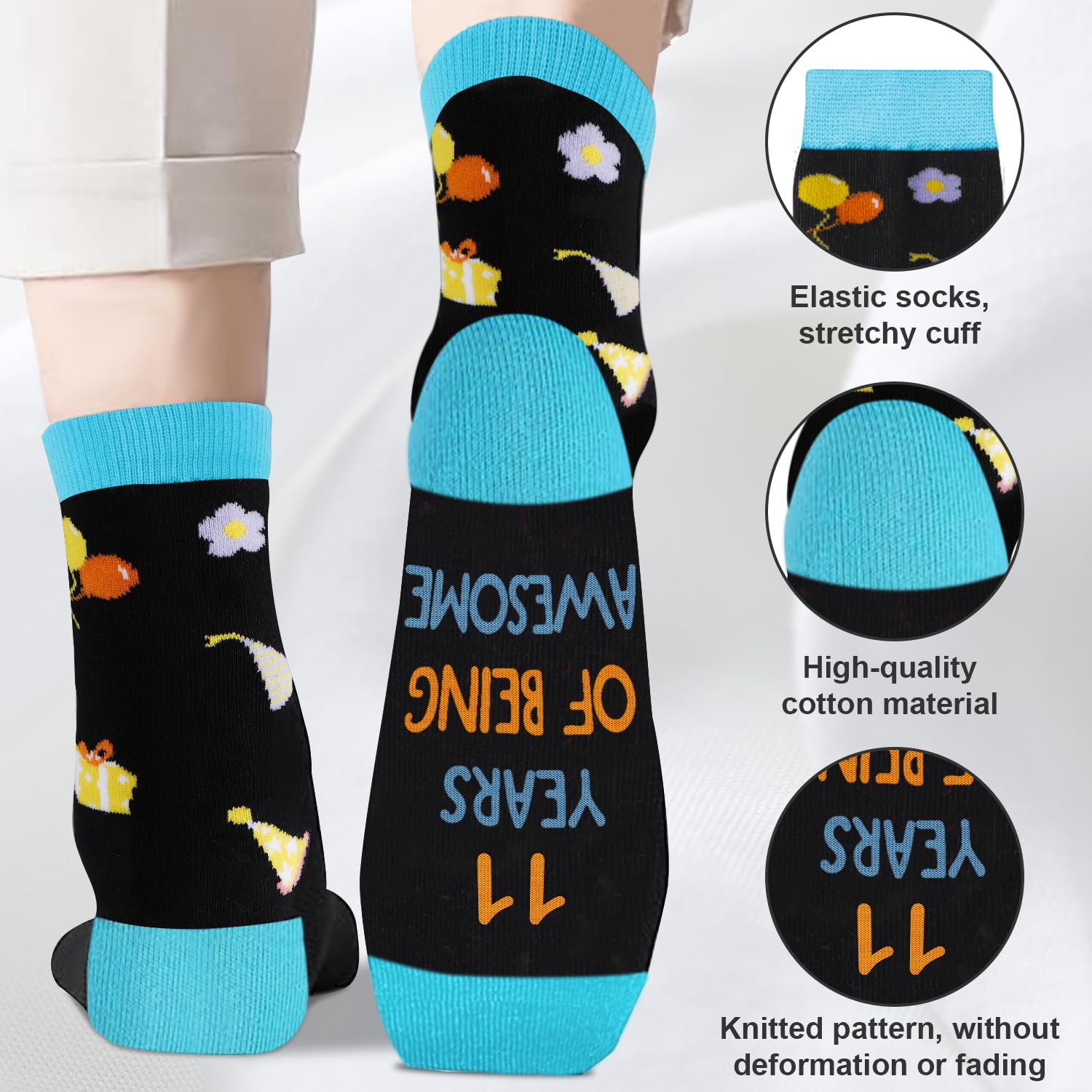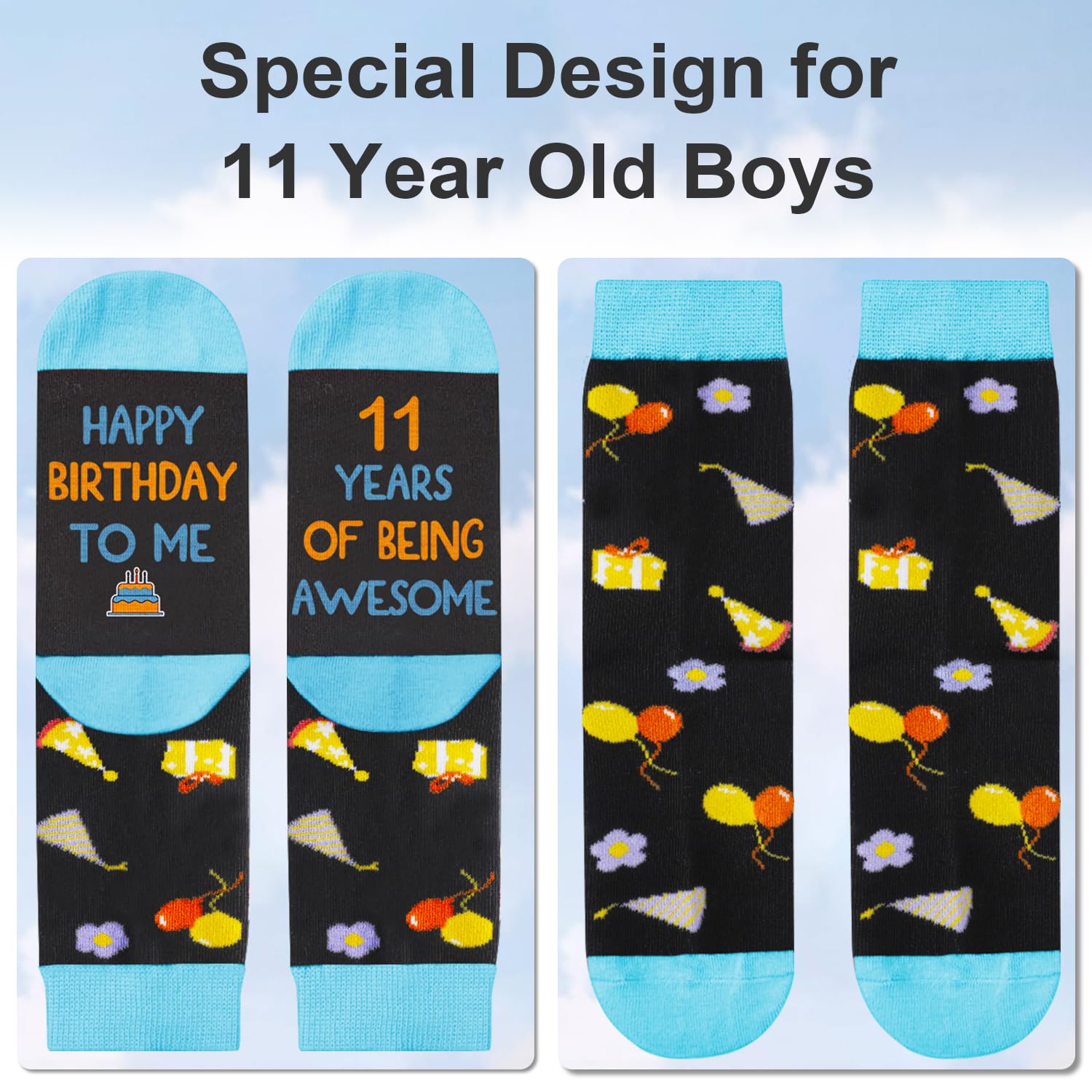 Socks for 11 Year Old Boy Design: Our socks are predominantly black, blue and Orange, jacquard birthday gifts, balloons, cakes, and other birthday elements on the top, while Hidden message of encouraging message on the bottom: "HAPPY BIRTHDAY TO ME 11 YEARS OF BEING AWESOME" the young and energetic design, Suitable for 11th Birthday gifts, Christmas gifts, New Years Gifts