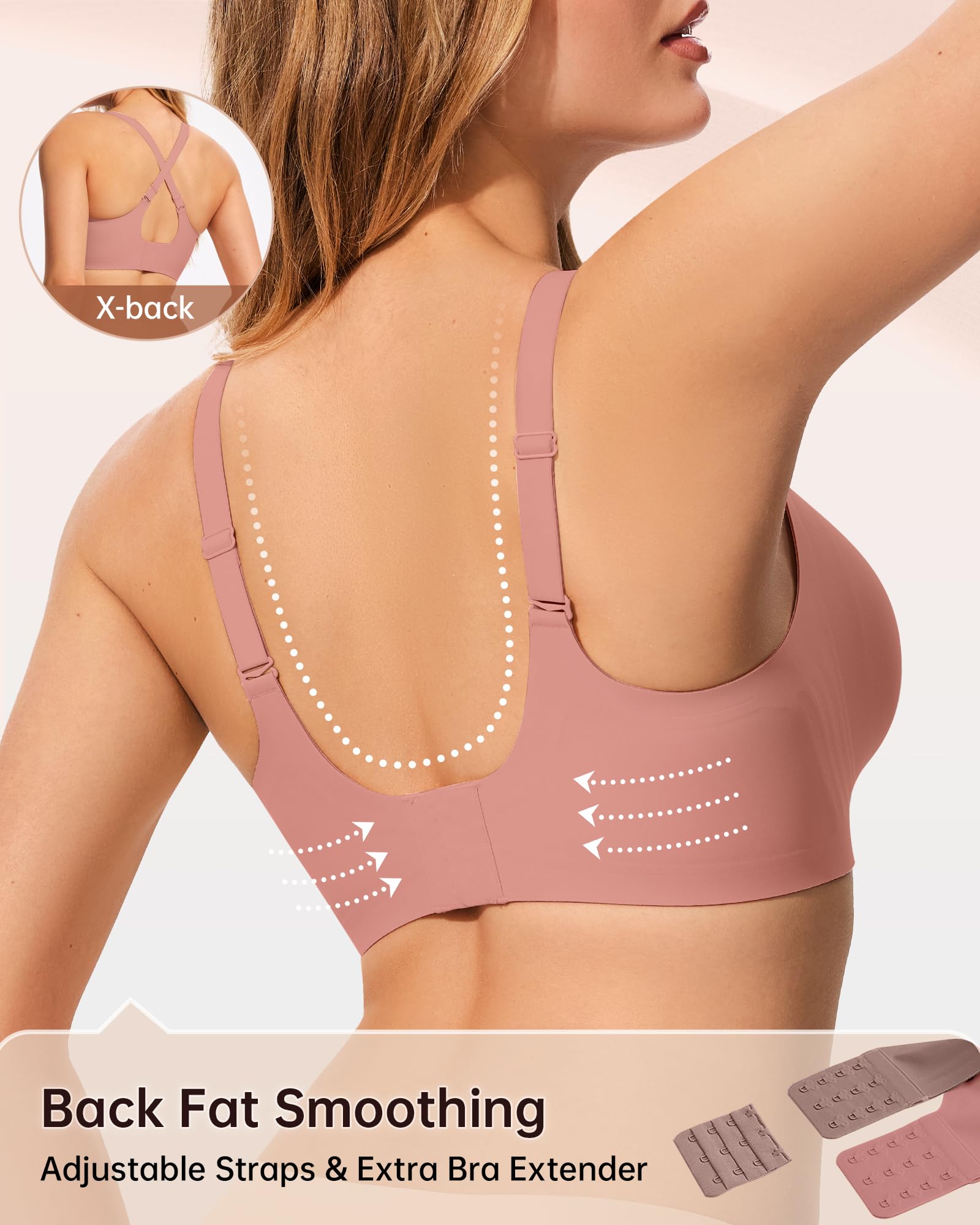 【Back Smoothing Comfortable Bras for Women】LetsJoli bras for women full coverage feature an invisible back closure design, with wider side wings that smooth underarm and back lines, ensuring a beautifully contoured silhouette. Featuring a back hook design with 4 rows and 3 hooks, and an additional extended hook included. The ample adjustable length allows the bra to seamlessly accommodate fluctuations in breast size and waist circumference
