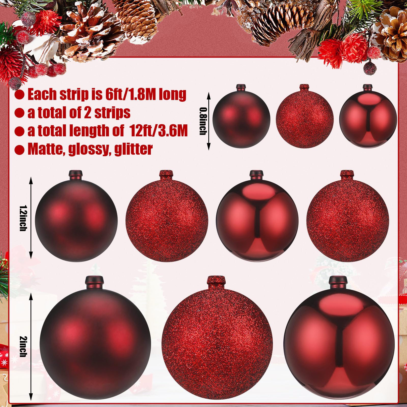 Features: These Christmas garland balls make for the ideal gifts during the holiday season. Their exquisite design and quality construction stand out, bringing the charm of Christmas to your home. The lively burgundy color of our Christmas ball garland ball ornaments will blend well with your Christmas themes, amplifying the festive cheer. Their vibrant color will create a heartwarming Christmas scene. Specifications: Material: plastic Color: burgundy Size: approx. 6.6 ft in length of each garland Package includes: 2 Pcs Christmas bulb garlands Notes: Manual measurement, please allow slight errors on size. The color may exist a slight difference due to different screen displays.