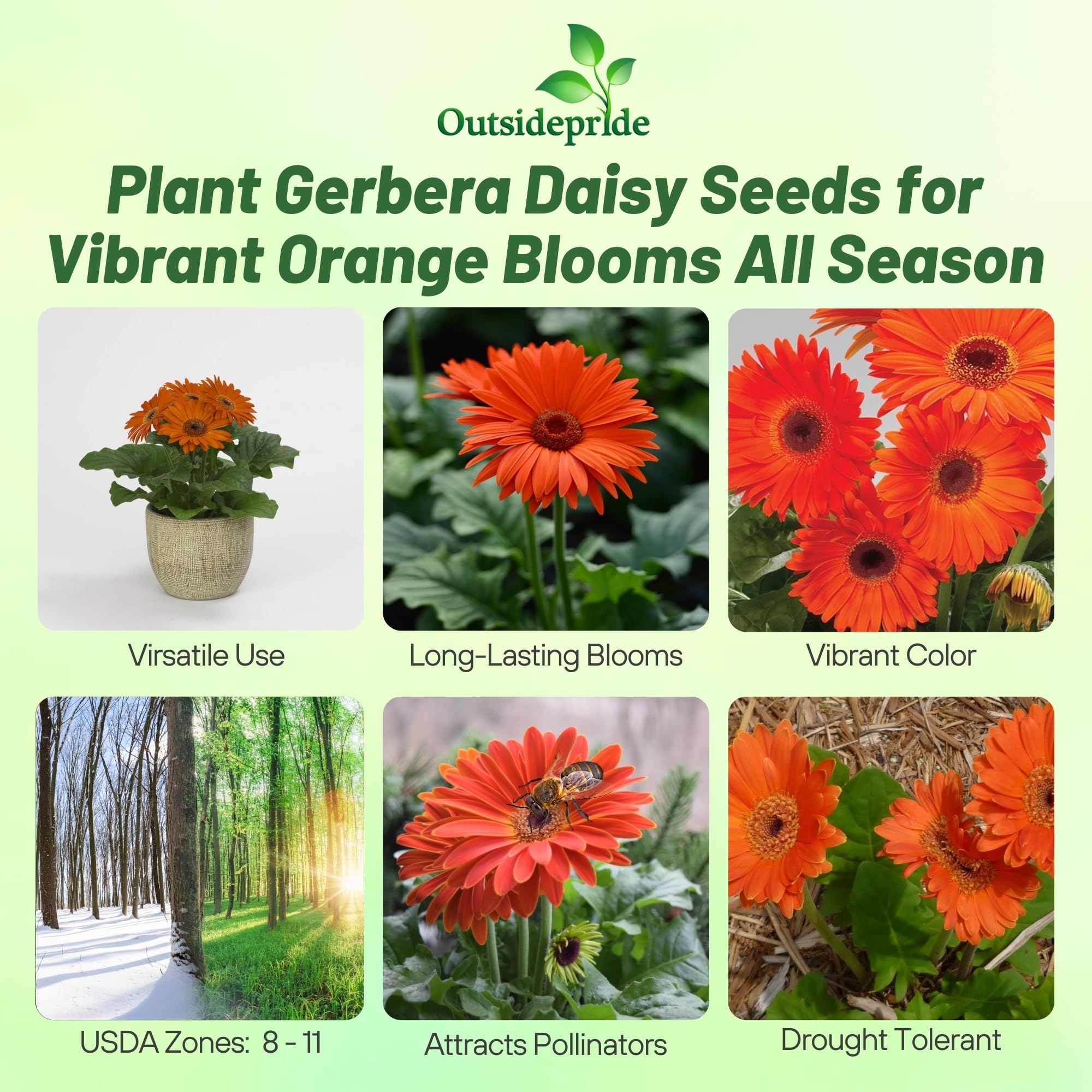 VIBRANT MOUNDED BLOOMS: Brighten your garden with the stunning colors of Pastel Orange Gerbera Daisy Seeds in vibrant orange shades. With mounding foliage, our large dazzling flowers add a pop of charm and elegance, transforming any indoor and outdoor space into a colorful oasis. Perfect for garden beds, pots, or as cut flowers, their bold, eye-catching appeal is sure to impress.