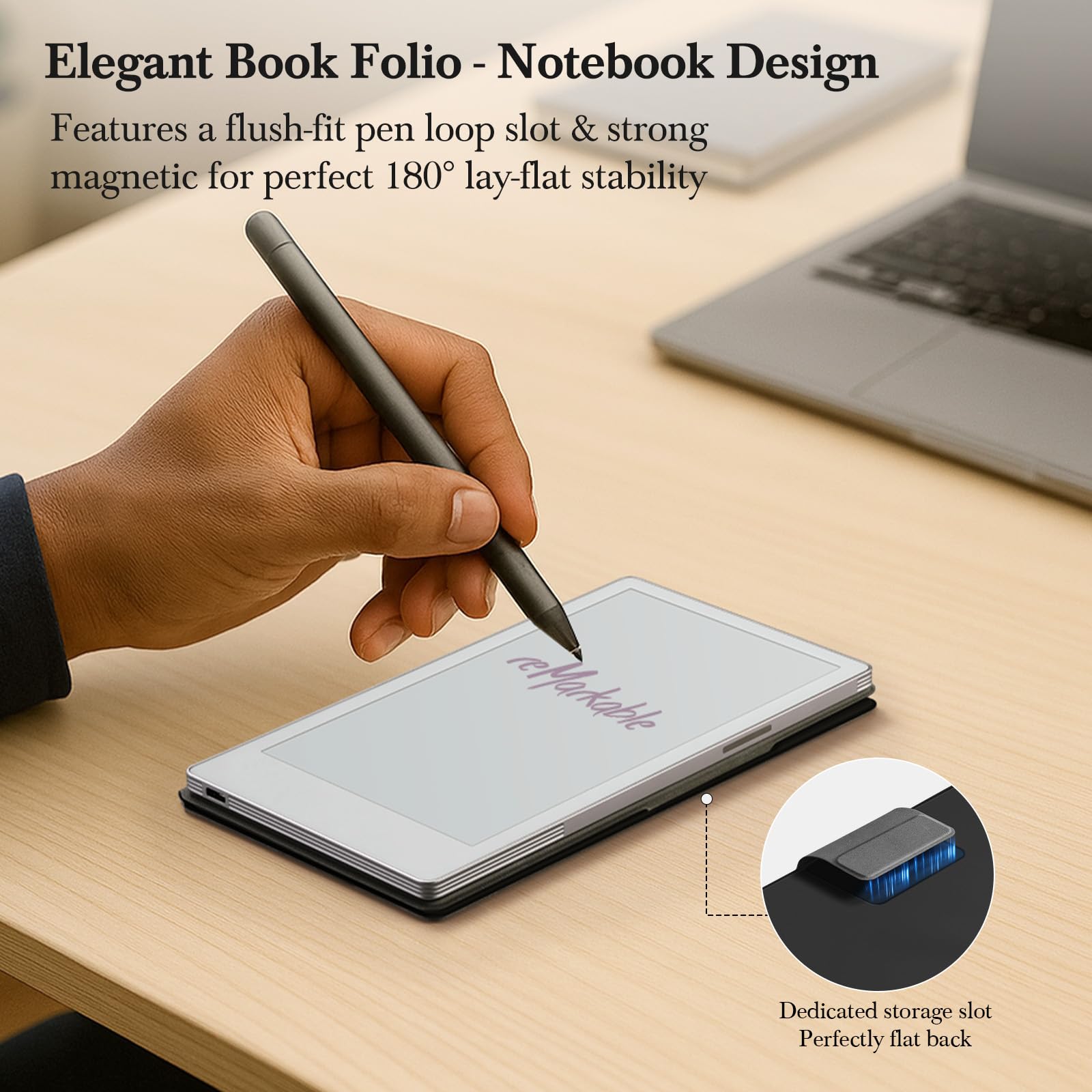 【All-in-One Design: Pen Loop + Professional Folio】: The dedicated pen loop features a magnetic back slot that keeps your Marker securely stored while maintaining a perfectly flat surface. This innovative design enables seamless 180° lay-flat positioning and stable desktop sharing during meetings. Combined with the elegant notebook-style folio, it offers complete portability, protection, and practicality—keeping your workspace organized and your reMarkable always ready for professional use.