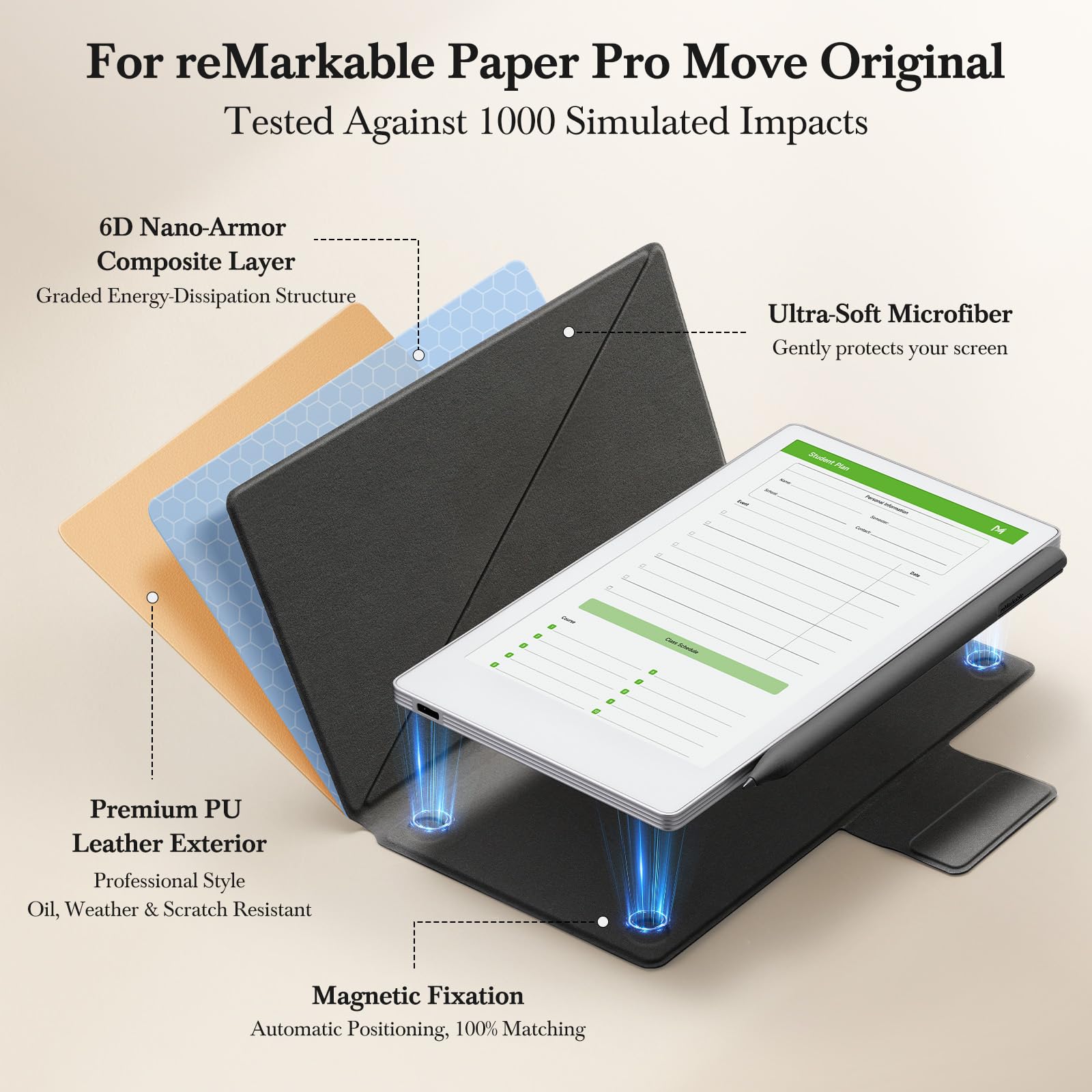 【Precision-Engineered for Remarkable Paper Pro Move Original】: Crafted with meticulous attention to detail, this case is born for the Remarkable Paper Pro Move. It achieves a 100% gap-free fit with precisely aligned ports. The integrated magnetic system features perfectly balanced magnetism, ensuring a secure, "shake-proof" hold that remains effortless to open and close.