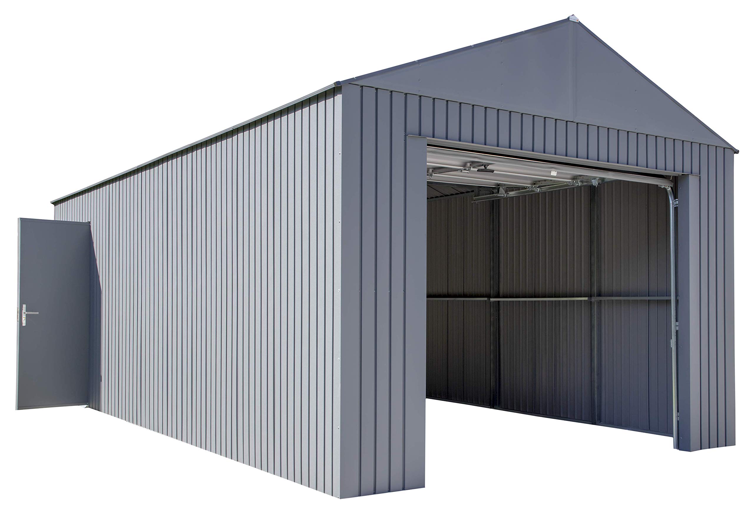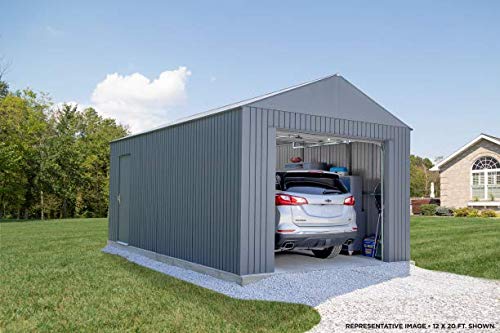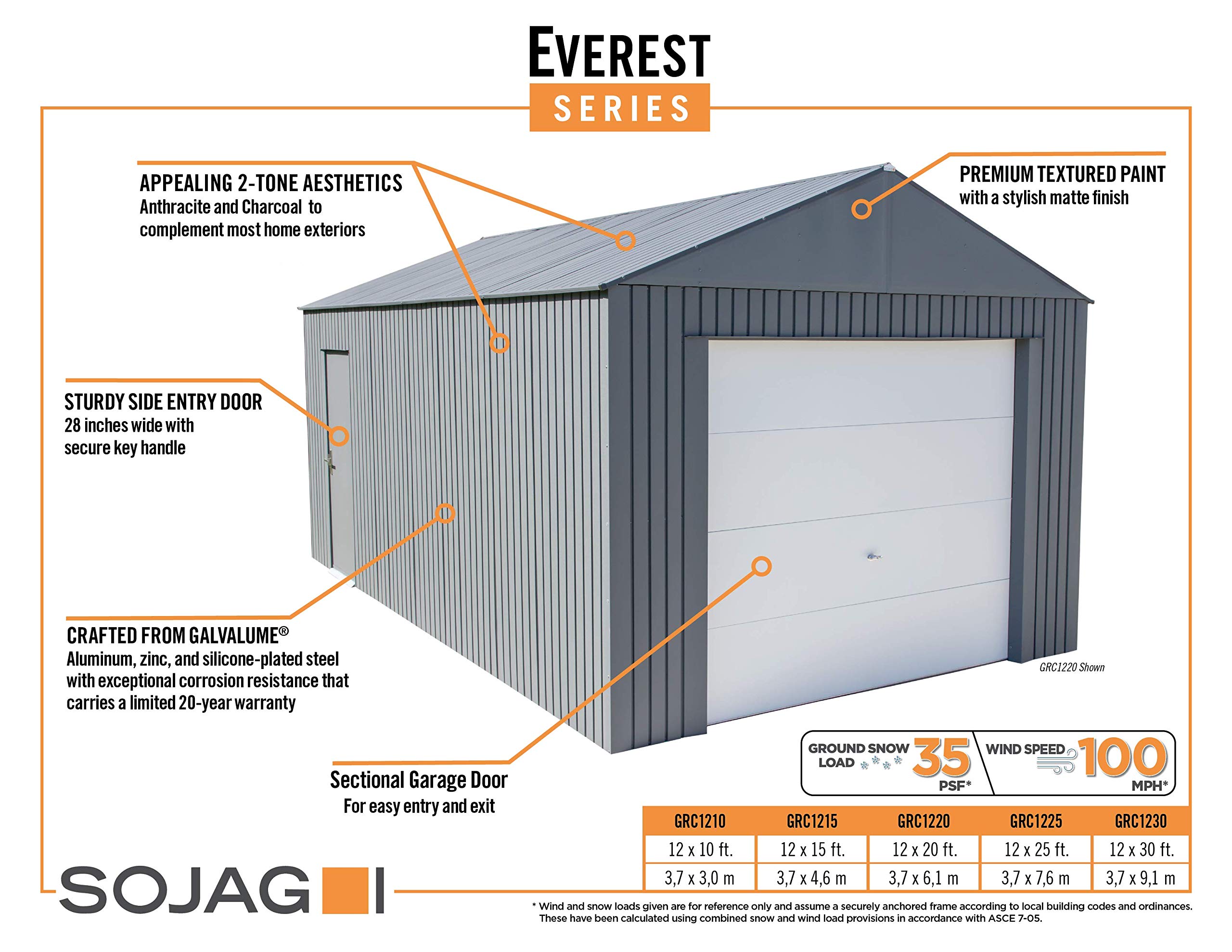 The Everest Garage Series is a stylish, premium garage from SOJAG. The Everest is made strong and sturdy. Constructed with Galvalume steel, a tough and durable blend of aluminum, zinc, and silicone, that stands up to rust and corrosion. The outdoor garage structure is backed by a 20 year limited warranty. A new panel profile design provides a stronger steel garage and has a wind speed rating of 100 MPH. The truss system offers 35 PSF ground snow load ratings so your garage stands up to tough weather and the elements. The 12’ x 25’ garage building comes with premium features to complement its strength and style. Features a premium textured neutral paint with a matte finish. The neutral colorway is perfect for any exterior. A sturdy side entry door provides a 28” wide entryway and includes a metal handle with a secure key lock. Your items will be stored securely and stylishly. With extra-tall 94” walls and an 8’ x 7’ sectional garage door, you can stack stored items high and park large trucks and SUVs with ease. The Sojag Everest garage comes with pre-cut, pre-drilled, and numbered parts for easy assembly. If you need more space, the Everest comes with 5-foot expandable extensions to customize the length and provide up to 100 feet long of space. The SOJAG Everest Garage will provide strength and style for years to come. ASSEMBLY TIME: 4 people are recommended for assembly and approximately 16-20 hours EXTERIOR GARAGE DIMENSIONS: 12’ x 25’ x 10’ GARAGE WALL HEIGHT: 7’10” SECTIONAL DOOR (WxH): 7’11” x 6’x11” TOTAL STORAGE AREA: 292 sq. feet GARAGE COLOR: Charcoal DOOR COLOR: White GABLE COLOR: Charcoal ROOF COLOR: Anthracite MATERIALS INCLUDED: Steel Hardware Garage Door Manual Fasteners