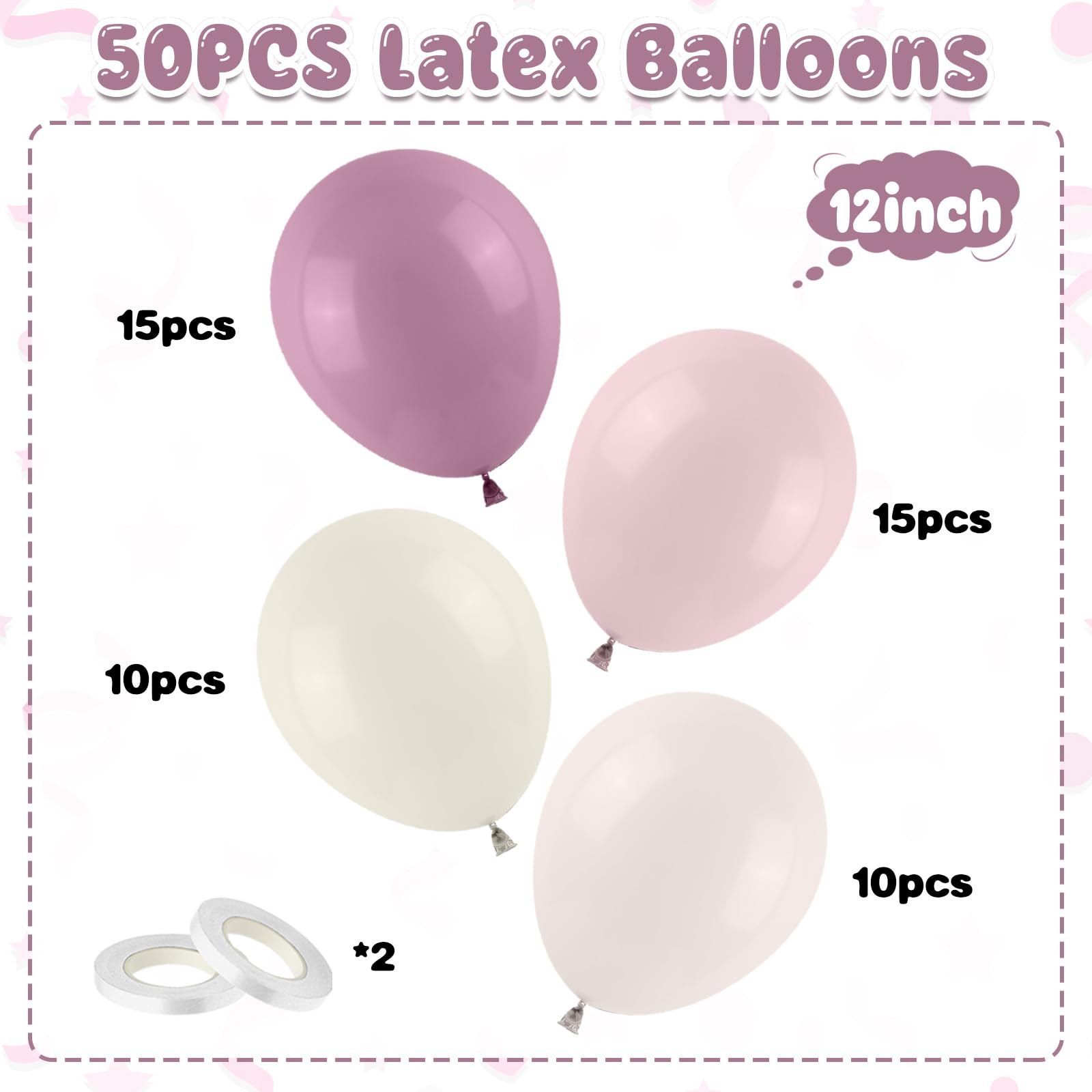 12Inch Dusty Pink Purple Balloons: include 15* mist pink balloons, 15*retro taro purple balloons, 10* sand white balloons, 10*ivory white balloons, 2 * ribbon. Our purple pink party balloons can be used to DIY hula hoop balloon garlands and then used to decorate dessert tables, or can be hung on the wall for decoration, or used as photo props.