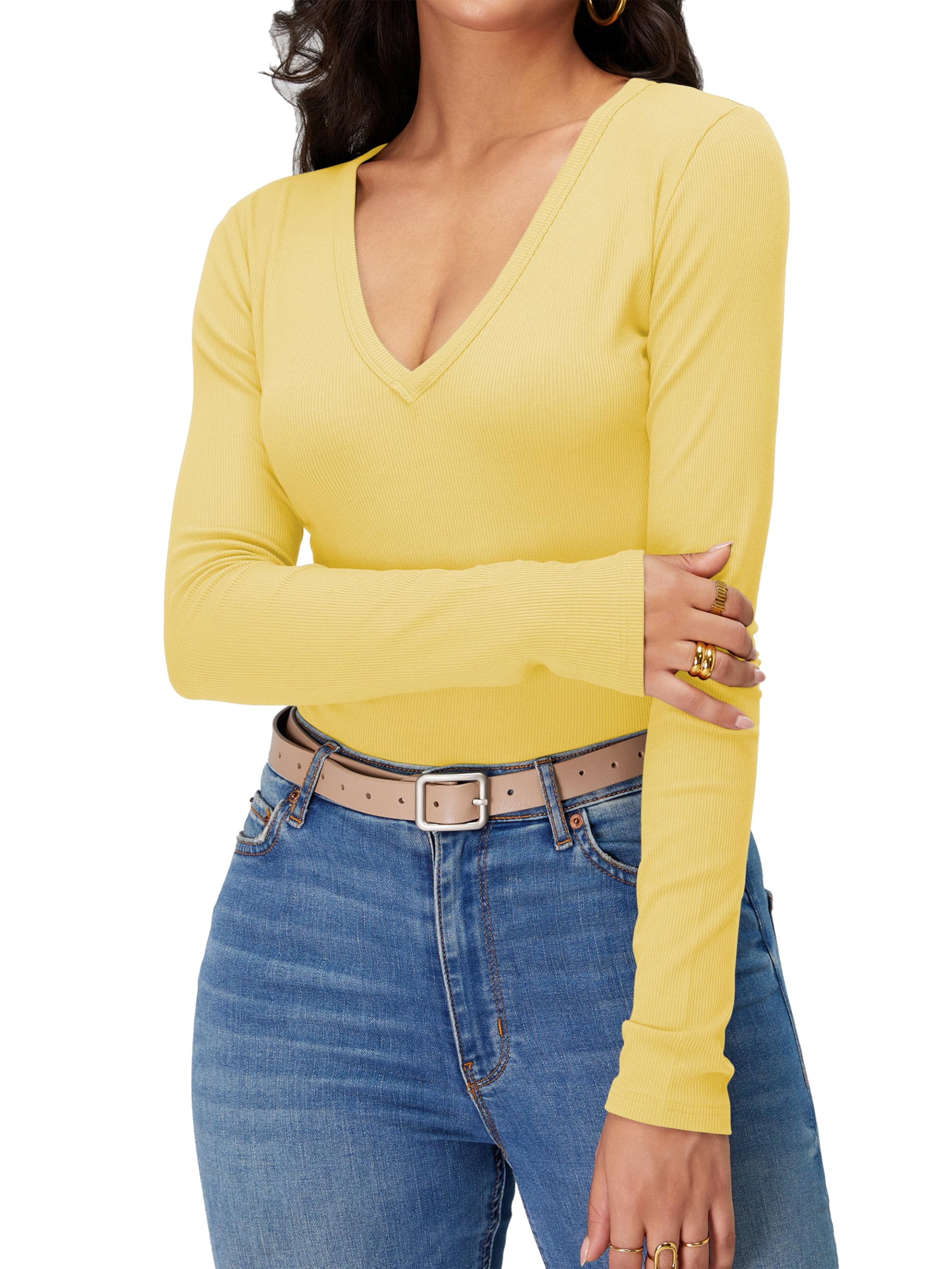 Features: Long sleeve, V-Neck, Solid color, Slim fit, Ribbed knit, Simple and Basic Tops for daily. It's Comfy Against the Skin, Nice for Laying or Inter Hoodies/Shackets.