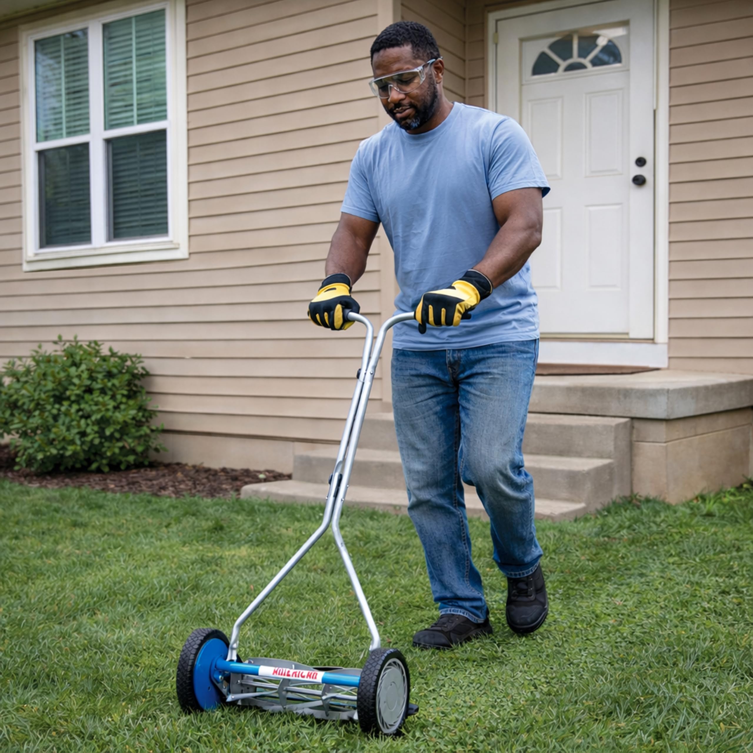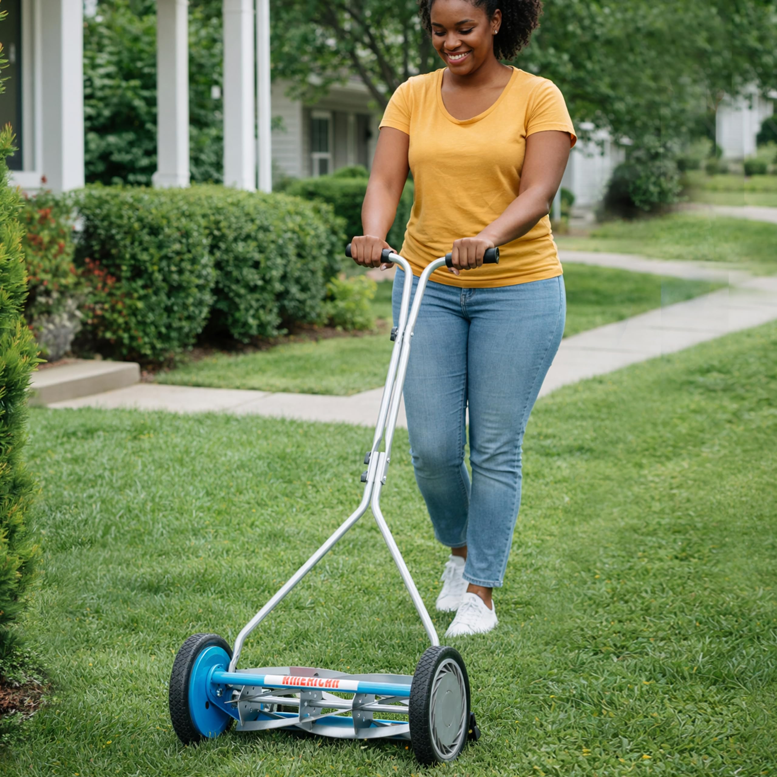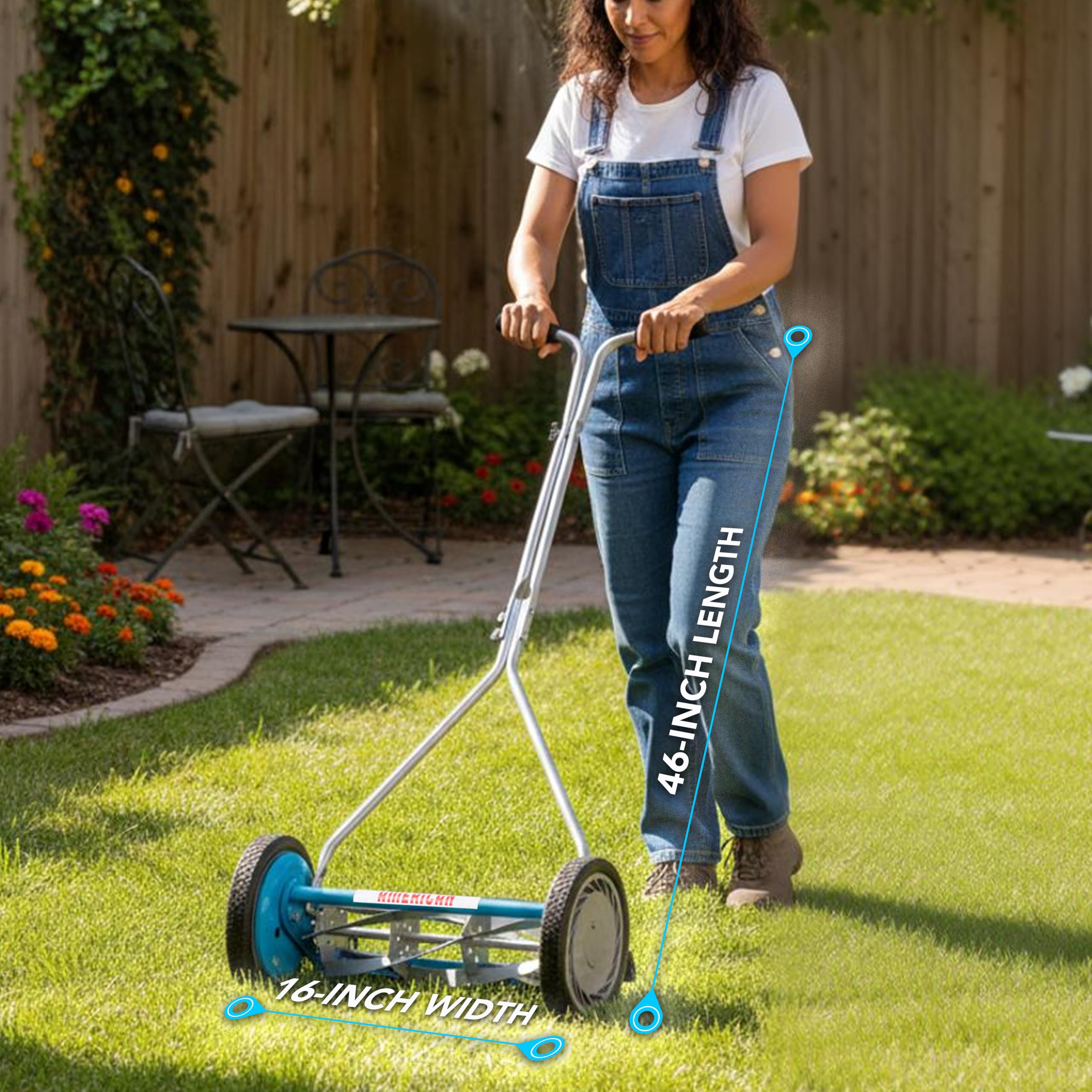 Manual push design requires no gas, oil, batteries, or cords—quiet, clean, and low maintenance.