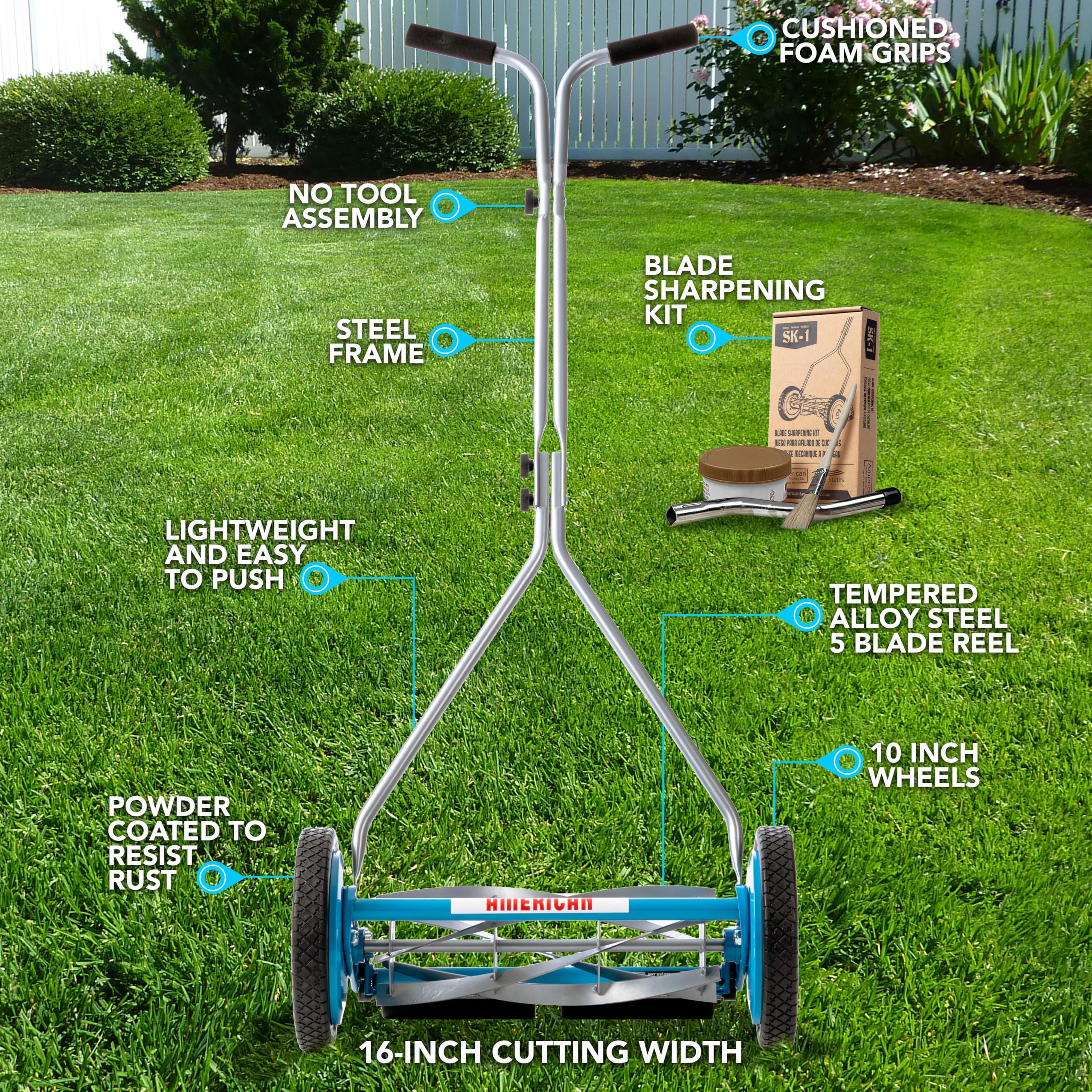 Enjoy a cleaner, quieter, and more environmentally friendly way to care for your lawn with this 16-inch 5-blade reel mower. Designed for smooth, scissor-like cutting action, the heat-treated alloy steel blades deliver a precise, healthy cut that helps your grass grow thicker and greener—without relying on gas, oil, batteries, or cords. The mower’s 16-inch cutting width provides efficient coverage, making it ideal for small to medium-sized yards. Its lightweight, easy-push design ensures comfort and maneuverability, while the adjustable cutting height allows you to tailor your lawn’s look throughout the season. To keep your mower performing at its best, this package includes the SK-1 Sharpening Kit, giving you everything you need to maintain sharp, high-performing blades from home. Regular sharpening extends blade life, improves cut quality, and keeps your mower running smoothly year after year.