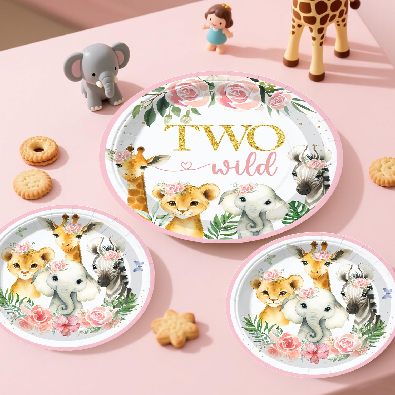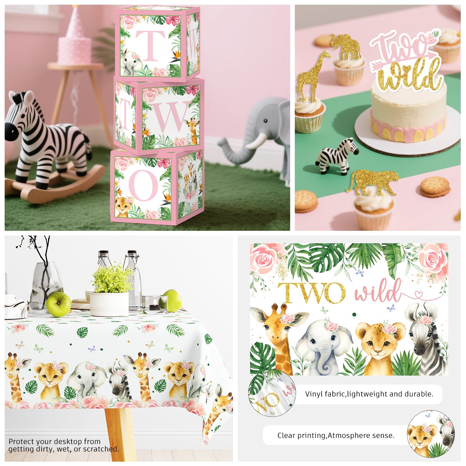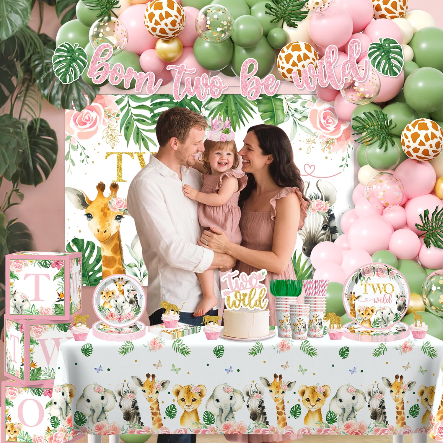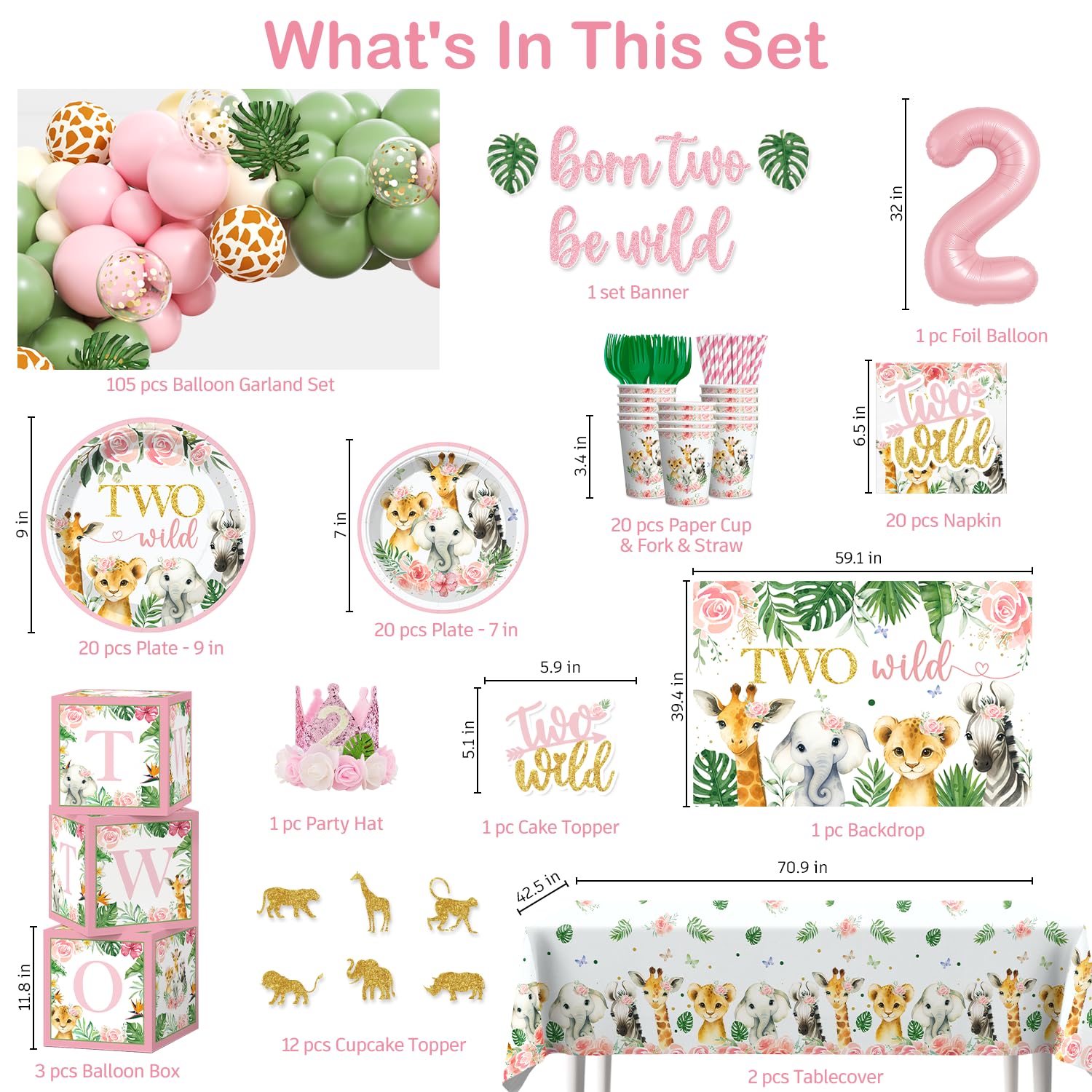 Complete Two Wild Birthday Decorations Girl: Our animal 2 year old birthday decorations girl can meet all the needs of a born two be wild party, including 1 "born two be wild" banner, 1 two wild backdrop, 1 cake topper, 1 32" number balloon "2", 12 cupcake toppers, 1 two wild crown, 2 jungle theme 2nd birthday tablecloths, 3 balloon boxes, 20 7-inch plates, 20 9-inch plates, 20 napkins, 20 paper cups, 20 forks, 20 straws, 80 pink, green and safari latex balloons in 3 different sizes