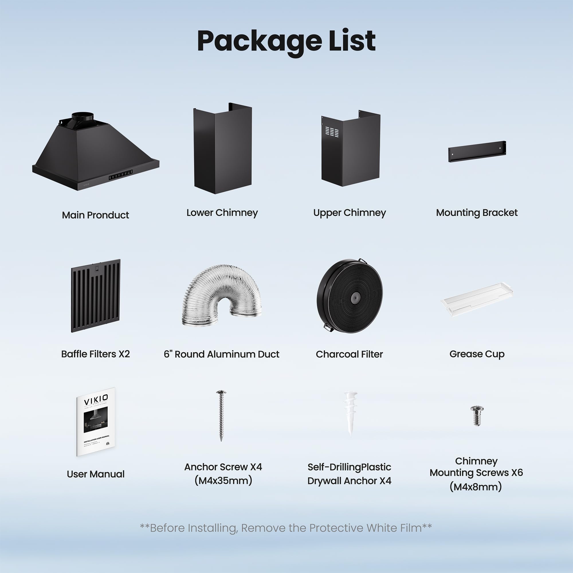 【What You Will Get】 Include: 1 x 6" round duct adapter *1, 6" stove pipe *1, activated carbon *1, stainless steel filter baffle *2, installation screw kit *1, installation manual *1. Our stove hood is protected with sturdy packaging to ensure it arrives undamaged during transit. Feel free to contact us on our 24/7 online customer
