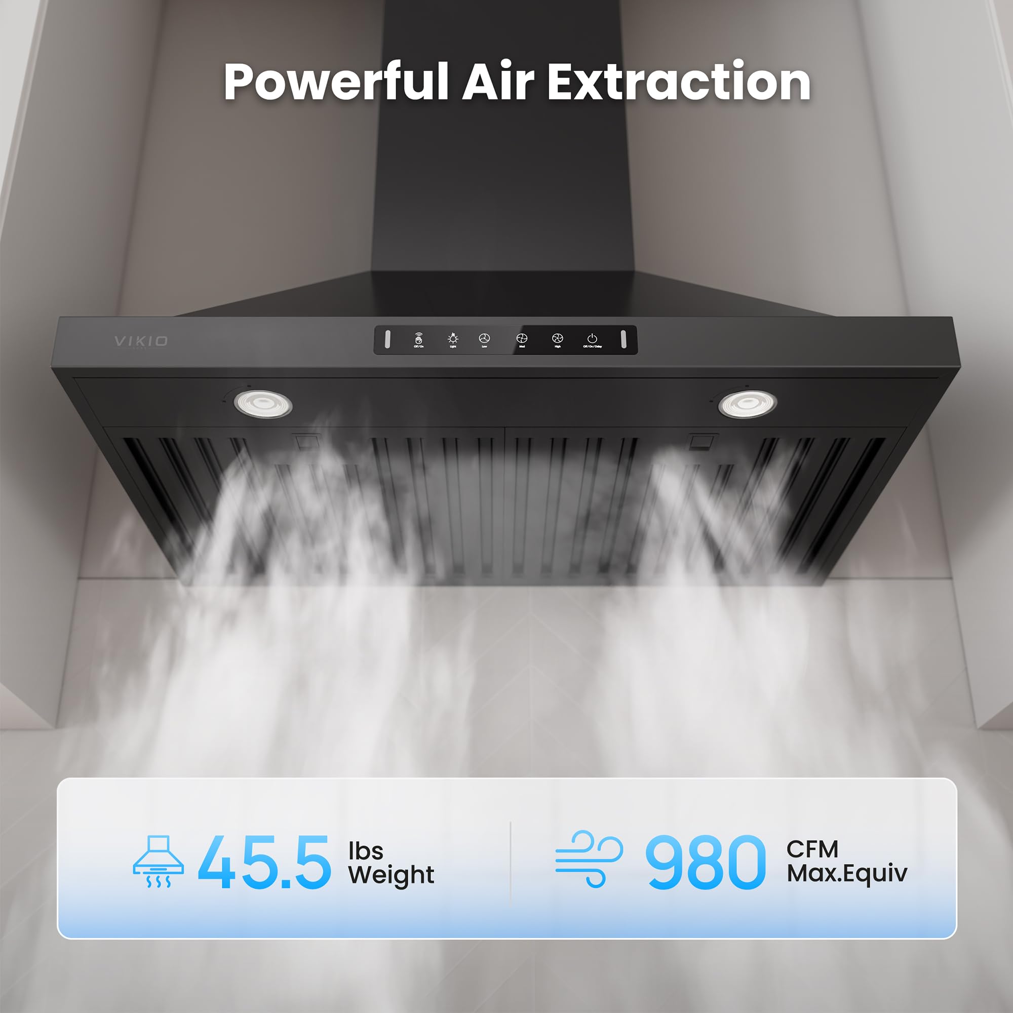 【980 CFM Suction Power, Designed for Spacious Kitchens】Engineered for serious cooking, our 30 inch wall mount range hood Cleans air in a 180 sq ft area every minute (40% more than standard).3 speeds conquer heavy smoke from frying, searing, or wok cooking. Ideal for spacious kitchens.