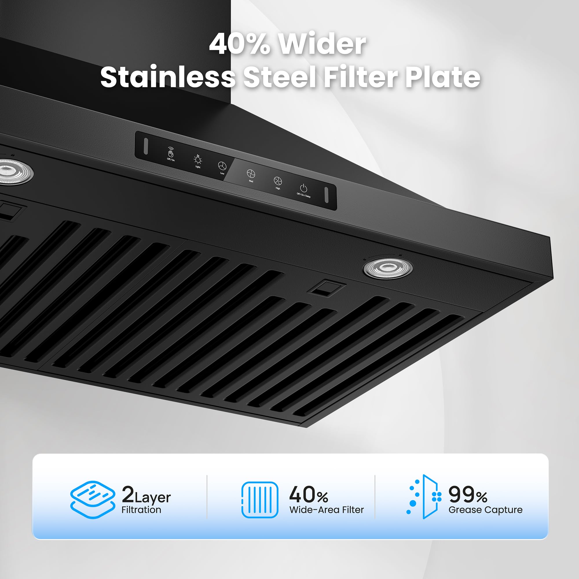 【40% Wider Filter Locks Away Grease】The wider stainless steel baffle filter provides 40% more trapping surface than standard. Its efficient curved design captures up to 99% of grease on the panels, reducing buildup on the fan and motor to help sustain powerful airflow and extend the range hood lifespan.