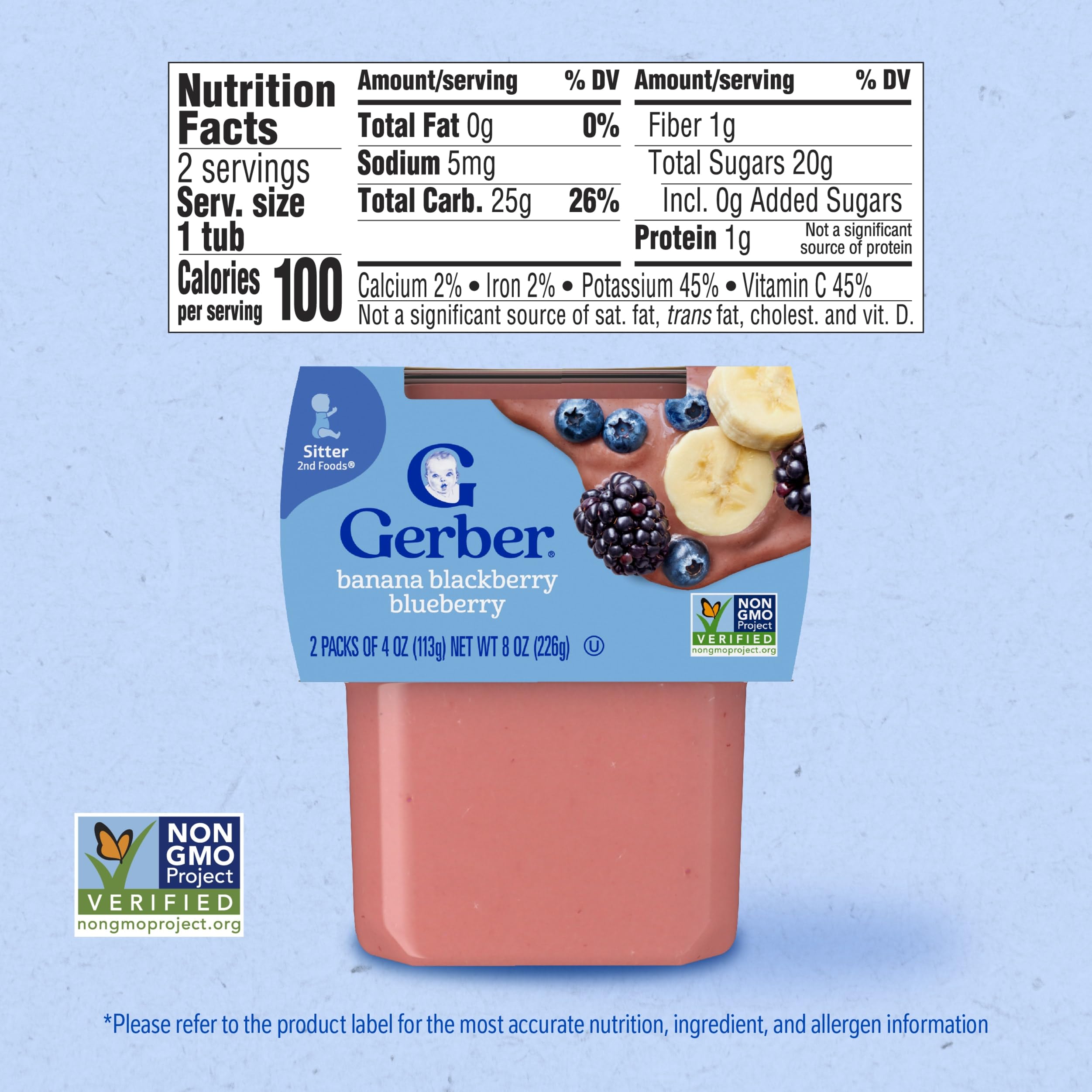 Gerber Stage 2 Baby Food, Banana Blackberry Blueberry Puree Tubs are a premium choice for your child’s early stages. Crafted to help support their nutritional needs, along with meeting the busy lifestyle needs of caretakers and parents. Each baby puree tub comes in a portable, easy-to-store format – making it perfect for life’s busy moments. This stage 2 baby food puree is designed for babies who are 6 months + and are ready to explore new textures and flavors. Gerber understands the importance of providing wholesome ingredients during the crucial developmental stages of your child's life -- that’s why our baby puree is Non-GMO Project Verified. Gerber baby puree is ideal for parents who seek a convenient and high-quality option in their baby's diet. These tubs need to be refrigerated after opening and must be used after 1 day.