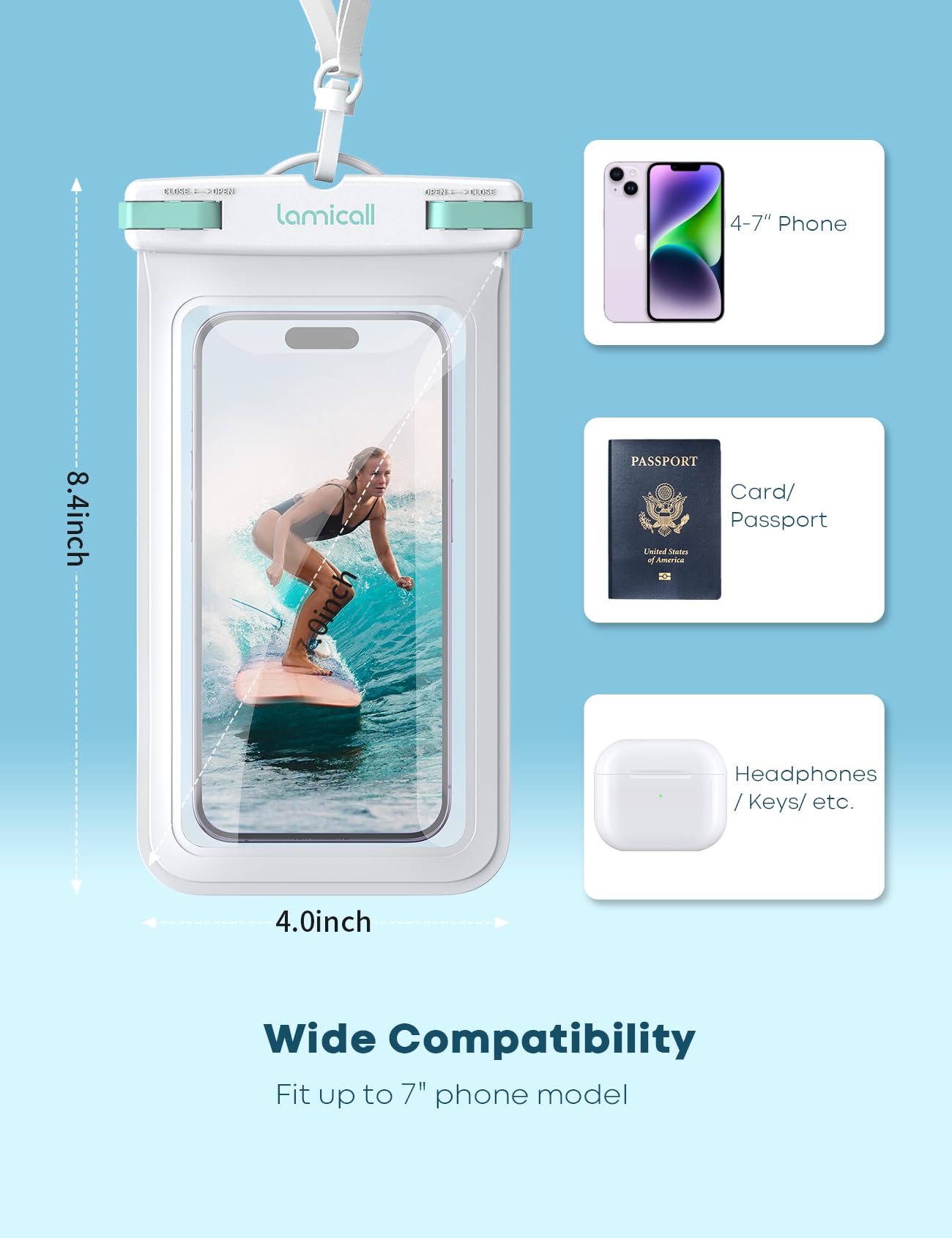 【Universal Compatibility】This waterproof phone bag fits cell phones up to 7 inches, compatible with iPhone 16, 16 Pro, 16 Pro Max, 16 Plus, 16, 15, 15 Pro, 15 Pro Max, 15 Plus, 14 Pro, 14 Pro Max, 14 Plus, 14, 13, 13 Pro, 13 Pro Max, 13 Mini, 12, 12 Pro, 12 Pro Max, 12 Mini, 11, 11 Pro, 11 Pro Max, XS, XS Max, XR, X, 8, 7, 7 Plus, 6, 6 Plus, SE, SE2, android, Galaxy S22, S22 Ultra, S21 Ultra, S21, S20, S10, S9, S8, A72, A71, A52, A51, LG, Moto, Pixel, more devices and ID card, credit cards, cash, passport, etc.