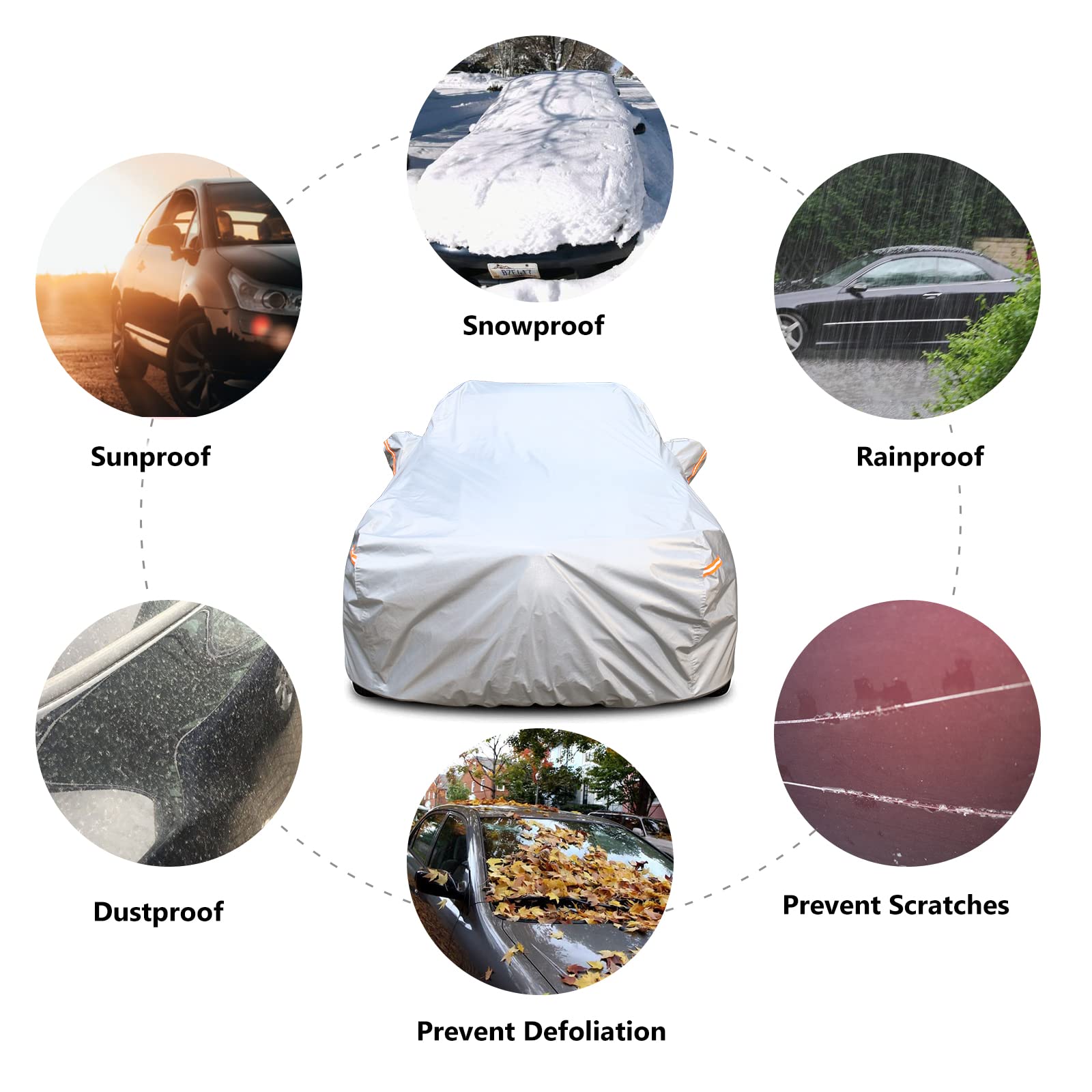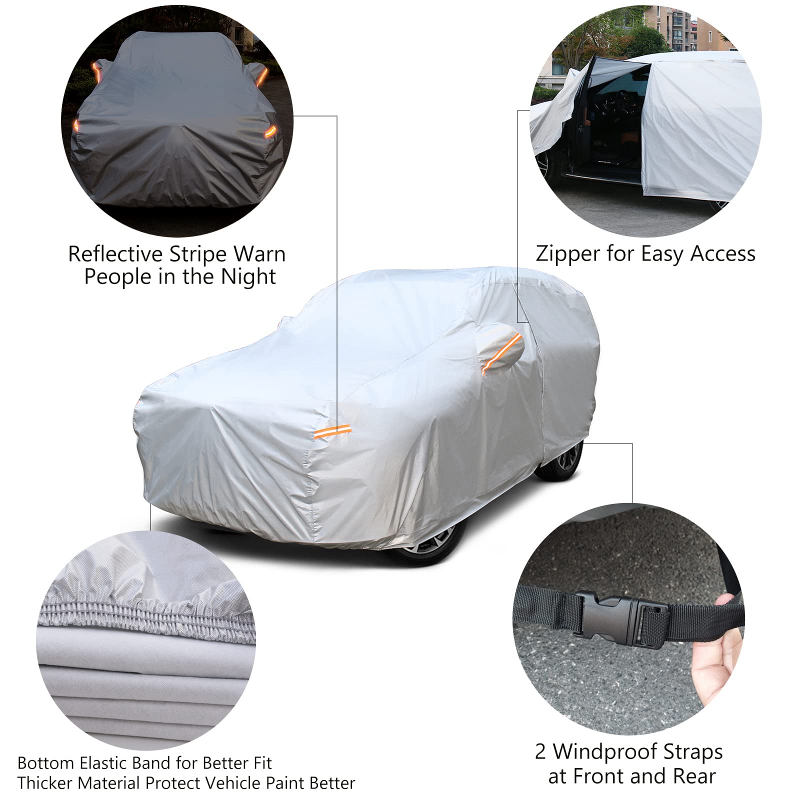 【Car Cover Feature】1) Driver door zipper for quick and easy access when leave something in the car. 2)Double windproof design: the front and rear curled elastic bands to make the car cover fit the body and 2 Windproof straps at front & rear to protect your auto cover by heavy wind. 3) 6pcs full-range reflective stripes warn people in the night. 4) Side mirror covers make the cover fit your vehicle better. 5)The car cover is stitched with double needle and double thread, which is more sturdy.