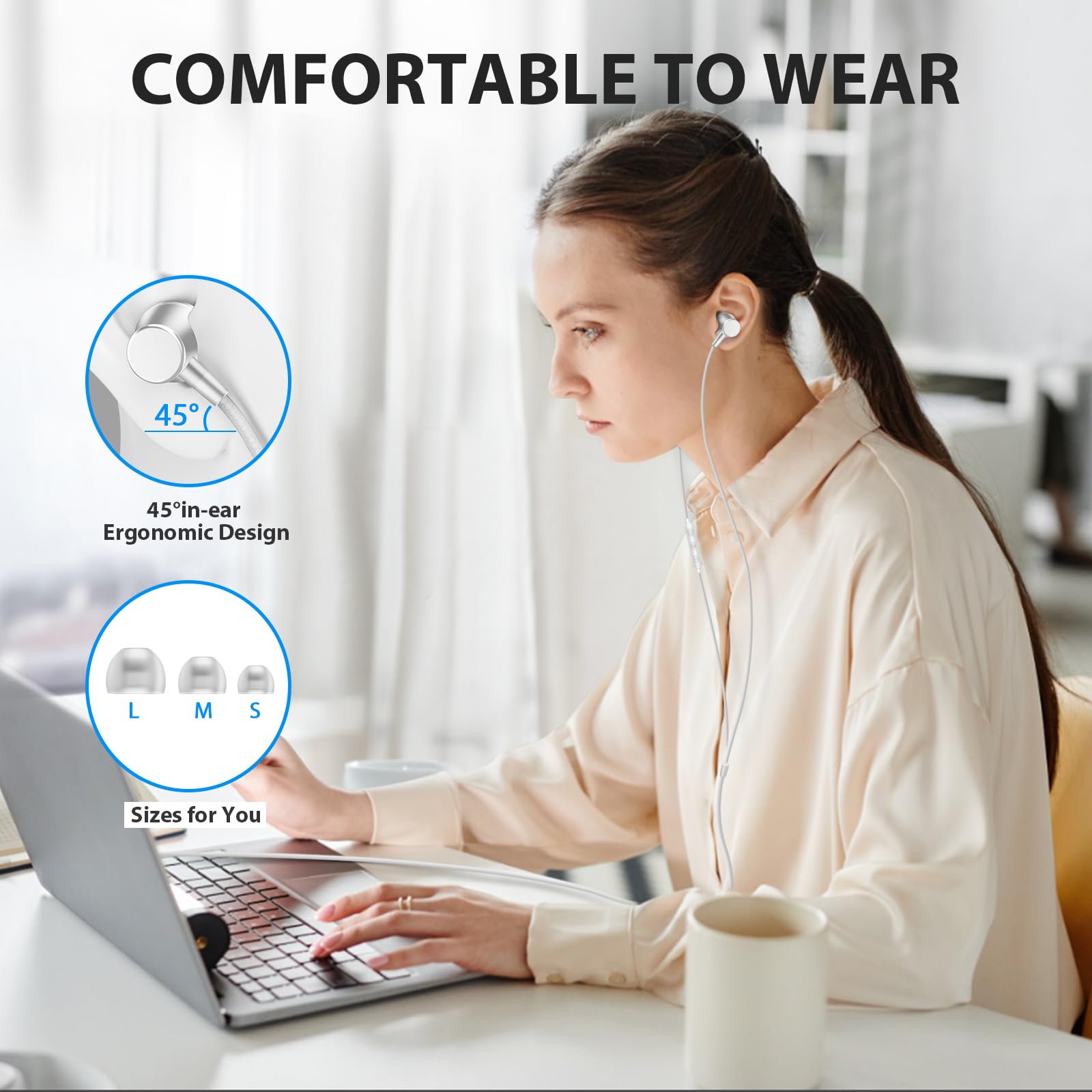 3 Size In-Ear Earbuds : Come with 3 sizes soft silicone eartips (L/M/S), you can choose your size for comfortable fit. Ergonomic semi in-ear earbuds design, no earpress feeling ,no pain in ears after long time wear.45 degrees into the ear, not easy to fall