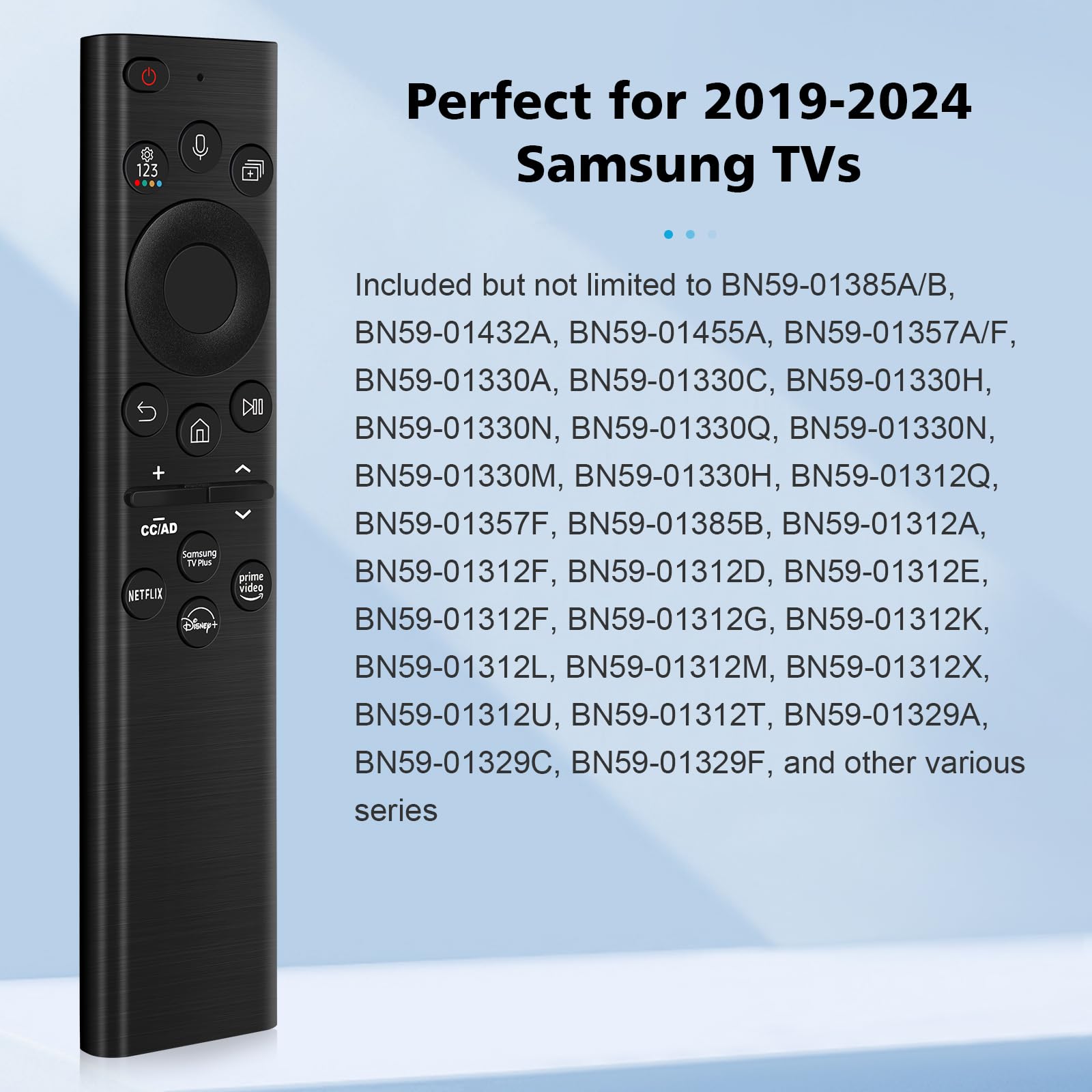 Perfect Compatibility: This universal for samsung tv remote is a perfect replacement for 2019-2024 Samsung voice remote, include but not limited to BN59-01385A/B, BN59-01432A, BN59-01455A, BN59-01357A/F, BN59-01330A BN59-01330C BN59-01330H BN59-01330N BN59-01330Q BN59-01330N BN59-01330M BN59-01330H BN59-01312Q BN59-01357F BN59-01385B BN59-01312A BN59-01312F BN59-01312D BN59-01312E BN59-01312F BN59-01312G BN59-01312K BN59-01312L BN59-01312M BN59-01312X BN59-01312U BN59-01312T BN59-01329A BN59-01329C BN59-01329F, and other various series.