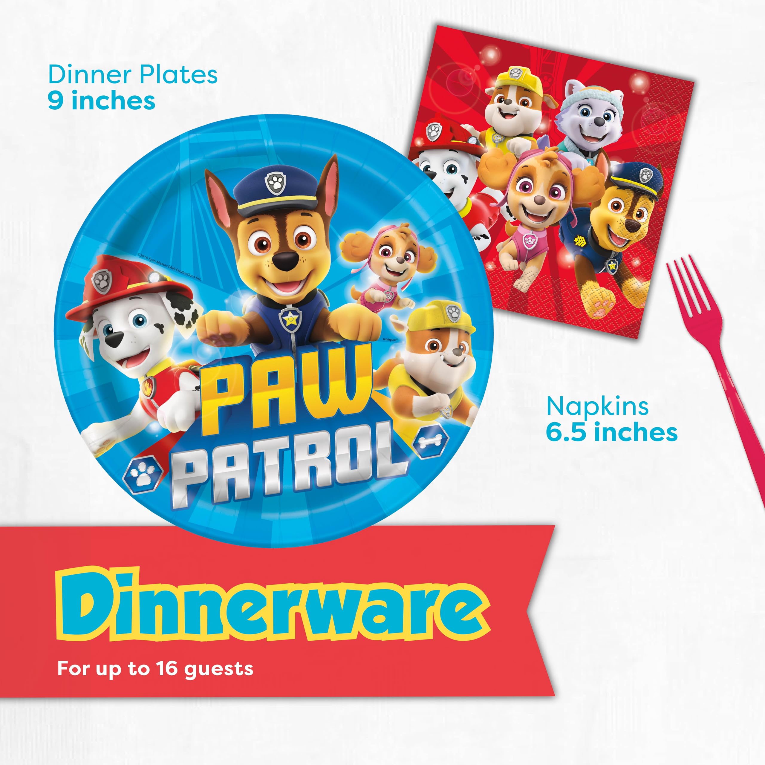 Dinnerware -- This set includes enough Paw Patrol Birthday Party supplies to host a party of 16 guests: 16 large 9" paper plates, 16 paper napkins and 18 coordinating red forks.