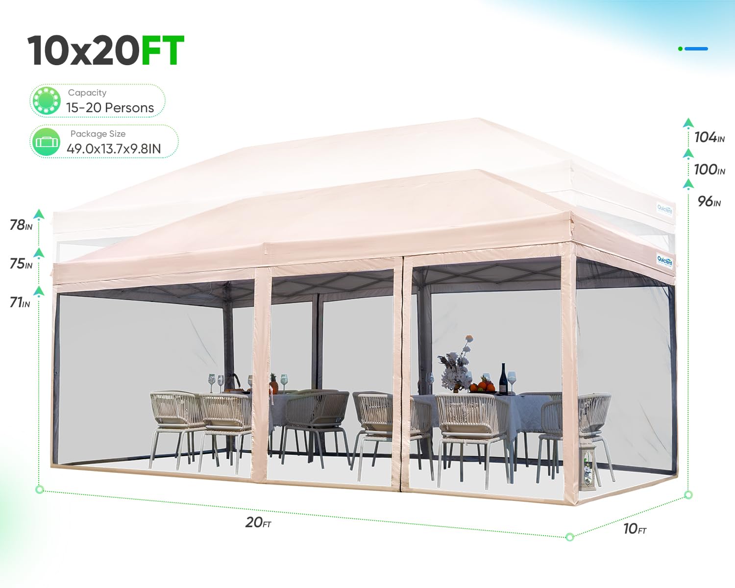 LARGE SPACE:The easy up gazebo with netting is spacious while portable. It measures 10x20 feet,and provides 200 sqft covered space for 16-20 people. This screen room can be fold down to the size of a large duffel bag, making it easy to stow in your car trunk.
