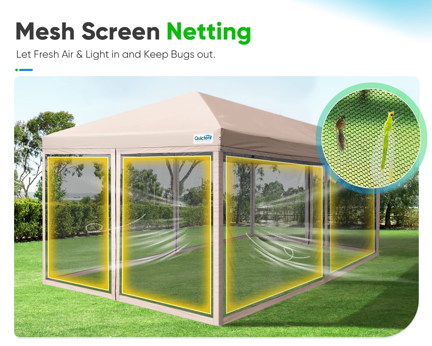 MESH SCREEN NETTING: The canopy tent with netting to keep unwanted elements away and let fresh air & light in. This easy pop up canopy is a perfect screen house to enhance your outdoor living space.