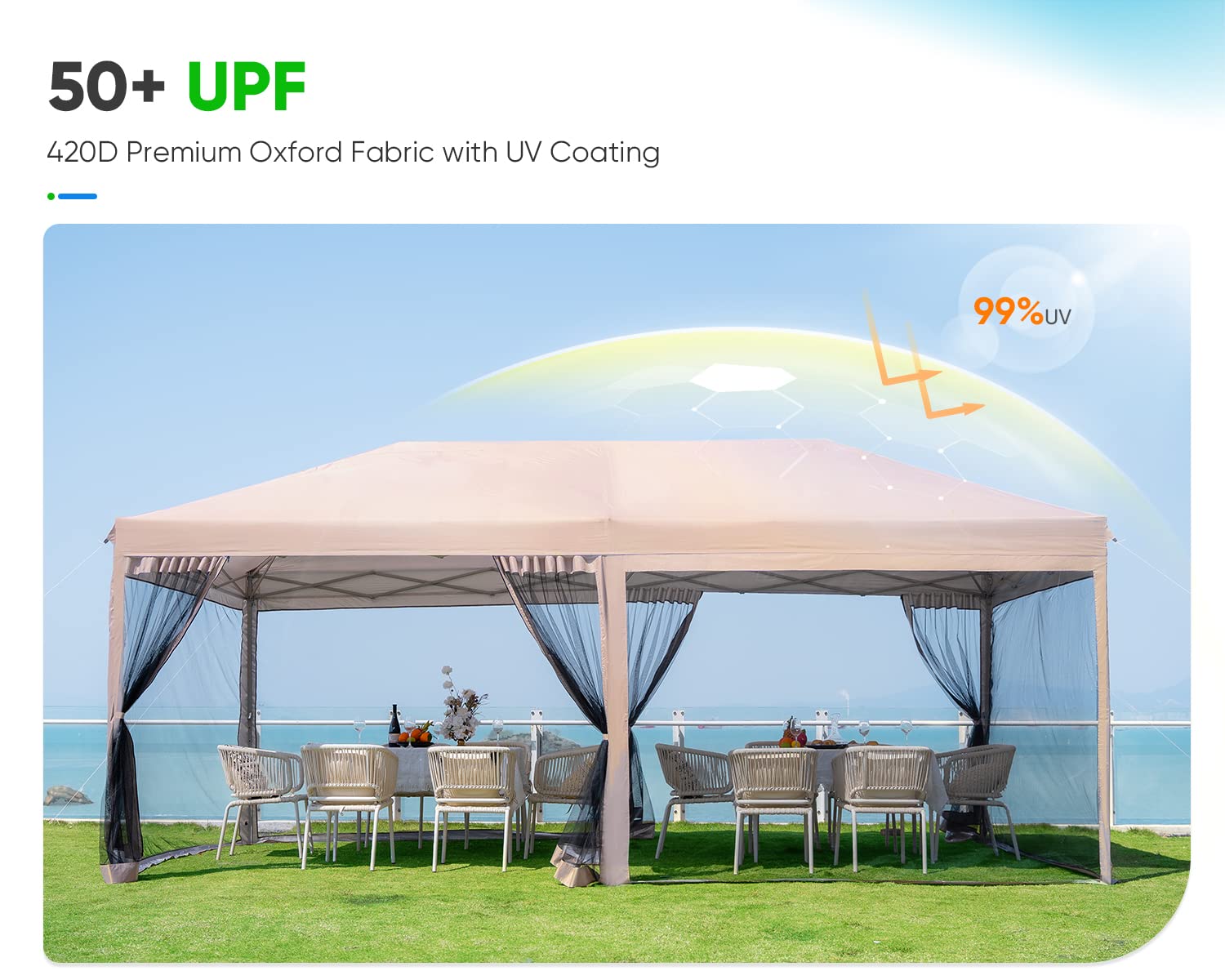 WATERPROOF & ANTI-UV: The 10x20 screened canopy top fabric is made of 420D Oxford with premium UV and PU coating, offering standard UPF 50+ and 99% UV protection,which improves the comfort level of your backyard or patio by keeping you from direct rain and sun.