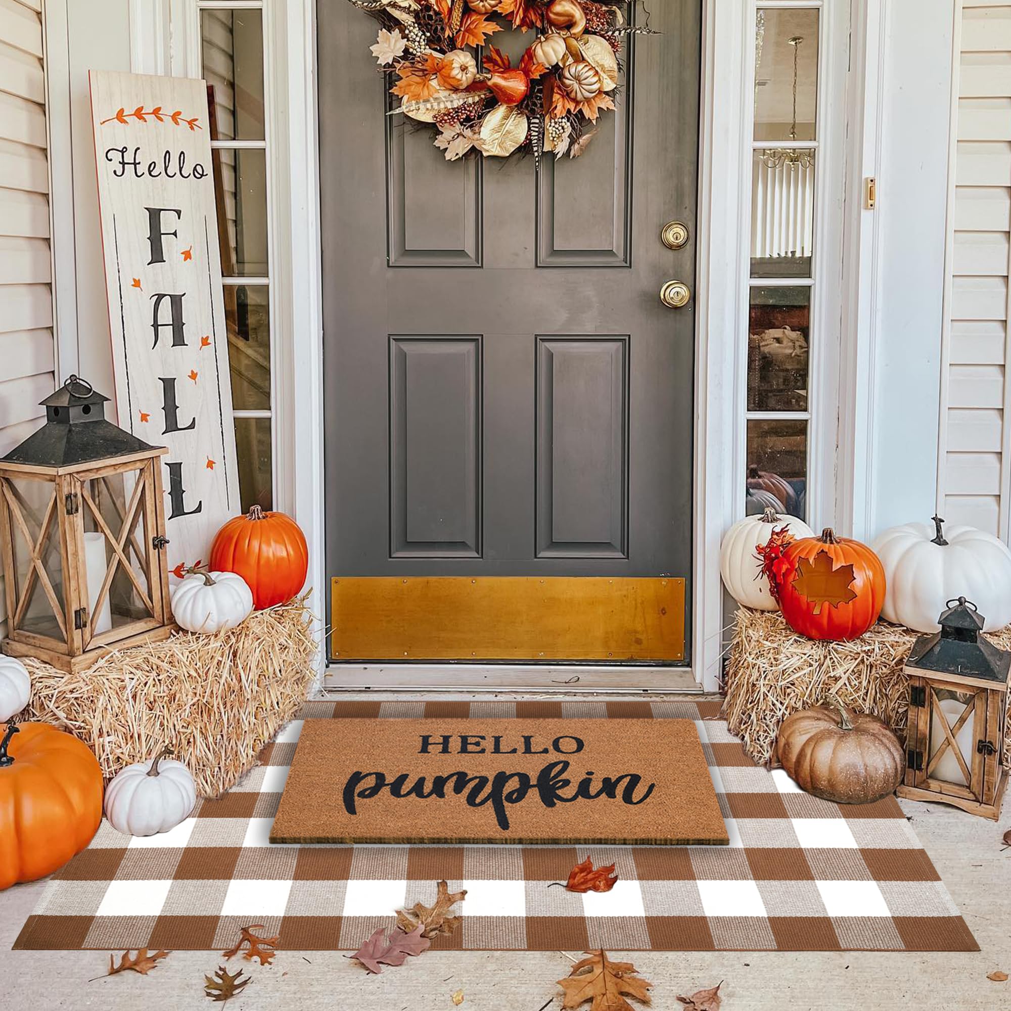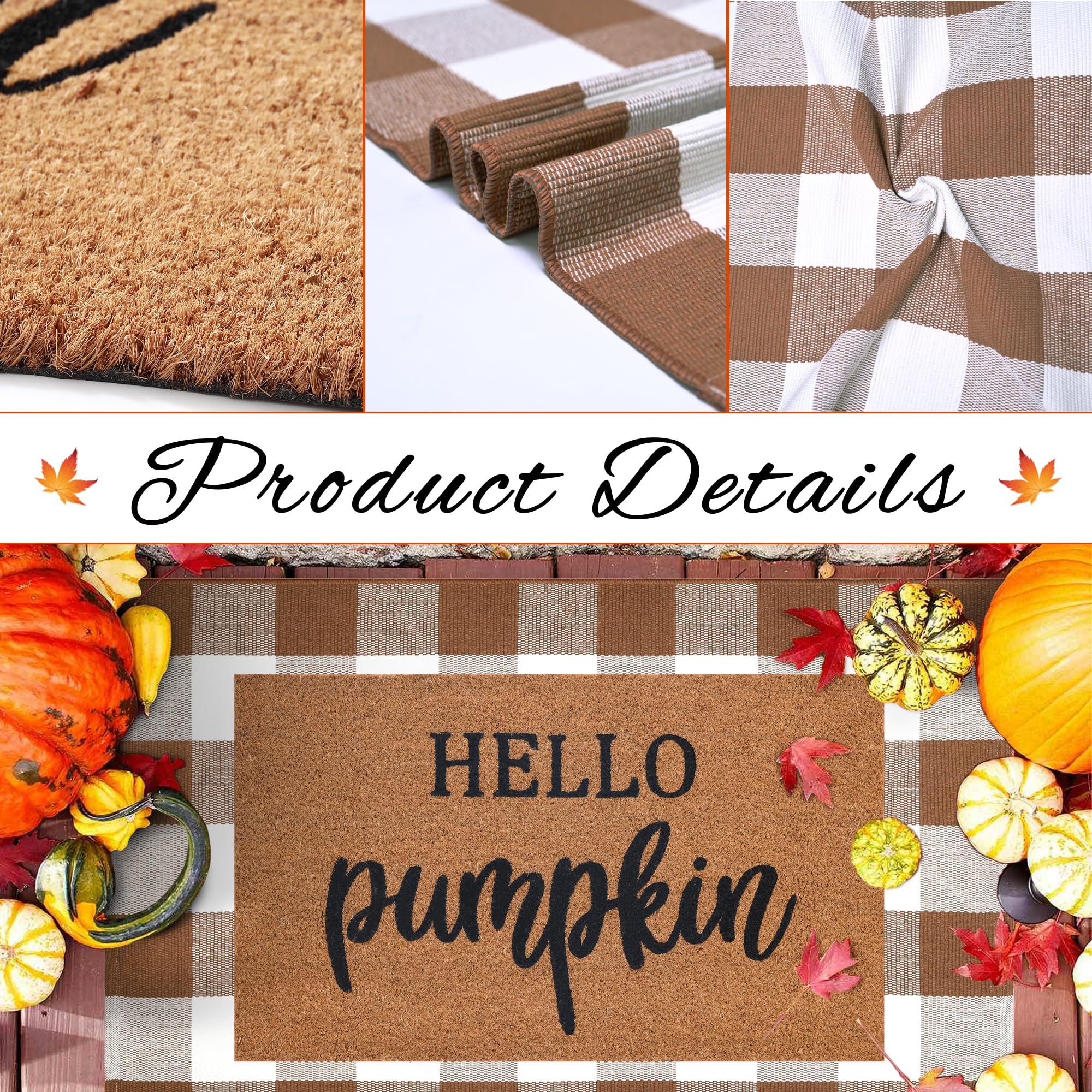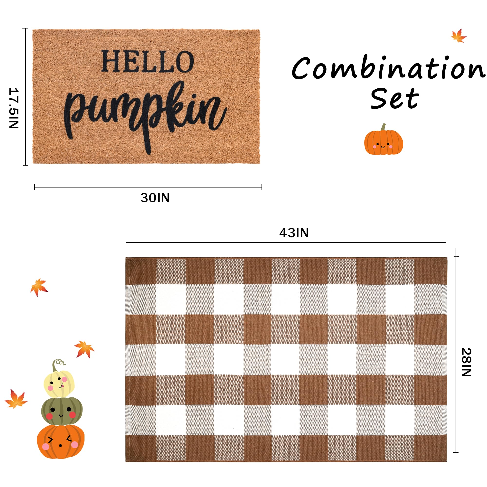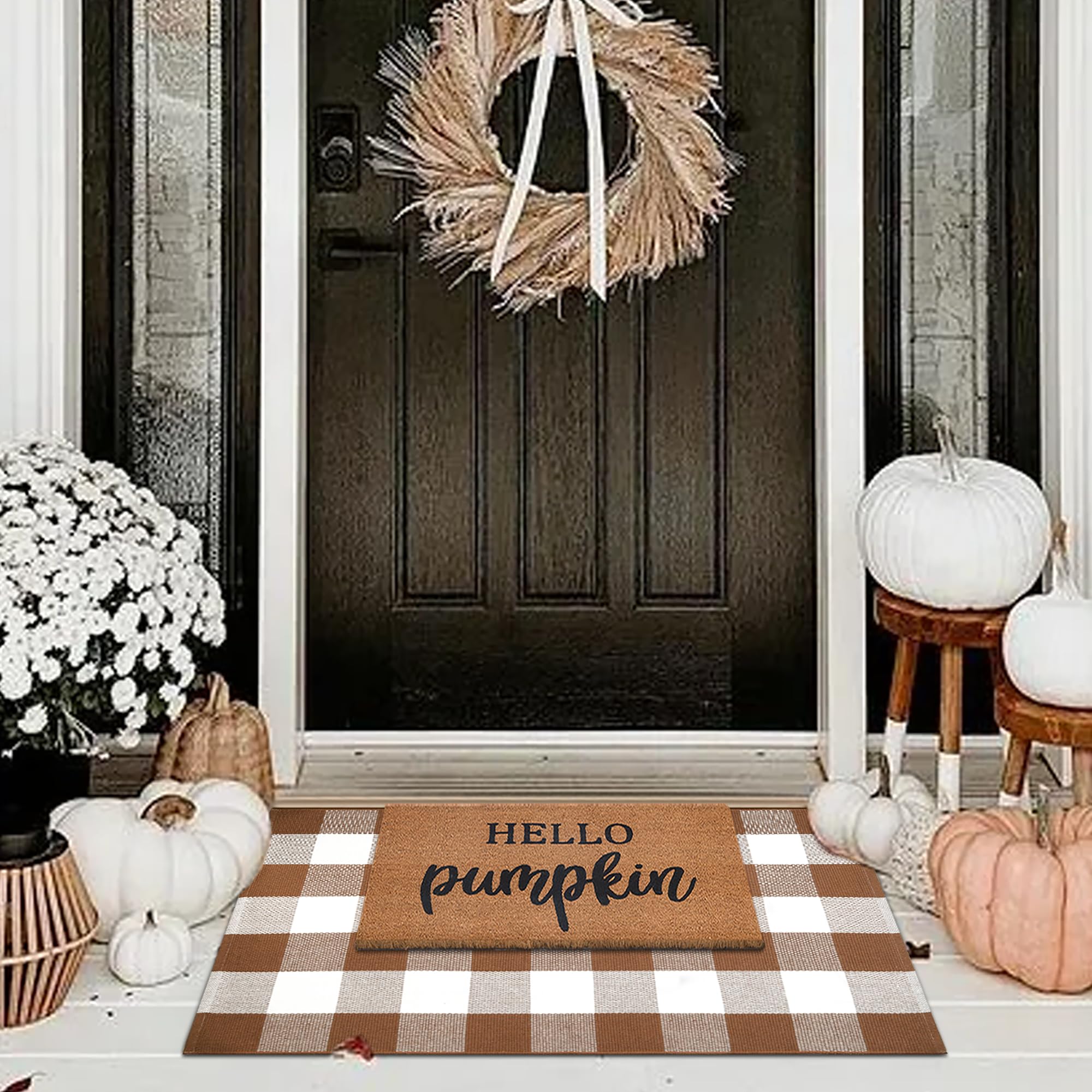 Enhance your home's style and functionality with our ideal decor set; It includes a 100% coco coir welcome mat and coffee white plaid outdoor rug, perfect for upgrading your front porch; Elevate your fall front porch with these versatile door mats