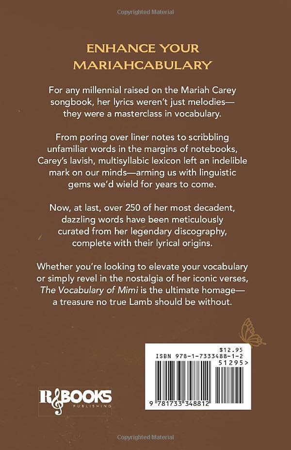 For any millennial raised on the Mariah Carey songbook, her lyrics weren’t just melodies—they were a masterclass in vocabulary. From poring over liner notes to scribbling unfamiliar words in the margins of notebooks, Carey’s lavish, multisyllabic lexicon left an indelible mark on our minds—arming us with linguistic gems we’d wield for years to come. Now, at last, over 250 of her most decadent, dazzling words have been meticulously curated from her legendary discography, complete with their lyrical origins. Whether you’re looking to elevate your vocabulary or simply revel in the nostalgia of her iconic verses, The Vocabulary of Mimi is the ultimate homage—a treasure no true Lamb should be without.