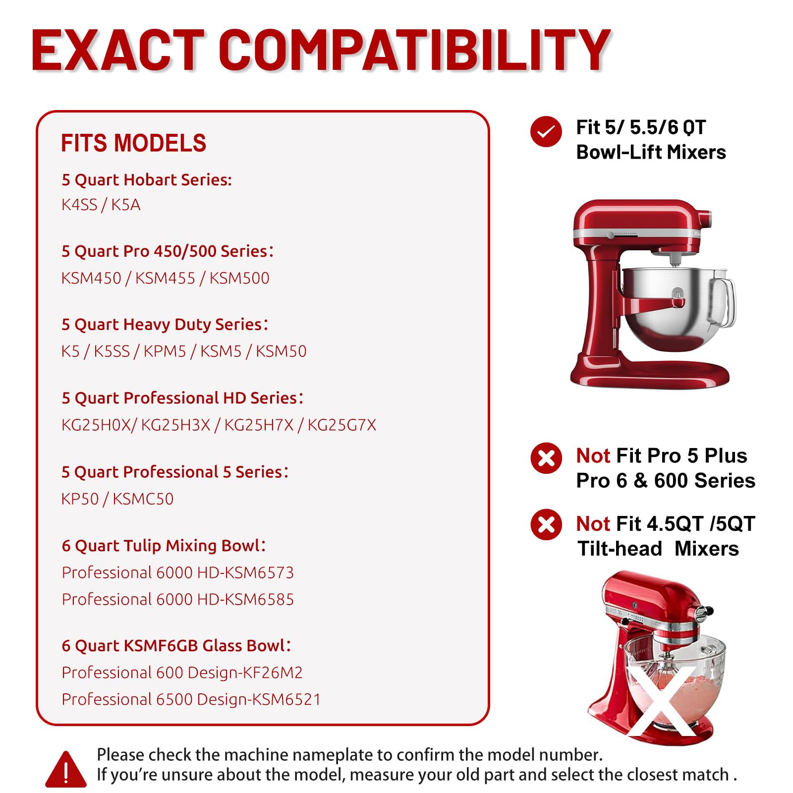 EXACT COMPATIBILITY: Designed for kitchenaid 5 Qt and 6 Qt bowl lift stand mixer, Fits KitchenAid mixer models K4SS, K5-A, KSM450 / KSM455, KSM500 / KSM550, K5 / K5SS, KP50, KSMC50, KMP5, KPM50, KSM5, KSM50, KG25H / KG25G, PROFESSIONAL 6000 HD KSM6573 (with a tulip mixing bowl), Pro 600 Desigh KF26M (with a glass bowl). not fit 4.5&5 QT tilt-head stand mixers.